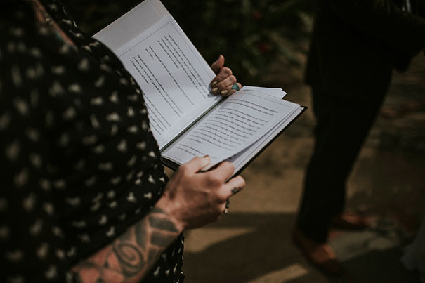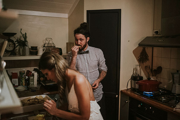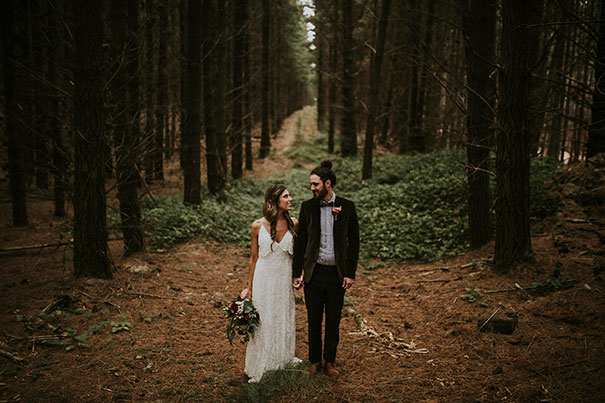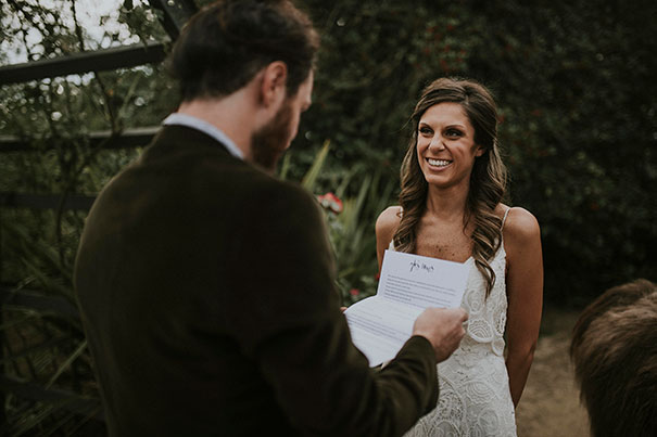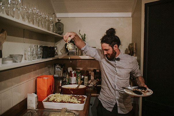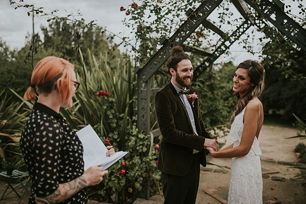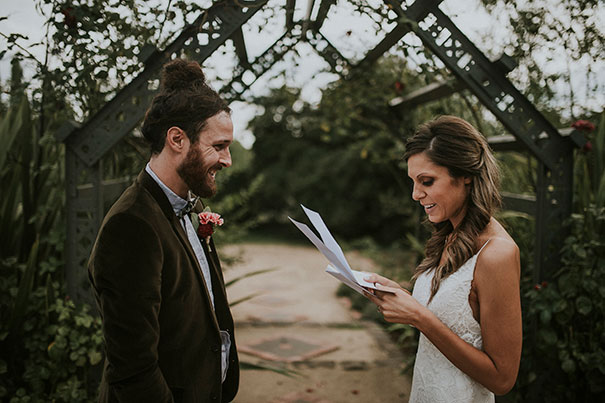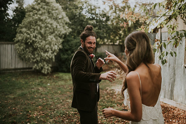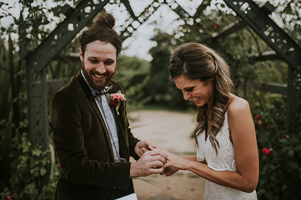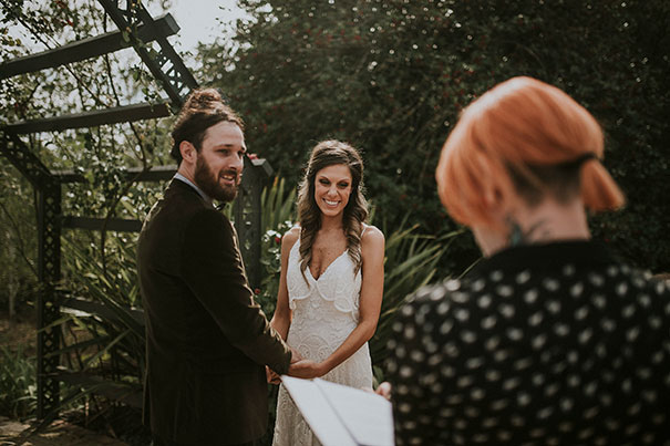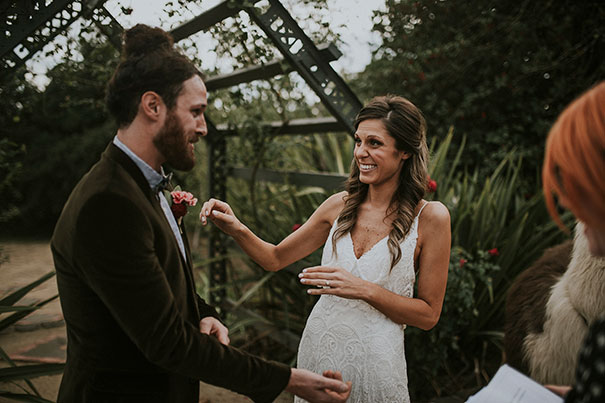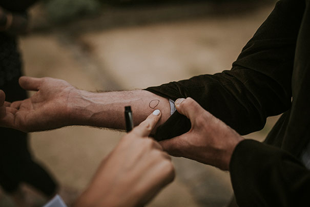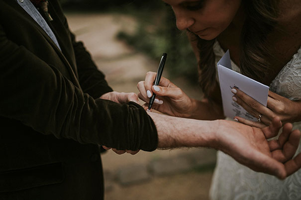The fun times and deviation from the norm didn’t stop there. For a duo as unique as this one, a typical wedding band for the groom just wouldn’t do. £Instead (mid ceremony) I drew a circle on Dan’s arm which he got tattooed the next day. When I was drawing the ring’, I said something along the lines of, gee, I better not stuff this up!’, at which point, I knocked the pen with my pinkie finger, resulting in me drawing a kidney bean on Dan’s arm instead of a circle. He got it tattooed exactly how I drew it, so it just sort of looks like he has an ode to jelly beans tattooed on his forearm. It was a funny moment, one which I feel eternally bad about. Sort of. Not really, jokes Em.
