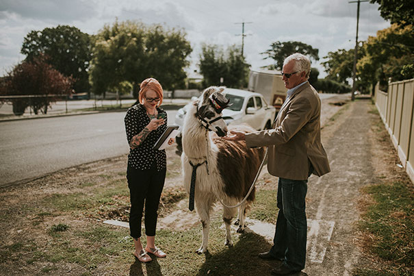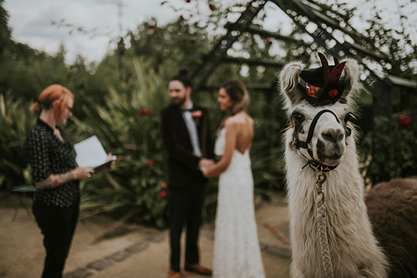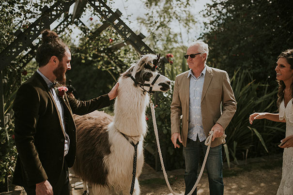 A non-negotiable for this pair’s elopement…? No, not those damn coloured smoke bombs (we were hankering for something a little different too). Instead, thanks to a £kind-of-cute-kind-of-concerning obsession with llamas, Em and Dan harboured a far-fetched fantasy to have one present as they tied the knot. £I contacted a local llama farm owner requesting the strange attendance of a llama at our wedding’. Thinking Mark (the llama owner) would quickly class me as a lunatic and block me from being able to send him any further emails, he replied very helpfully stating he’d love to be involved’. I tried to be cool, but in reality, I was fan-girling like a 13 year old at a Hanson concert circa 1997. And so, Mystery the llama donned a tophat and bow tie making him, without a doubt, the coolest, and probably also the furriest, ring bearer (and third wheel) of all time.