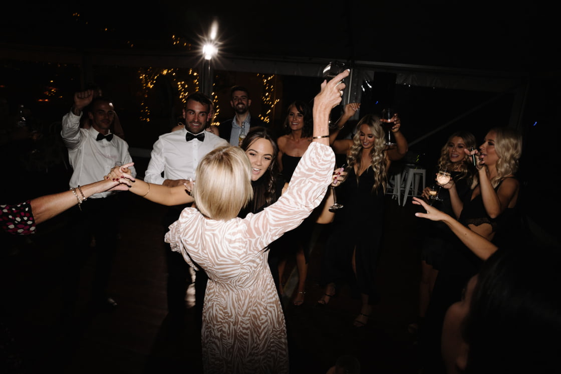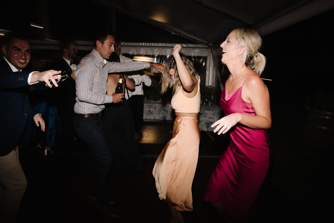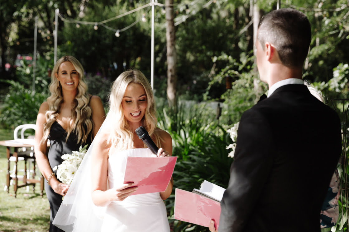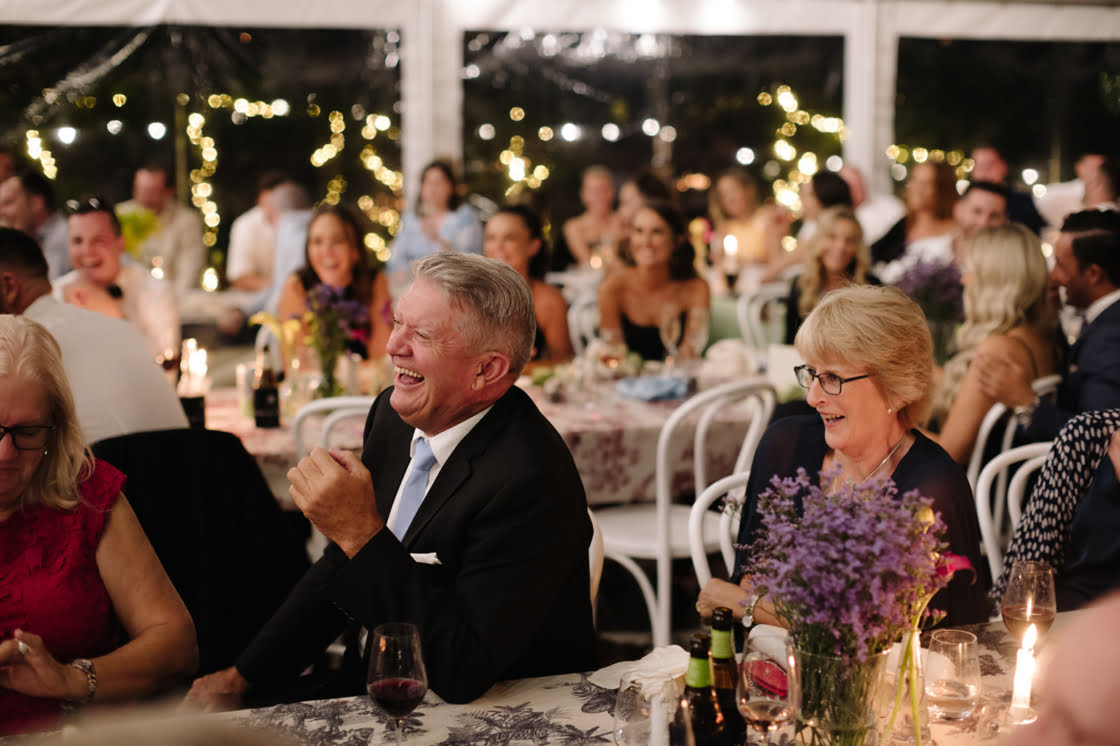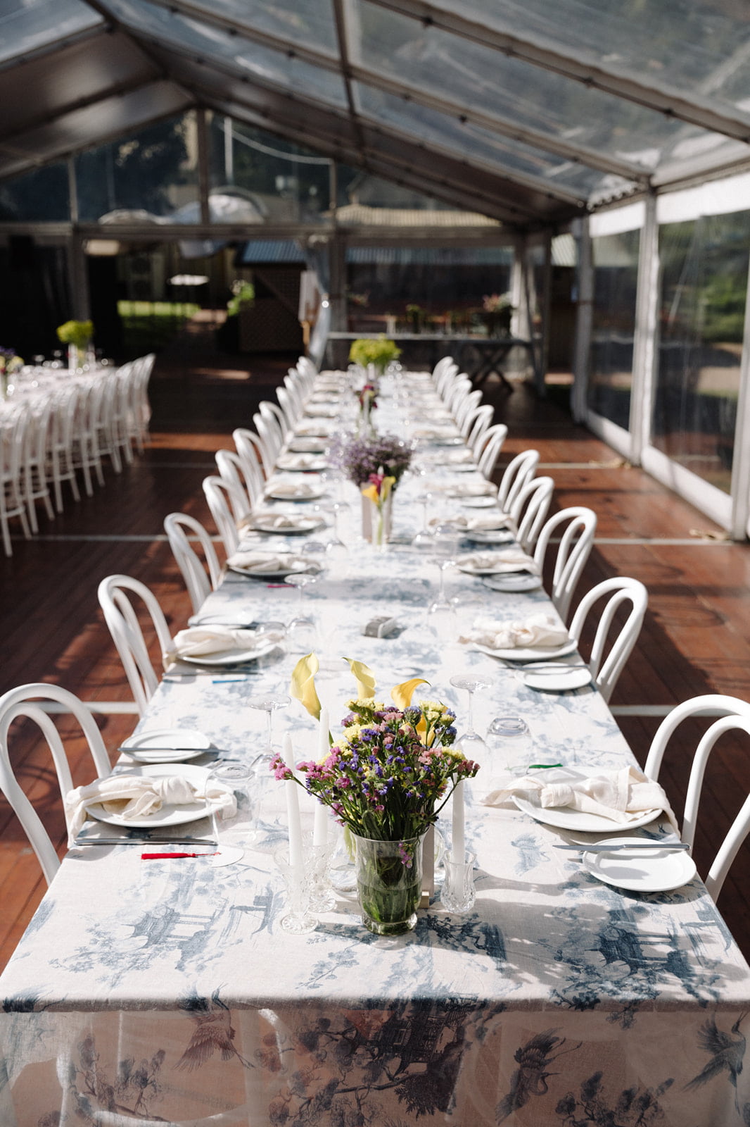 FAVE DETAILSI loved the cake [by Mint Cake & Patisserie]. I love that it was non-traditional and fun – it really reflects our personalities. I could be biased as I designed them but I did love our invitations as well. They were bright and fun – an orange daisy die-cut card with copper foil typography. The flowers – Michael, my sister Kate and I went to the flower markets a day before the wedding a selected them all. My beautiful bridesmaids and my mum helped me arrange the florals into mismatched glass vases (sourced by my op-shop loving Aunty) of different sizes. And the fabric for the tables – each table had a different coloured linen.”