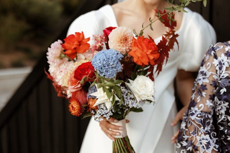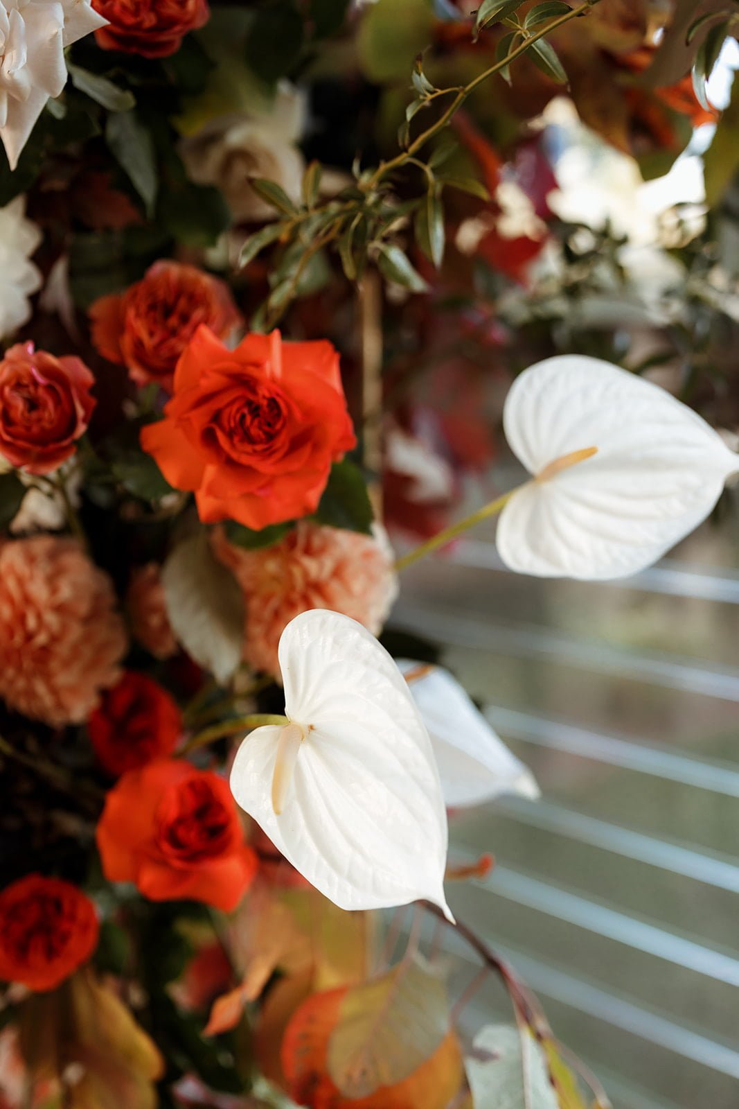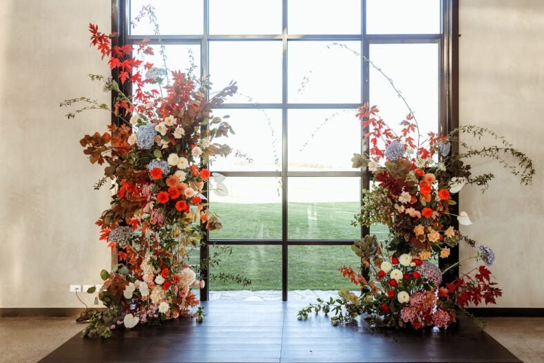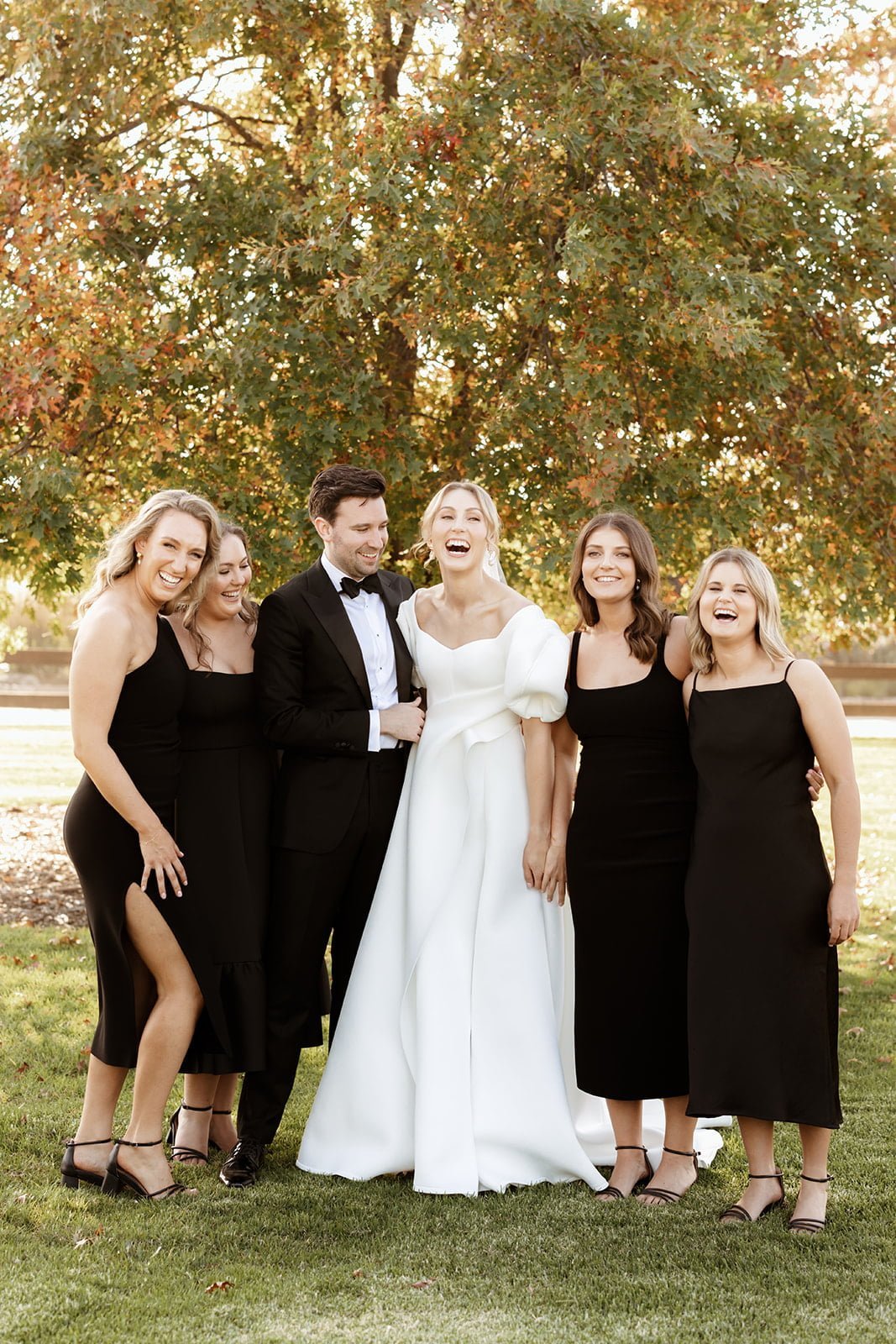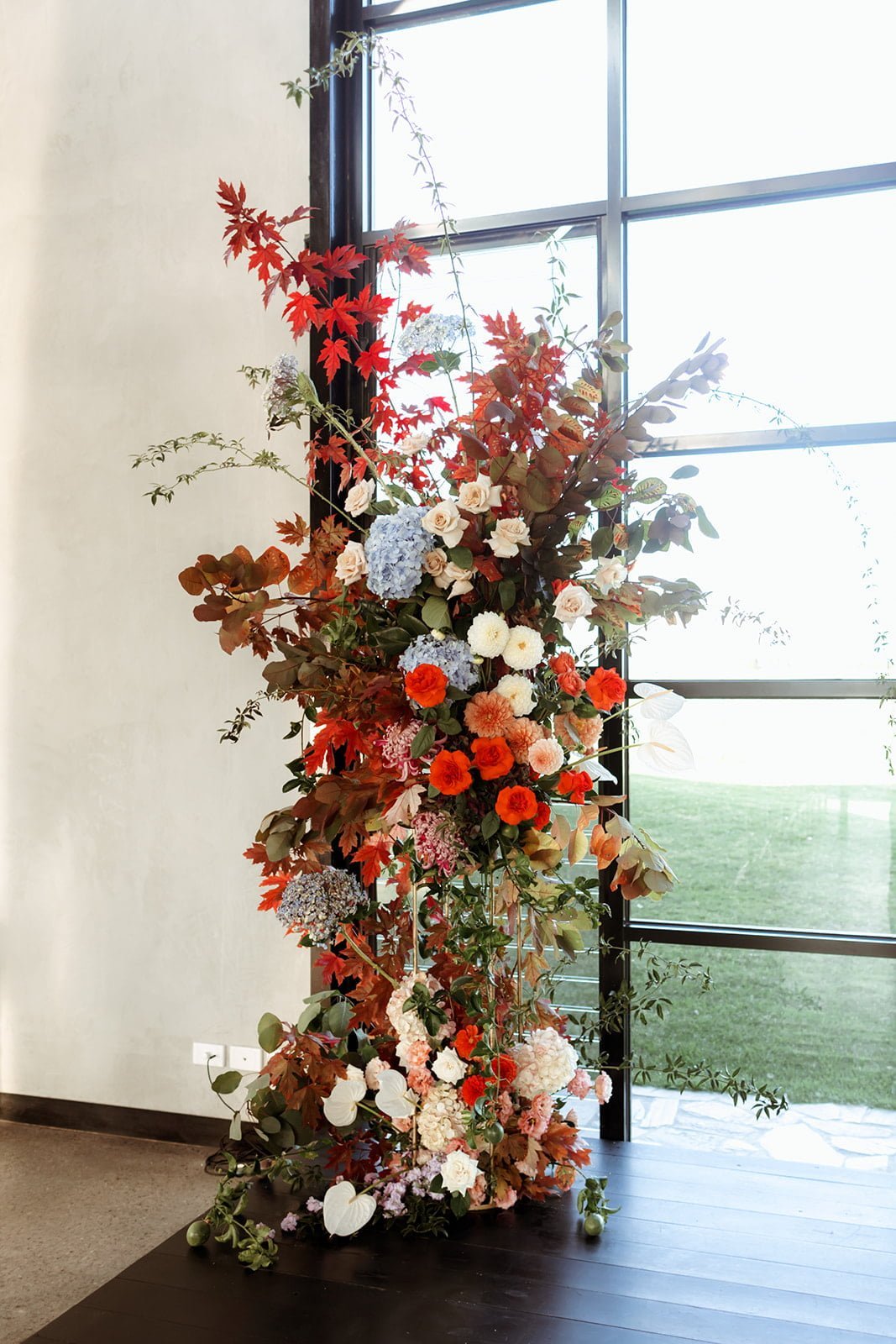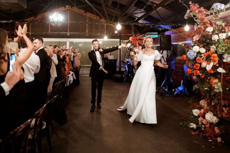 FAVE DEETS “Pomp & Splendour did our floral arrangements and walking down the aisle was one of my favourite moments of the day. We wanted a mix of bright florals and autumn foliage to juxtapose with my bridesmaids, who were in black. The arbour that had been set up in the Capella was incredible and it made the ceremony feels so bright and fresh.”