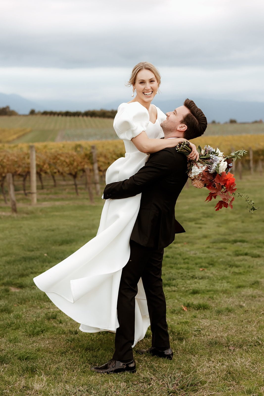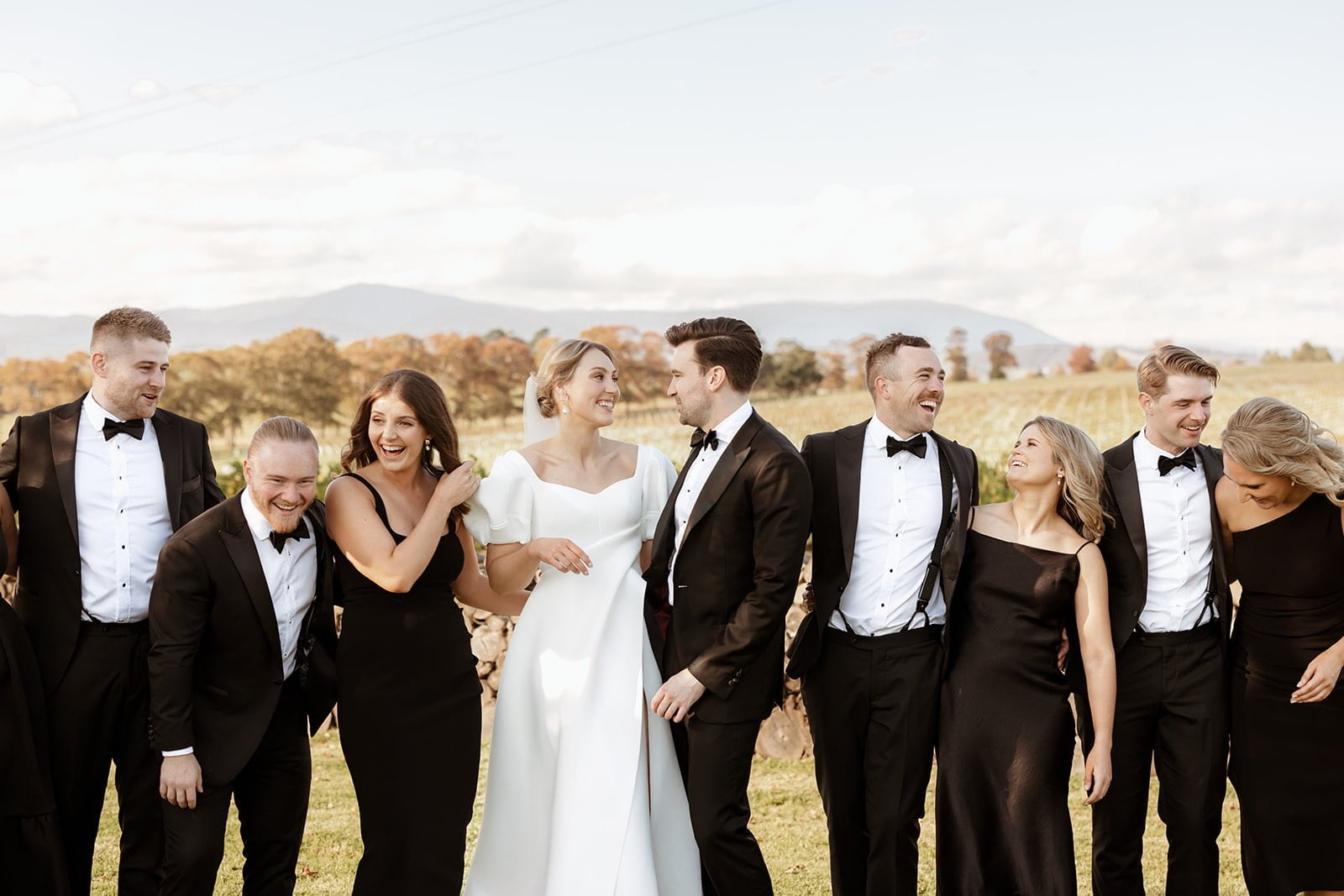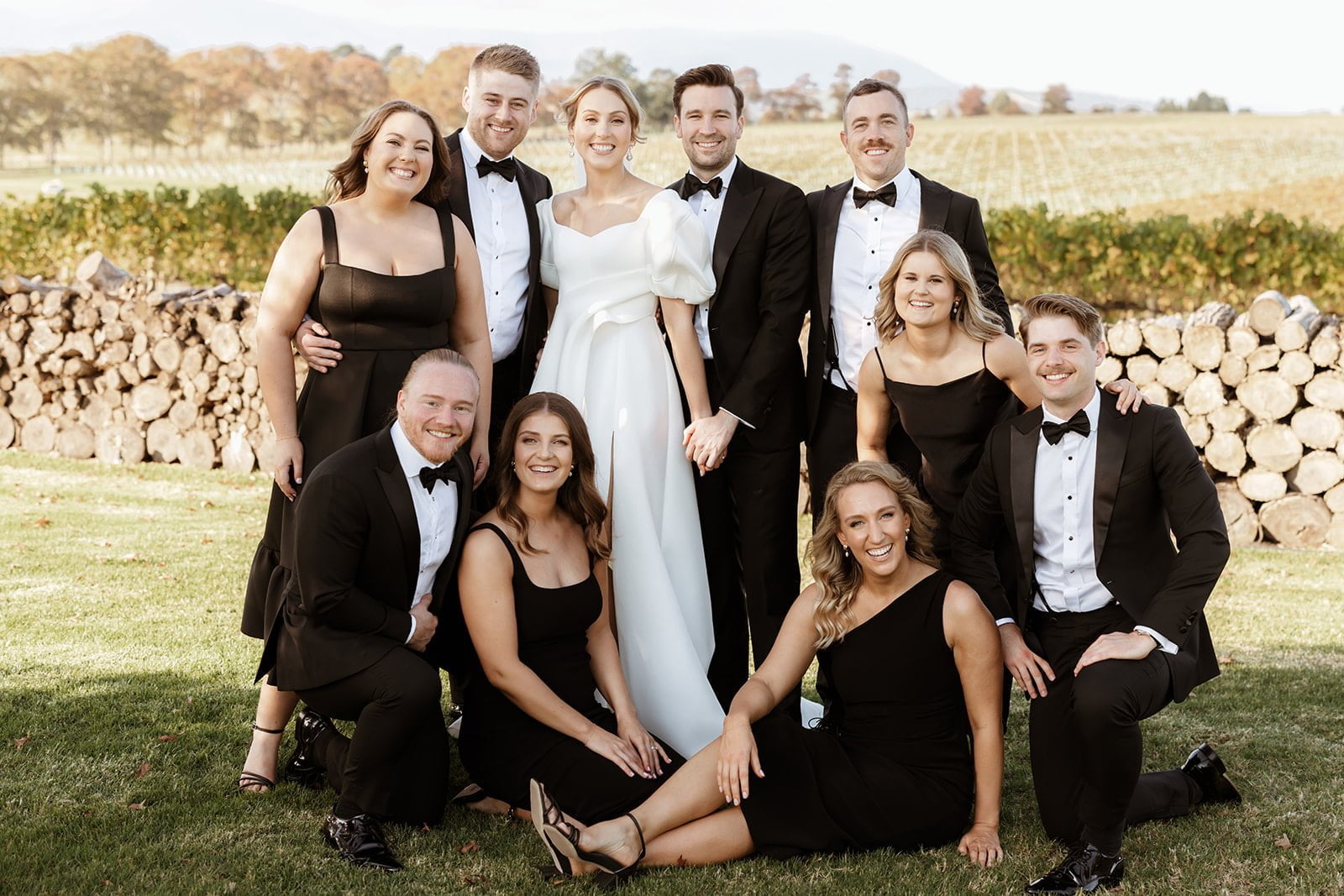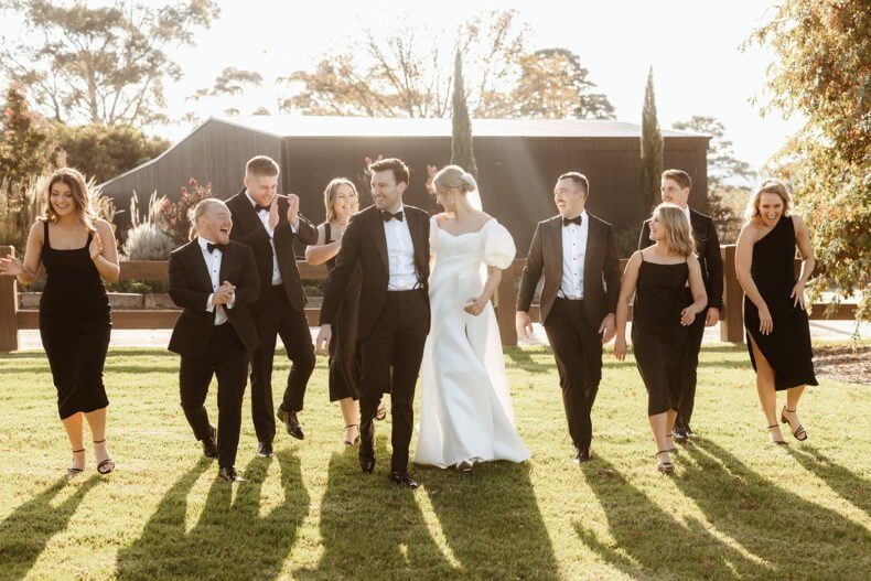 CONTRIBUTING VENDORS Photographer Nikki McCrone Florist Pomp & Splendour Stationery, signage & hire items State of Elliott Ceremony & reception venue Zonzo Estate Cake Fig & Salt Cake Topper Pomp & Splendour Lighting & sound hire Baker Boys Entertainment Baker Boys Band & DJ Emily Grace Celebrant Damon Hughes Rings Kavalri Transport Yarra Valley Transfers THE BRIDE Bridal gown designer Georgia Young Couture Robes Piyama Shoes Charles Keith, Veja Campo Accessories Christie Nicolaides, Finer Rings Hair & makeup Megan Harrison Bridesmaid dresses Bec + Bridge, Rachel Gilbert Bridesmaid shoes Bared Footwear THE GROOM Suit & shirt Institchu Suspenders & tie Declic Cufflinks Hugo Boss Shoes Aquila Barber Kings Domain Groomsmen suits YSG Tailors