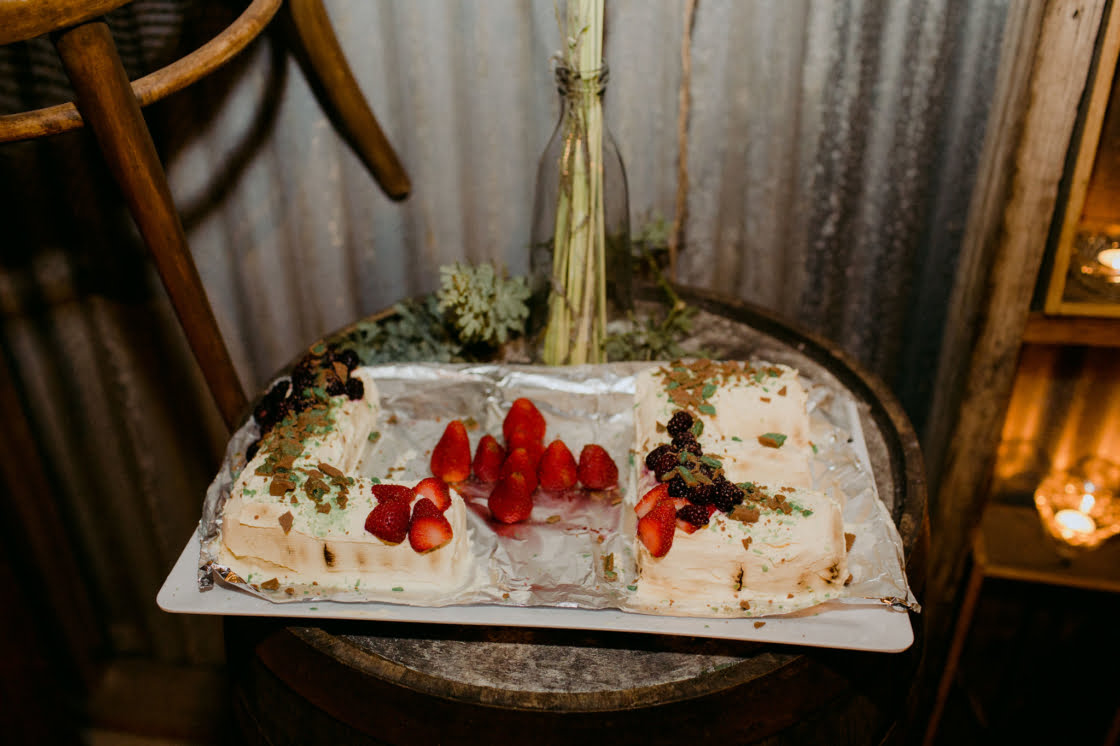 FAVE DETAILS “One of my bridesmaids, Kirby Burgess, surprised us and the rest of the bridal party on the set-up day with overalls that she had designed and made. The girls all arrived on the morning of the set-up wearing them and ready to be put to work. The cake by two of our bridesmaids was an absolute hit. The favours – instead of sending everyone home with bag of nuts or engraved candle, we gave everyone a bingo card and made them compete for a grand prize hamper filled with locally sourced produce. Our close friend who MC’d did an incredible job with hilarious bingo calls throughout the night. Etta’s cart AKA the ‘Yas Wagon’ – our daughter was one when we got married, and in the lead up we were pretty sure she wouldn’t be walking yet (or at least not down an aisle with any sort of reliability). So I made a cart for her to ride down, with the word ‘YAS’ on the front.”
