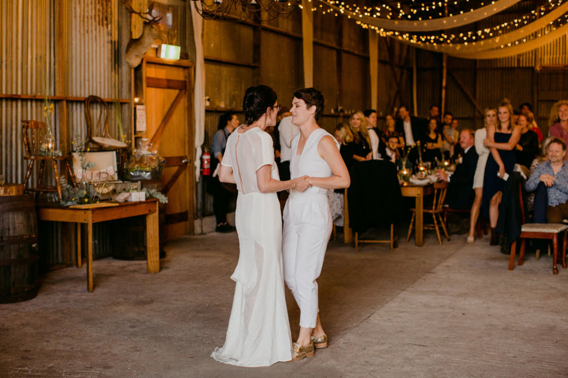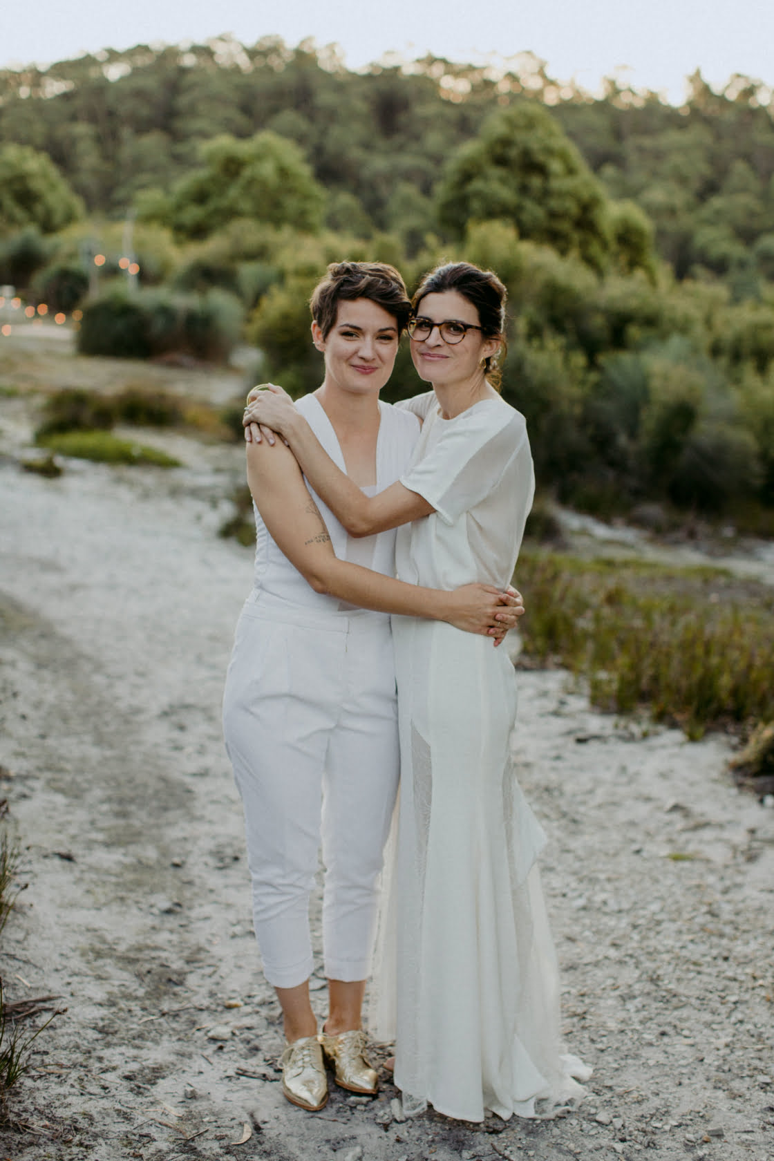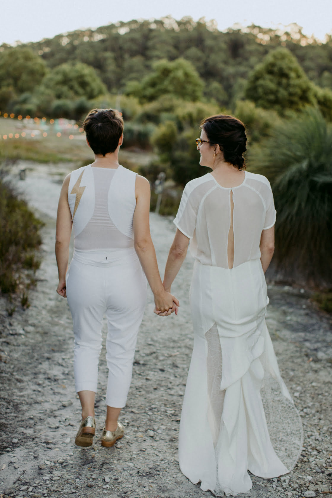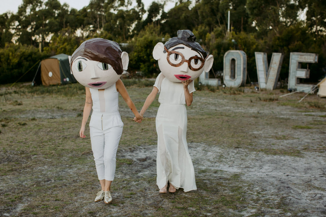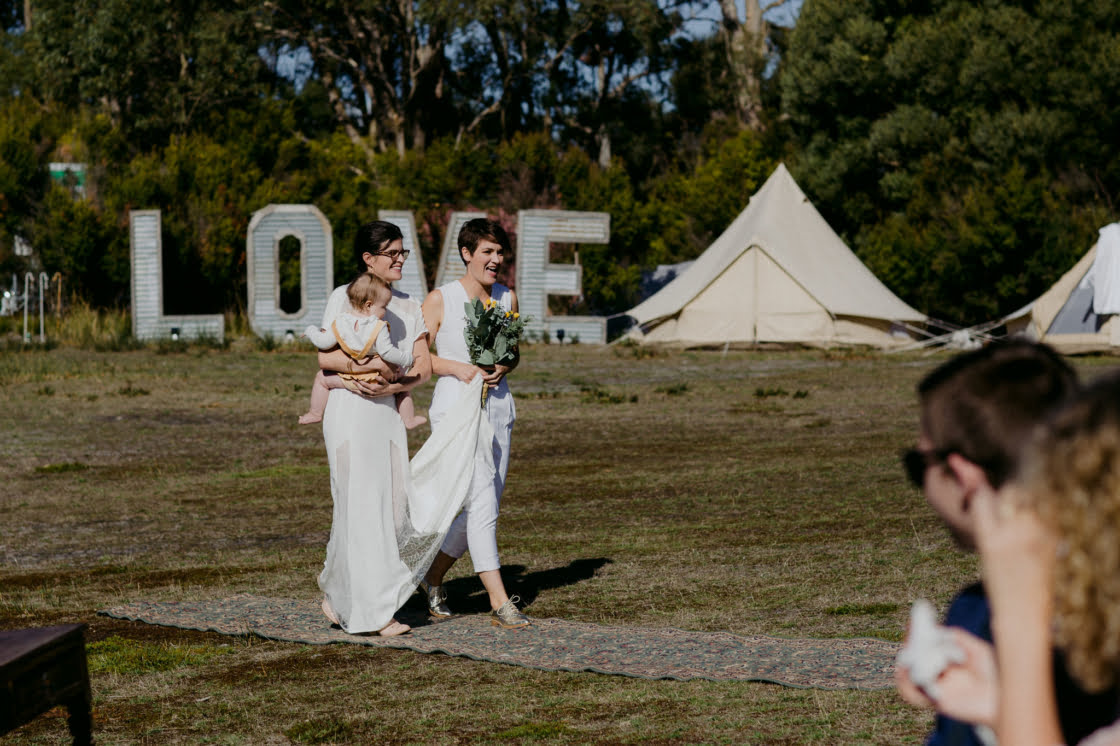 Lovely ladies Erin and Loretta were engaged for two and a half years whilst waiting for the Australian Government to “get their act together” and pass marriage equality so you best believe the pair made up for lost time by organising one heck of a wedfest weekend, yurt and all, to celebrate their long-awaited nuptials. They also had their one-year-old daughter ride down the aisle on a cart that they coined the ‘YAS wagon’ and danced into the reception wearing paper mâché heads of themselves… Intrigued? Of course you are. Scroll down for all the details, their great advice and pics by Amanda Alessi Photography…