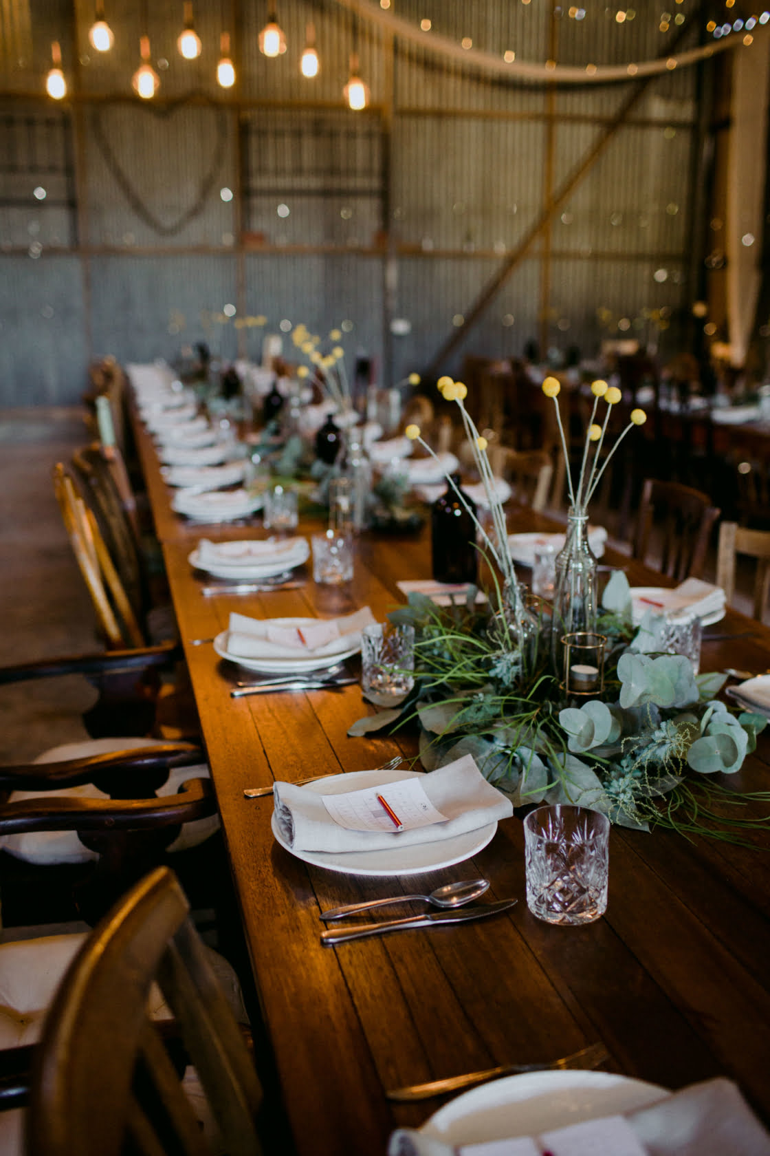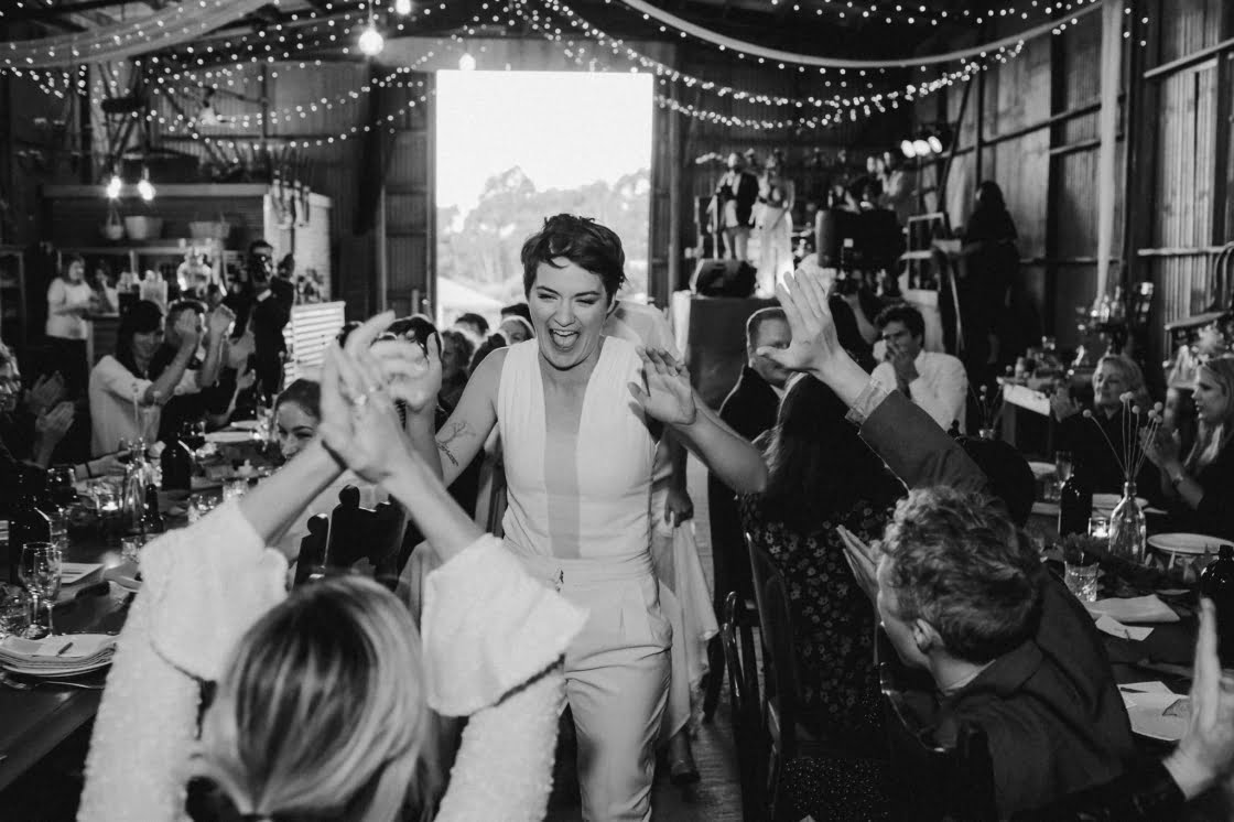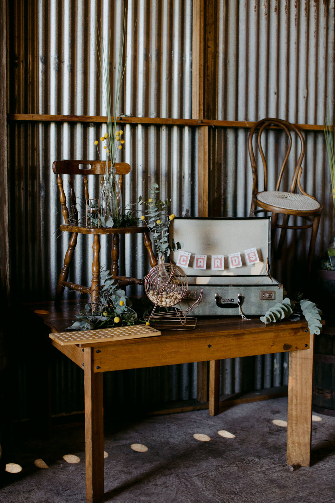 FAVE DETAILS “One of my bridesmaids, Kirby Burgess, surprised us and the rest of the bridal party on the set-up day with overalls that she had designed and made. The girls all arrived on the morning of the set-up wearing them and ready to be put to work. The cake by two of our bridesmaids was an absolute hit. The favours – instead of sending everyone home with bag of nuts or engraved candle, we gave everyone a bingo card and made them compete for a grand prize hamper filled with locally sourced produce. Our close friend who MC’d did an incredible job with hilarious bingo calls throughout the night. Etta’s cart AKA the ‘Yas Wagon’ – our daughter was one when we got married, and in the lead up we were pretty sure she wouldn’t be walking yet (or at least not down an aisle with any sort of reliability). So I made a cart for her to ride down, with the word ‘YAS’ on the front.”
