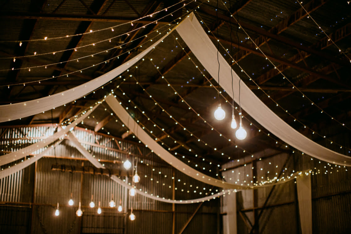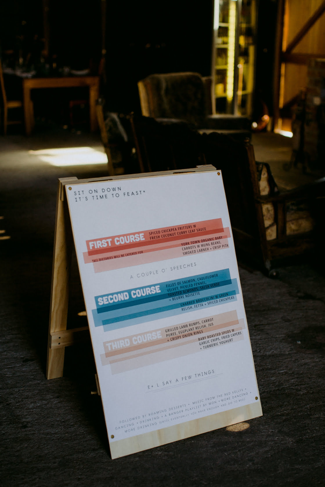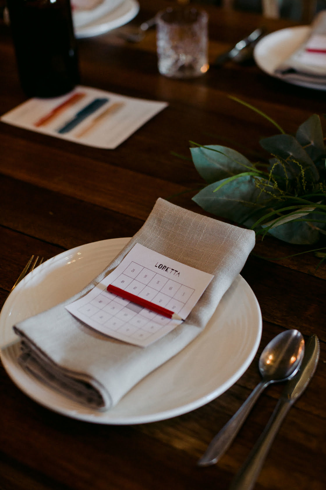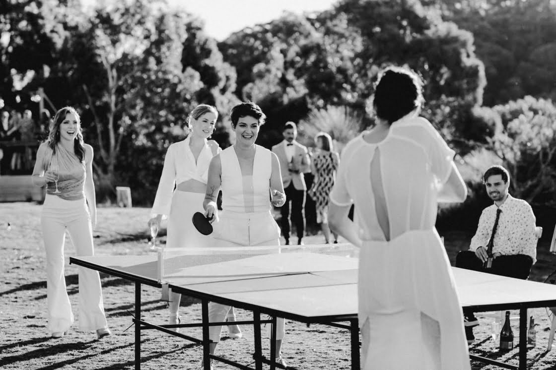 FAVE DETAILS “One of my bridesmaids, Kirby Burgess, surprised us and the rest of the bridal party on the set-up day with overalls that she had designed and made. The girls all arrived on the morning of the set-up wearing them and ready to be put to work. The cake by two of our bridesmaids was an absolute hit. The favours – instead of sending everyone home with bag of nuts or engraved candle, we gave everyone a bingo card and made them compete for a grand prize hamper filled with locally sourced produce. Our close friend who MC’d did an incredible job with hilarious bingo calls throughout the night. Etta’s cart AKA the ‘Yas Wagon’ – our daughter was one when we got married, and in the lead up we were pretty sure she wouldn’t be walking yet (or at least not down an aisle with any sort of reliability). So I made a cart for her to ride down, with the word ‘YAS’ on the front.”