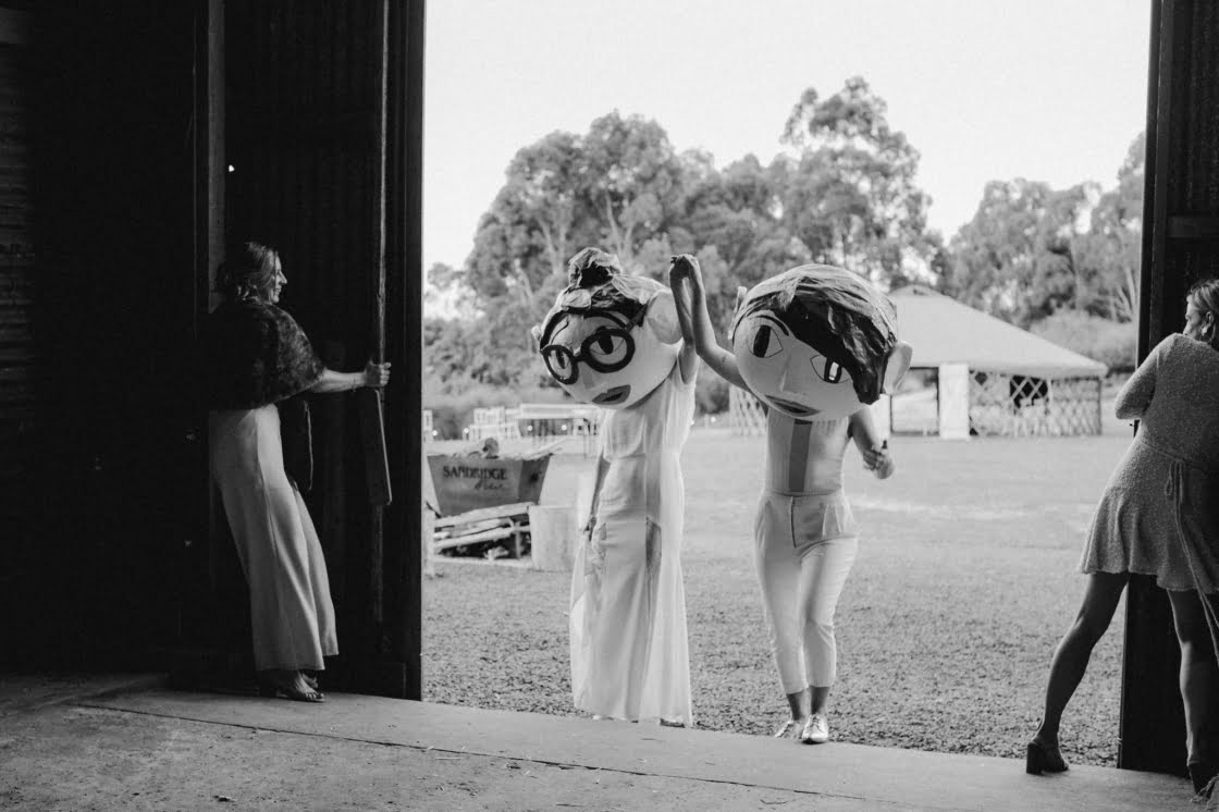 MEMORABLE MOMENT “It’s a dead heat between two of our mates getting up on stage with the band and surprising us with a rendition of John Farnham’s ‘You’re the Voice’ (Loretta’s favourite wedding song of all time), which resulted in a massive sing/ shout along and entering the shed and doing out first dance wearing our massive paper mâché heads, singing ‘Nothing’s Gonna Stop Us Now.’ We were a little apprehensive about having everyone look at us when we walked in and did our first dance, so we disguised ourselves as ourselves.”