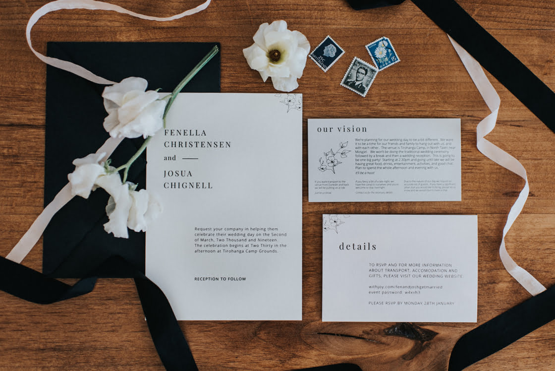 CONTRIBUTING VENDORS Photographer Jonnie and Garrett Cinematographer Cloud Herd Film Co Florist RocknRosie Stationery & Signage DIY (The Bride) Printer Speedprint Ceremony & Reception Tirohanga Camp Catering & Cake Precinct Food Wedding Favours Sketch & Etch Hire Items, Marquee & Lighting Four Folk Sound Hire Gravity Events Entertainment Logan and Yuen (Ceremony/ Friends) & Judah Kelly Celebrant Olivia Dawson (Friend) Rings Brent Weatherall Jewellers Linen Hire Drape Linen THE BRIDE Bridal Gown & Veil Emmy Mae Bridal Bridal Boutique Bluebelle Bridal Pyjamas Homebodii Shoes Chaos & Harmony Earrings Grace Loves Lace Hair KP Bridal Hair Makeup Makeup by Kim Tuliau-Moeroa Bridesmaid Dresses Shona Joy THE GROOM Suit, Shirt, Tie & Shoes Barkers Groomsmen Suits Barkers