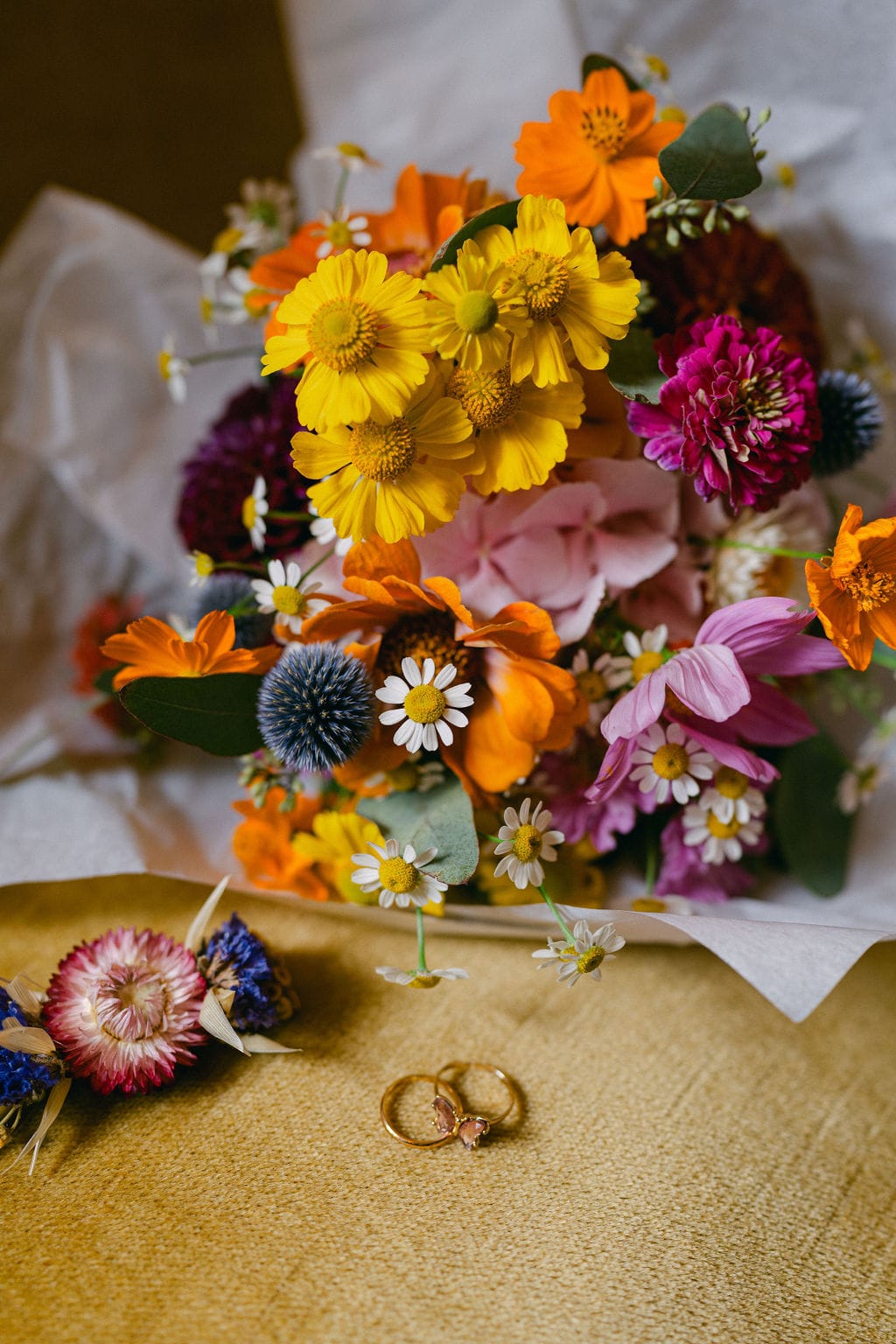 DIY “Both of us enjoy greatly DIY projects, so we did all the flower arrangements from different flowers that we had in Marie’s parents’ garden. We did all the signage for the wedding, and it even started with the invites that were homemade and printed in risography to get the flashy colours that we wanted.”