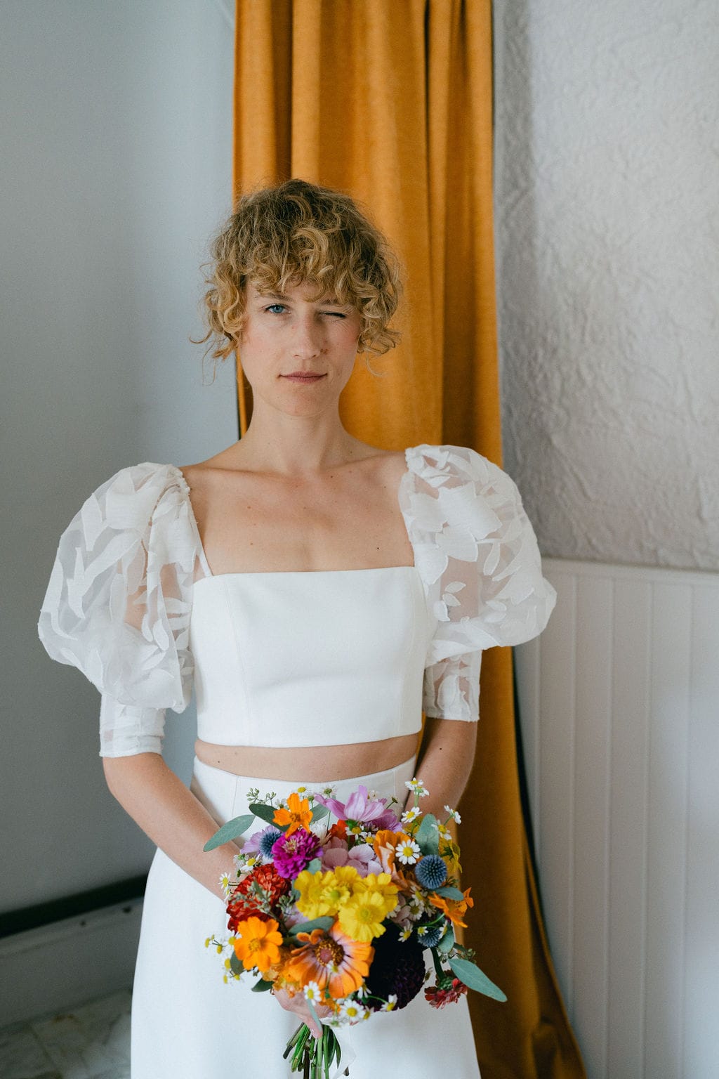 BRIDAL ‘FIT “Choosing the outfit was a bit of a challenge because I wasn’t really sure what I was looking for. One day, I discovered Amarildine, and while roaming through their catalogue, I saw an outfit composed of high-waisted pants and a crop top and it came to me so obviously that it was what I was looking for since the beginning – an outfit not too different in style to my daily clothing but with an extra twist. With my eye on the prize, I went to their showroom and tried out the combo, and it fit like a glove. My decision was made; I was gonna be married in pants.”