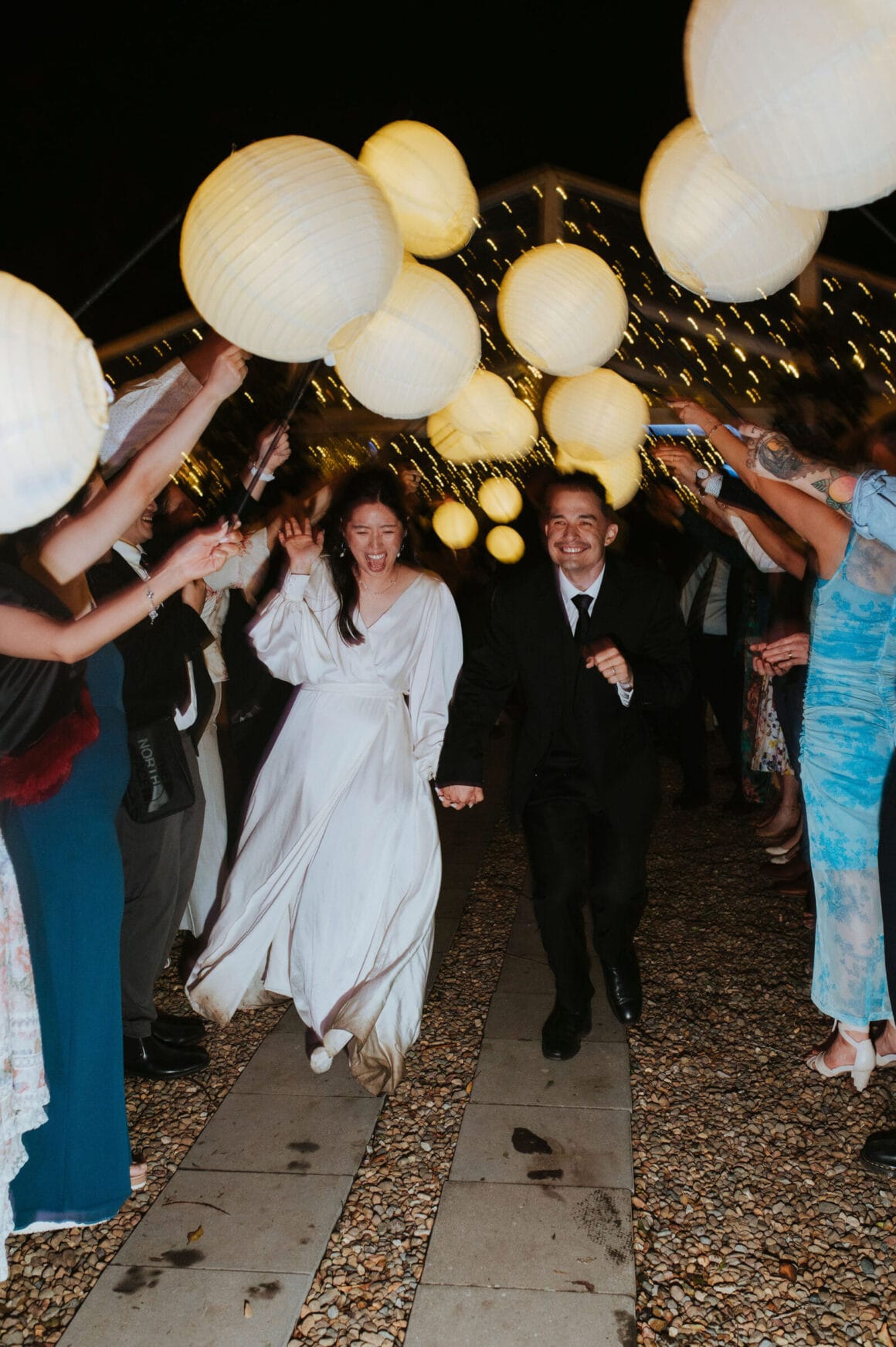 MEMORABLE MOMENT “We decided to do a first look and share private vows on the deck of the cottage where we were getting ready. The scenic view from the cottage was incredible, and it was such a special moment to relax together before the ceremony. I loved meeting everyone for the first time as they began arriving before the ceremony. It was amazing seeing everyone all dressed up and meeting family who had travelled from interstate and overseas. Later, as the night grew darker, we had our lantern exit, which turned out perfectly. The paper lanterns looked stunning in the dark, with the marquee and the big fig tree in the background. The games were a huge hit, too – everyone was laughing and having a blast. It was honestly so great seeing all our friends and family having such a fun time together.”