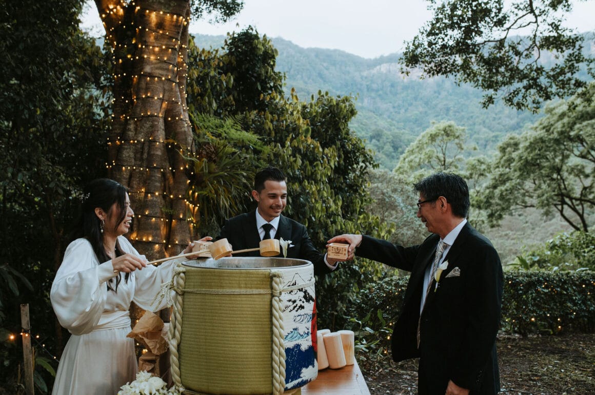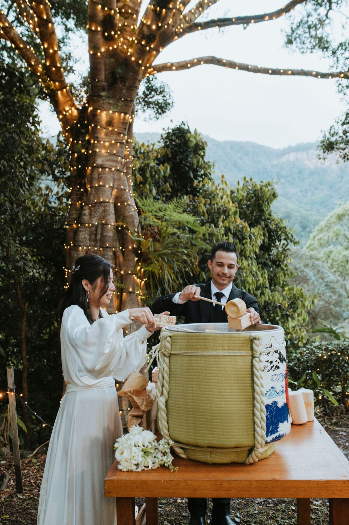 COOL CUSTOM “We incorporated a beautiful Japanese tradition into our day – the sake barrel-breaking ceremony, known as ‘Kagami Biraki.’ This tradition symbolises harmony and marks the beginning of a joyful journey for the couple. As a newly married couple, we broke open the sake barrel, representing the start of a future filled with happiness and prosperity. Once the lid was off, we served sake to all our guests by scooping from the 72L barrel and filling traditional wooden sake cups, which they were able to keep as a memento of the day.”