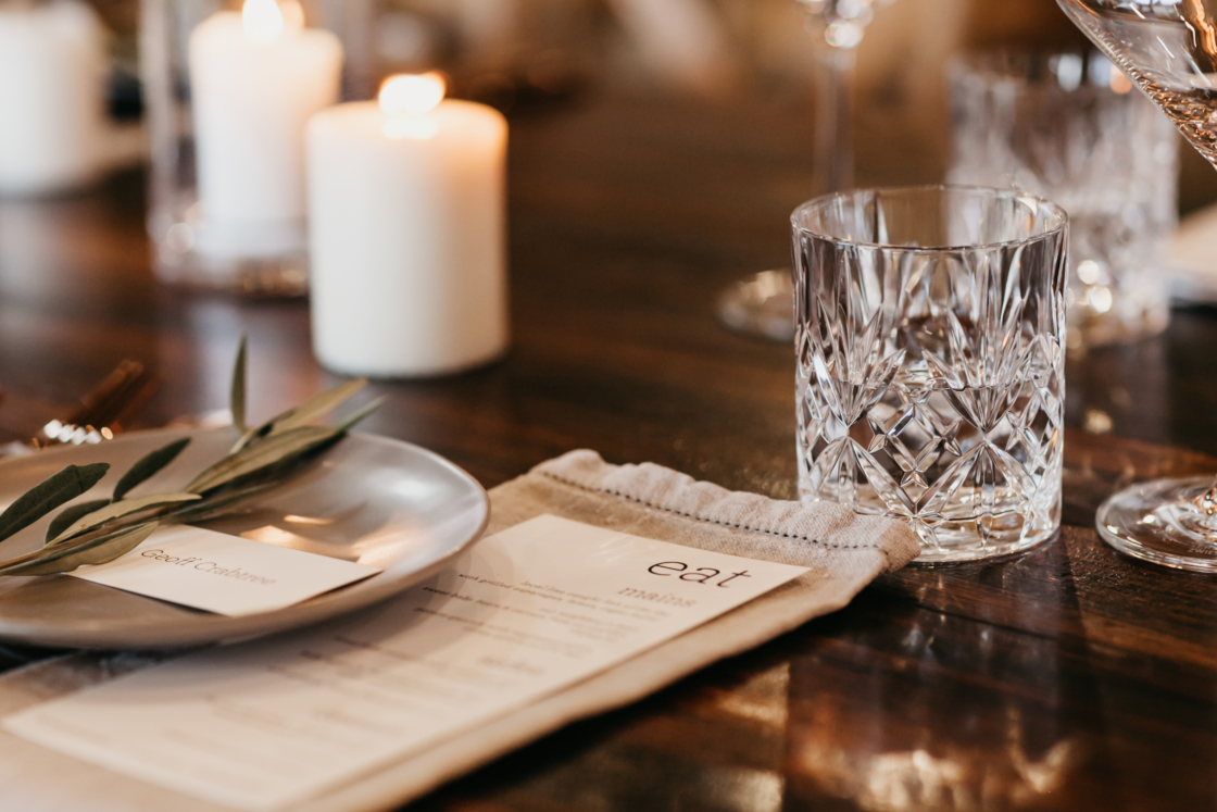 THE THEME “We wanted the wedding to feel modern and more editorial than traditional. We used the same font throughout the whole wedding, and copper, black and neutral tones in the signage and table setting. With the flowers (by The French Petalwe wanted earthy tones to match the venue, so kept to whites and greens with an olive twig on each plate and created a romantic feel with candles everywhere. I hired all the candles available from the hire companies in Byron, so I had to start sourcing my own. I ended up with 160 in around eight different sizes and we used each and everyone on the day.”