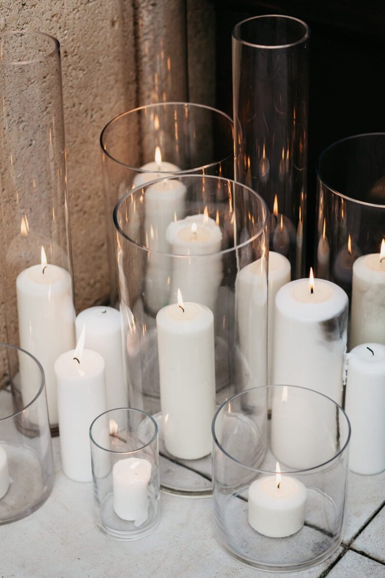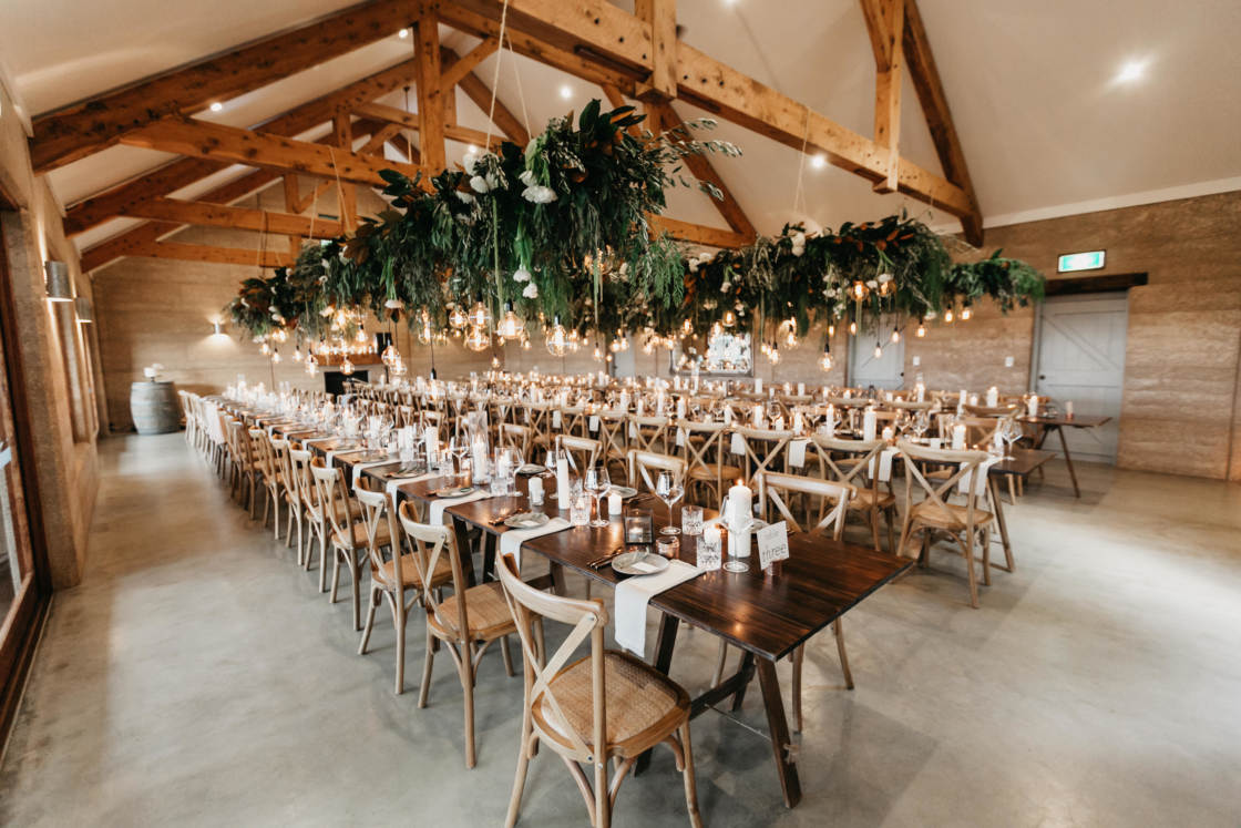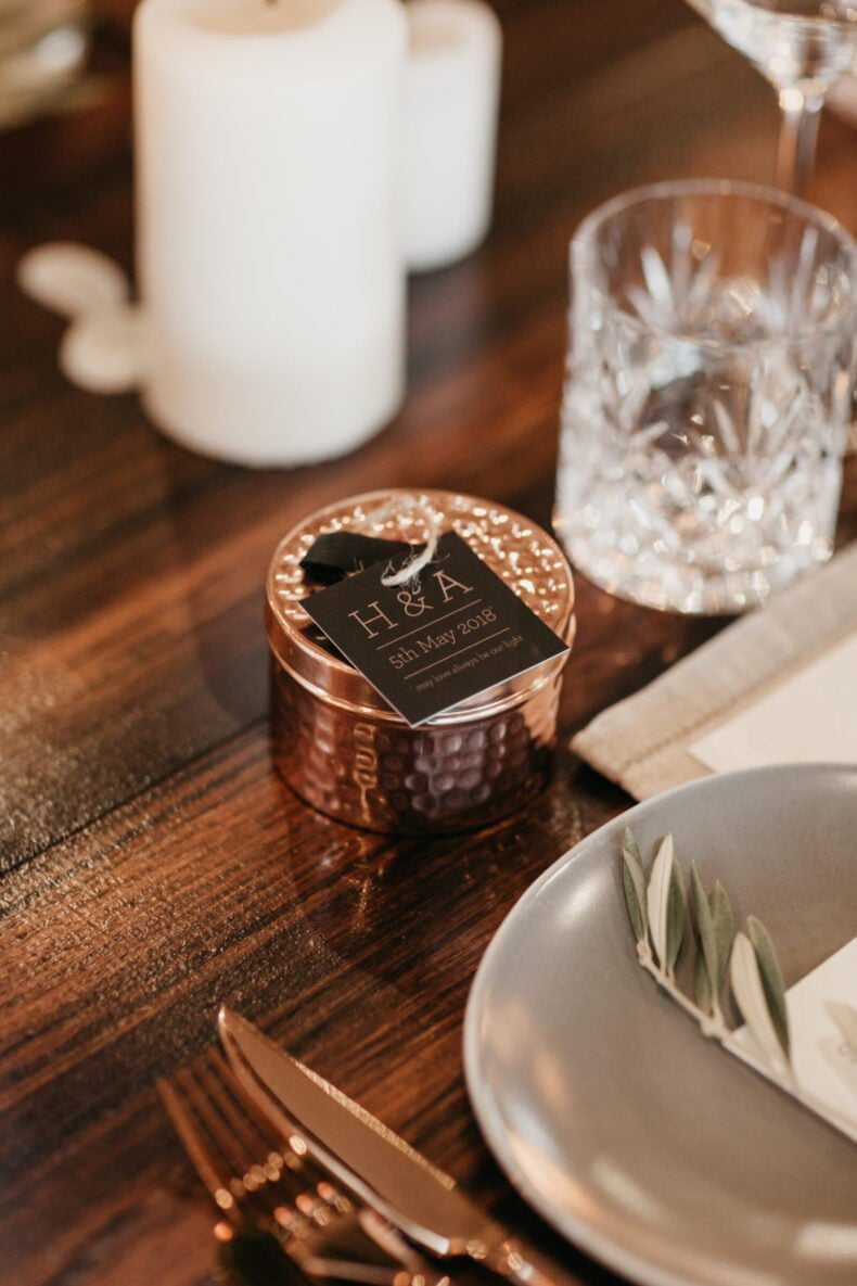 THE THEME “We wanted the wedding to feel modern and more editorial than traditional. We used the same font throughout the whole wedding, and copper, black and neutral tones in the signage and table setting. With the flowers (by The French Petalwe wanted earthy tones to match the venue, so kept to whites and greens with an olive twig on each plate and created a romantic feel with candles everywhere. I hired all the candles available from the hire companies in Byron, so I had to start sourcing my own. I ended up with 160 in around eight different sizes and we used each and everyone on the day.”