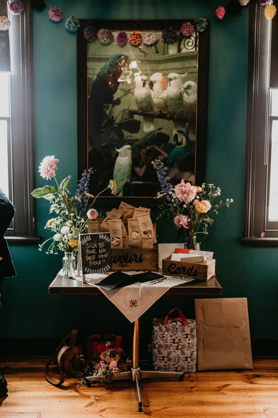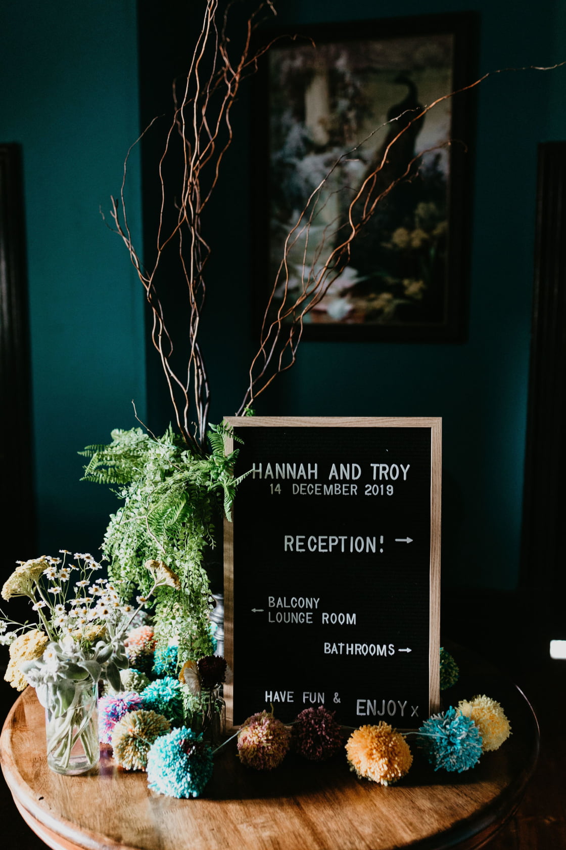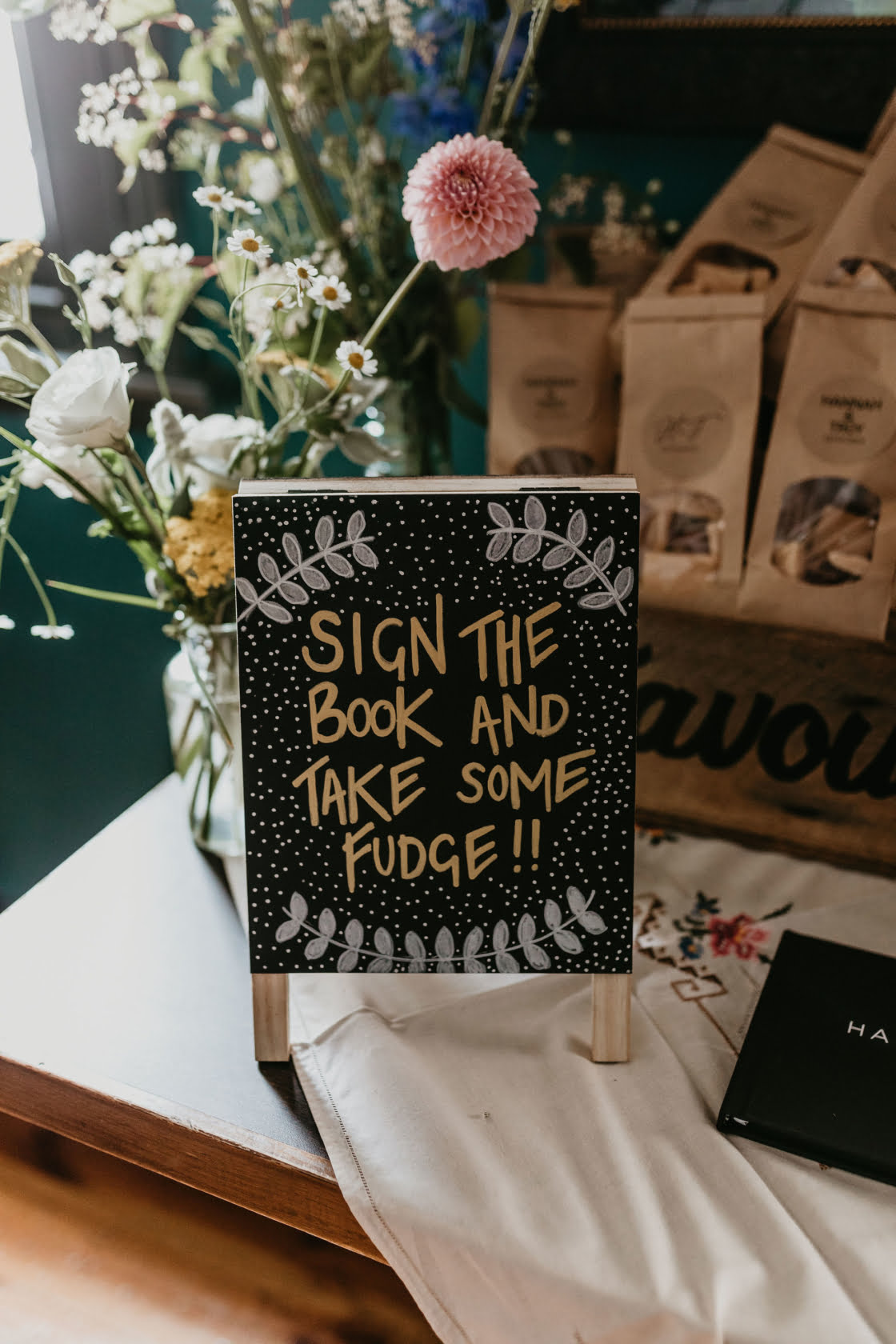 DIY “Lots of DIY! Throughout the year, we had multiple family members making pompoms. Hannah’s sister Rachel did an amazing job of being our DIY maestro, stringing hundreds of pompoms together to make garlands and doing chalkboard sign writing. Rachel’s husband, David, also did all of our graphic design. Our fudge wedding favours were all made and bagged at home by Hannah and Hannah’s dad, Mark, also made us an epic arch for the ceremony.”