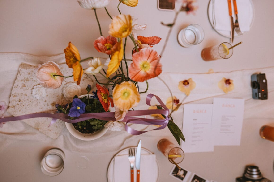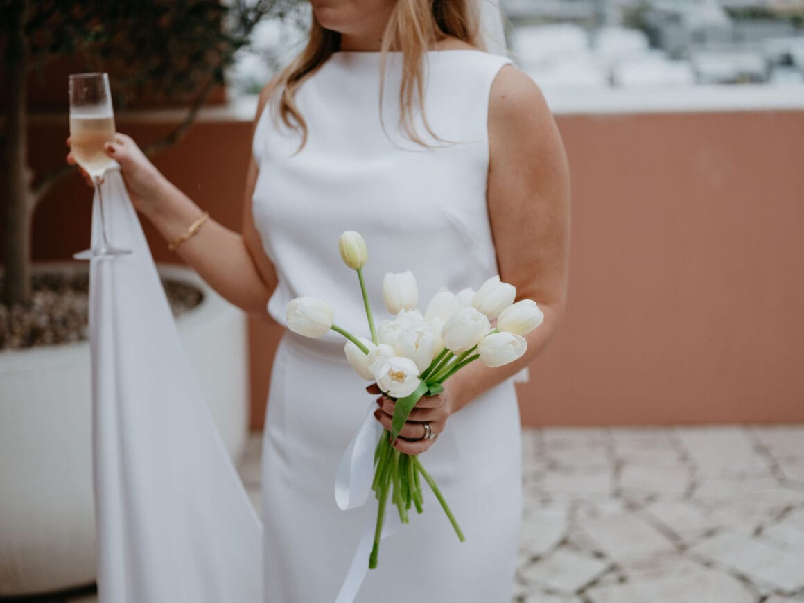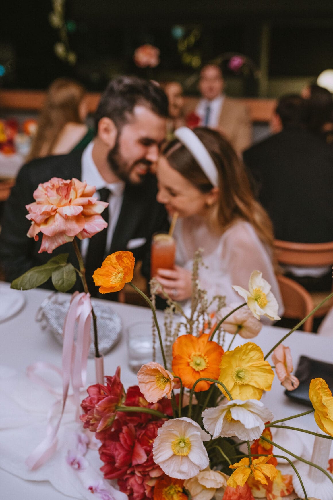 FAVE DETAILS “The florals and dinner styling were by far our favourite details. We had originally planned to do florals ourselves, but as the day got closer, we quickly realised it wasn’t as straightforward as we would have liked. By coincidence, I stumbled across an Instagram post where Fronta Floral has styled the private dining at Biànca, where our reception was. [It was two] weeks before the wedding, and we knew we needed to ditch our DIY plan and reach out . It was a Sunday morning and Davina responded to me within minutes. We let Davina take full creative license, which meant the styling was a complete surprise for everyone, including us!.”