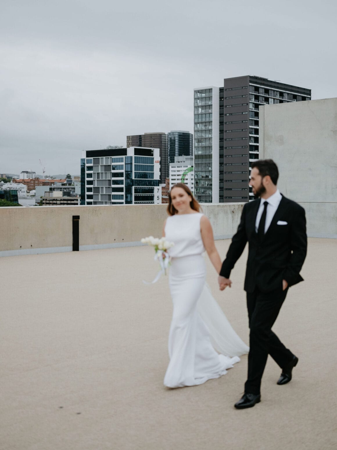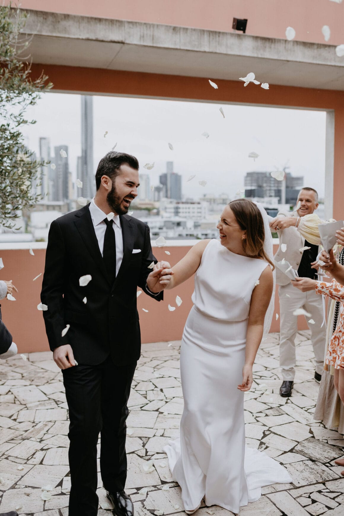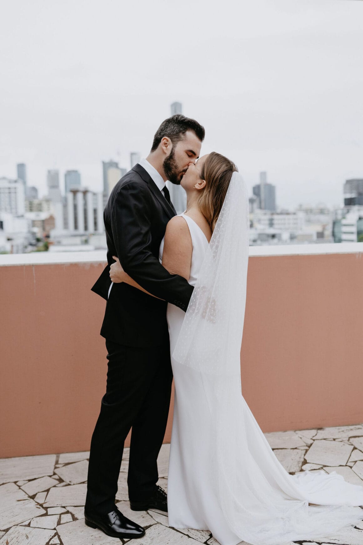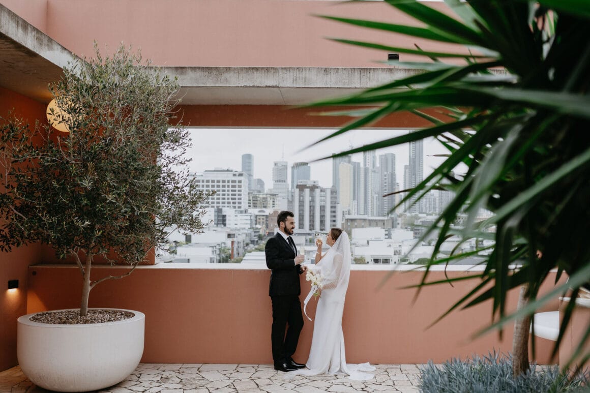 THE VENUE “Our wedding venue choice came about [due to] a last-minute attempt to move the wedding to Queensland. The Calile felt like the perfect venue for the wedding we wanted, and we couldn’t be happier with how it all worked out. Its modern, minimalist aesthetic was perfect for us. We felt as though we could lean into the hotel’s style and keep everything else stripped back. The Calile Suite also offered the perfect space for our group. The private rooftop terrace was intimate, yet open and airy as it overlooked the city, and being a winter wedding, we all got to retreat to the suite for champagne and canapés before dinner.”