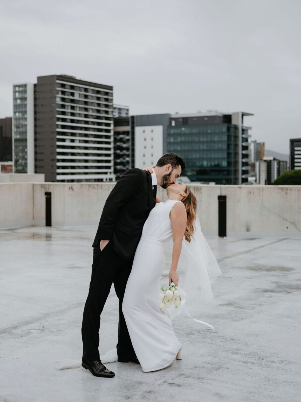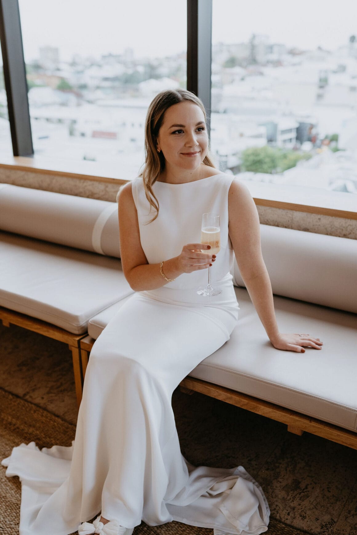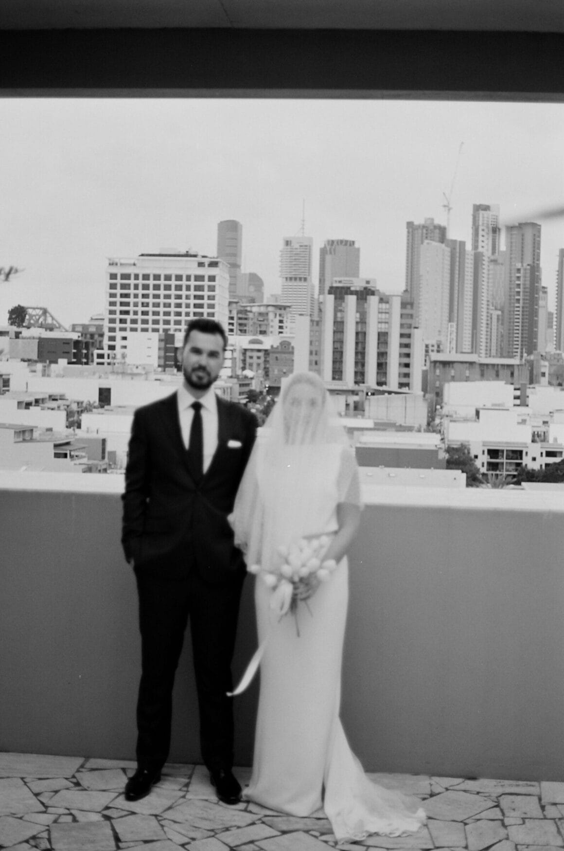 THE VENUE “Our wedding venue choice came about [due to] a last-minute attempt to move the wedding to Queensland. The Calile felt like the perfect venue for the wedding we wanted, and we couldn’t be happier with how it all worked out. Its modern, minimalist aesthetic was perfect for us. We felt as though we could lean into the hotel’s style and keep everything else stripped back. The Calile Suite also offered the perfect space for our group. The private rooftop terrace was intimate, yet open and airy as it overlooked the city, and being a winter wedding, we all got to retreat to the suite for champagne and canapés before dinner.”