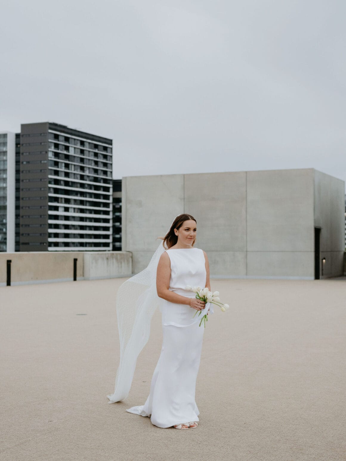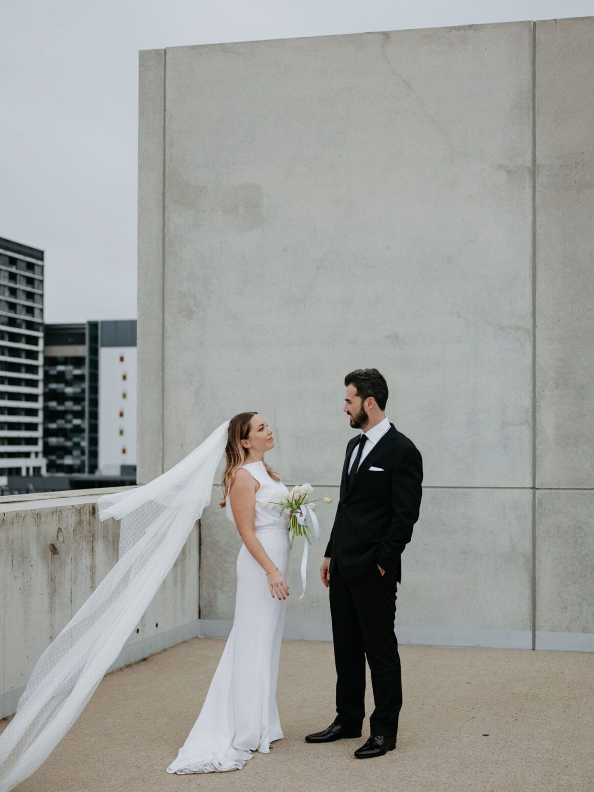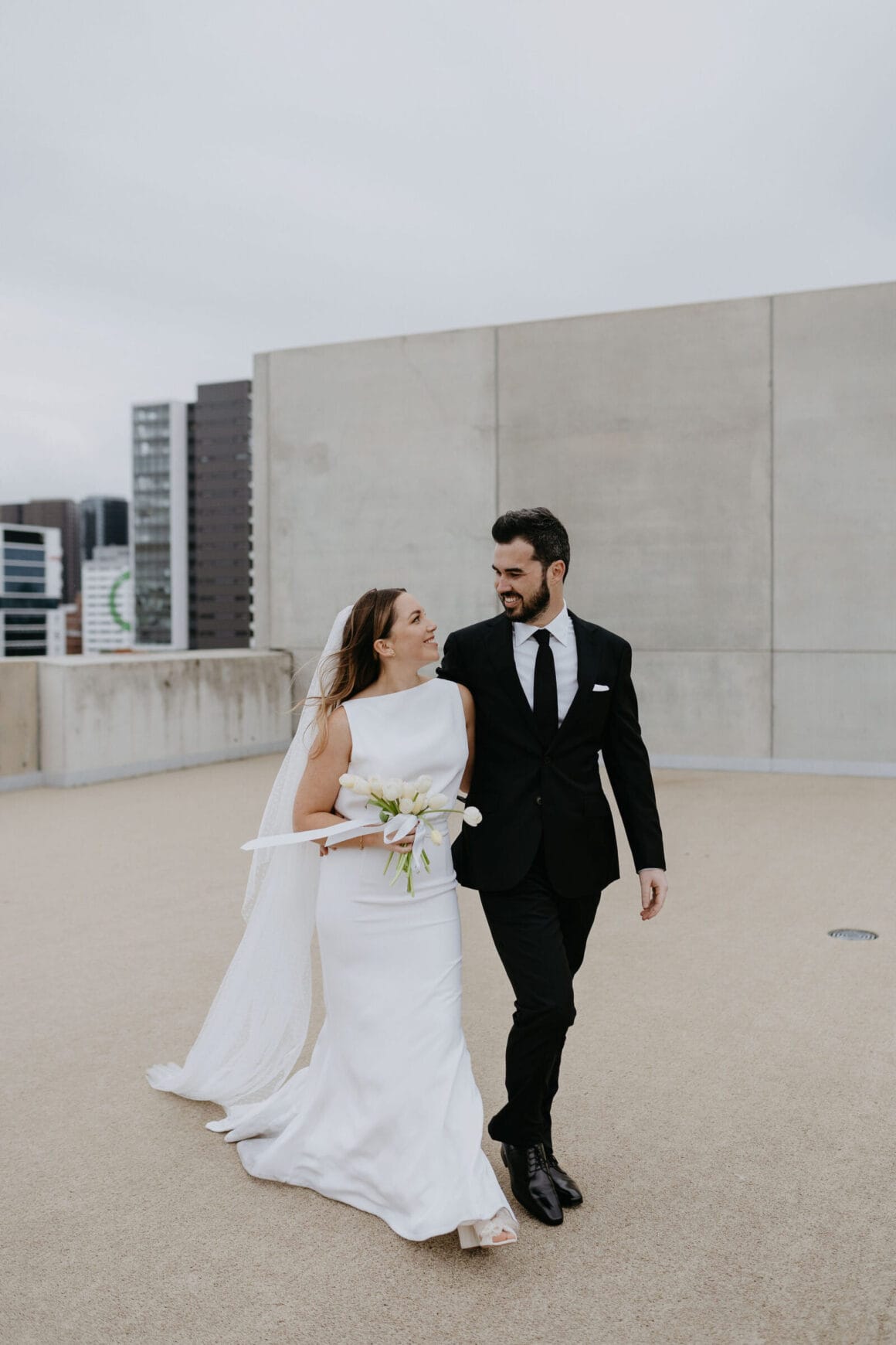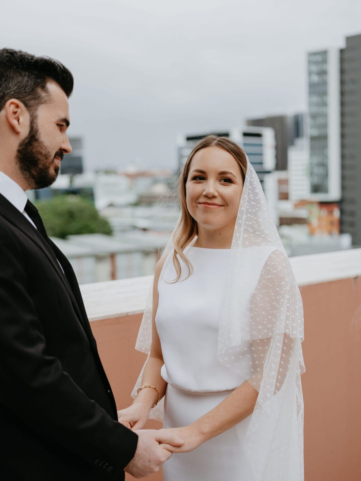 THE VENUE “Our wedding venue choice came about [due to] a last-minute attempt to move the wedding to Queensland. The Calile felt like the perfect venue for the wedding we wanted, and we couldn’t be happier with how it all worked out. Its modern, minimalist aesthetic was perfect for us. We felt as though we could lean into the hotel’s style and keep everything else stripped back. The Calile Suite also offered the perfect space for our group. The private rooftop terrace was intimate, yet open and airy as it overlooked the city, and being a winter wedding, we all got to retreat to the suite for champagne and canapés before dinner.”
