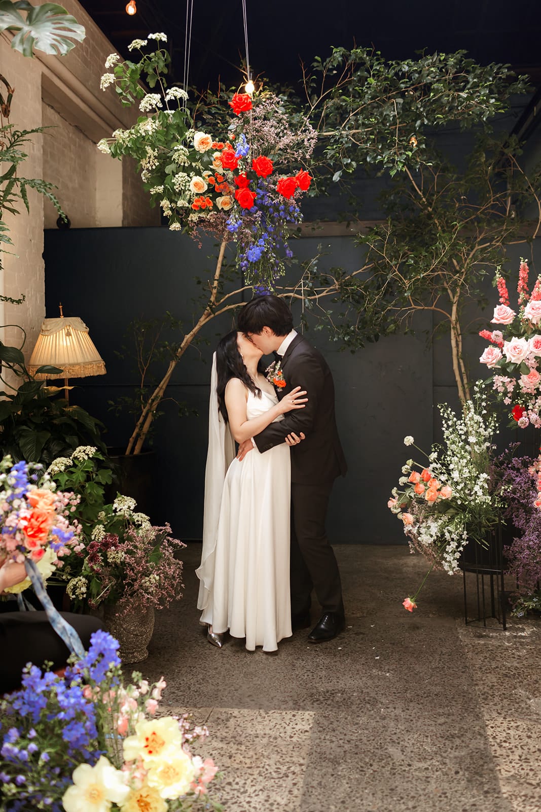 THE INSPO “There wasn’t a set theme: Jia didn’t mind, and I just wanted plants. I decided on a colour scheme of peach and blue, and our bridesmaid Grace kindly designed the invitations, the menus and the seating chart. I gave her some photos from of our dog Willa and she drew Willa in her designs.”