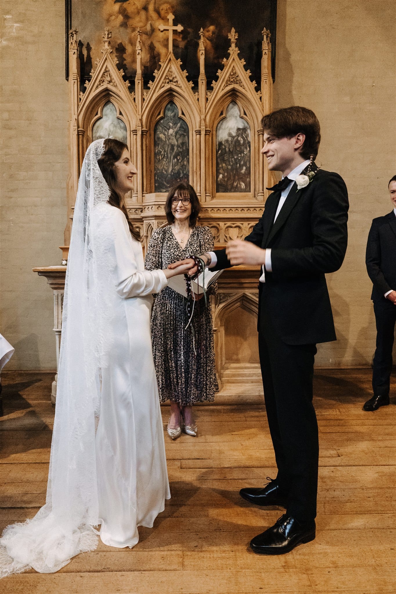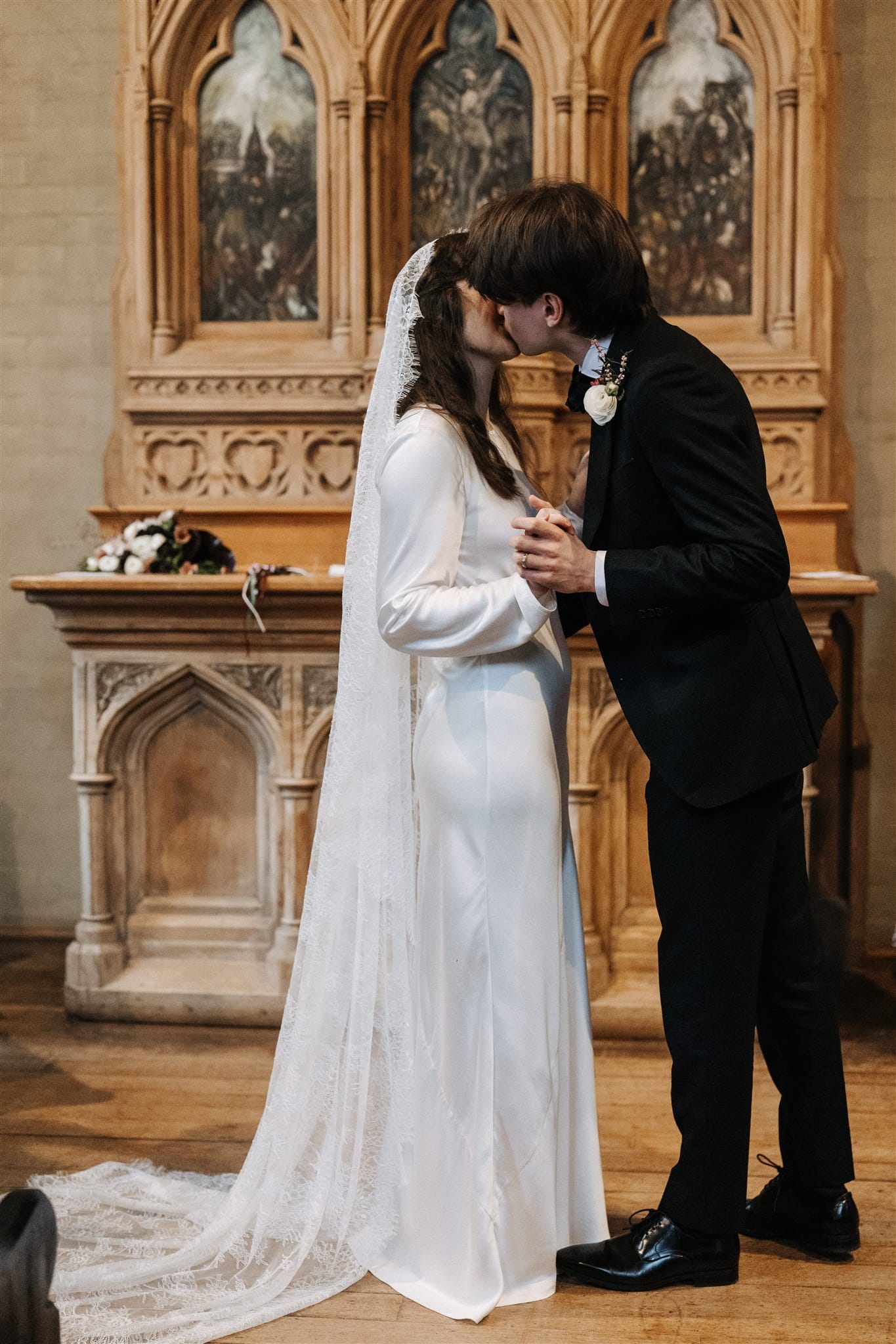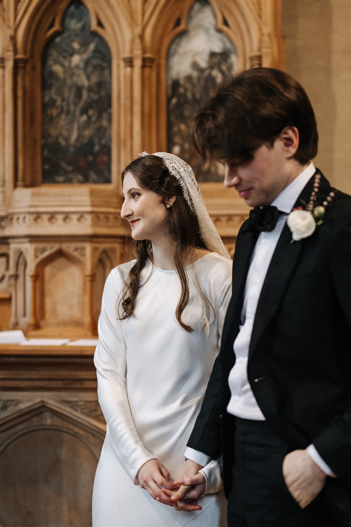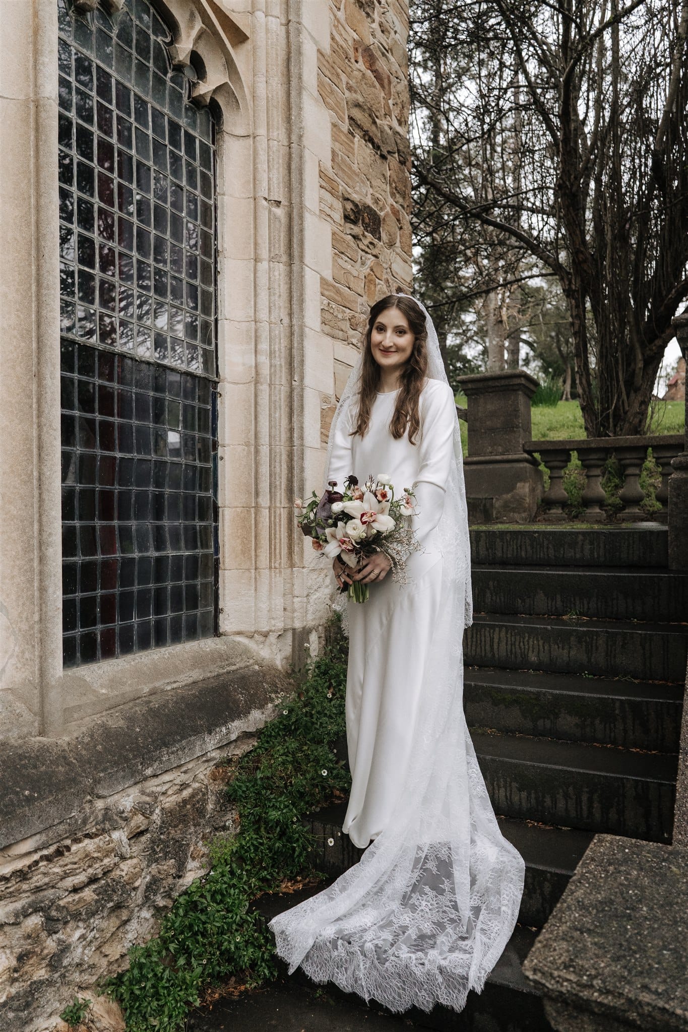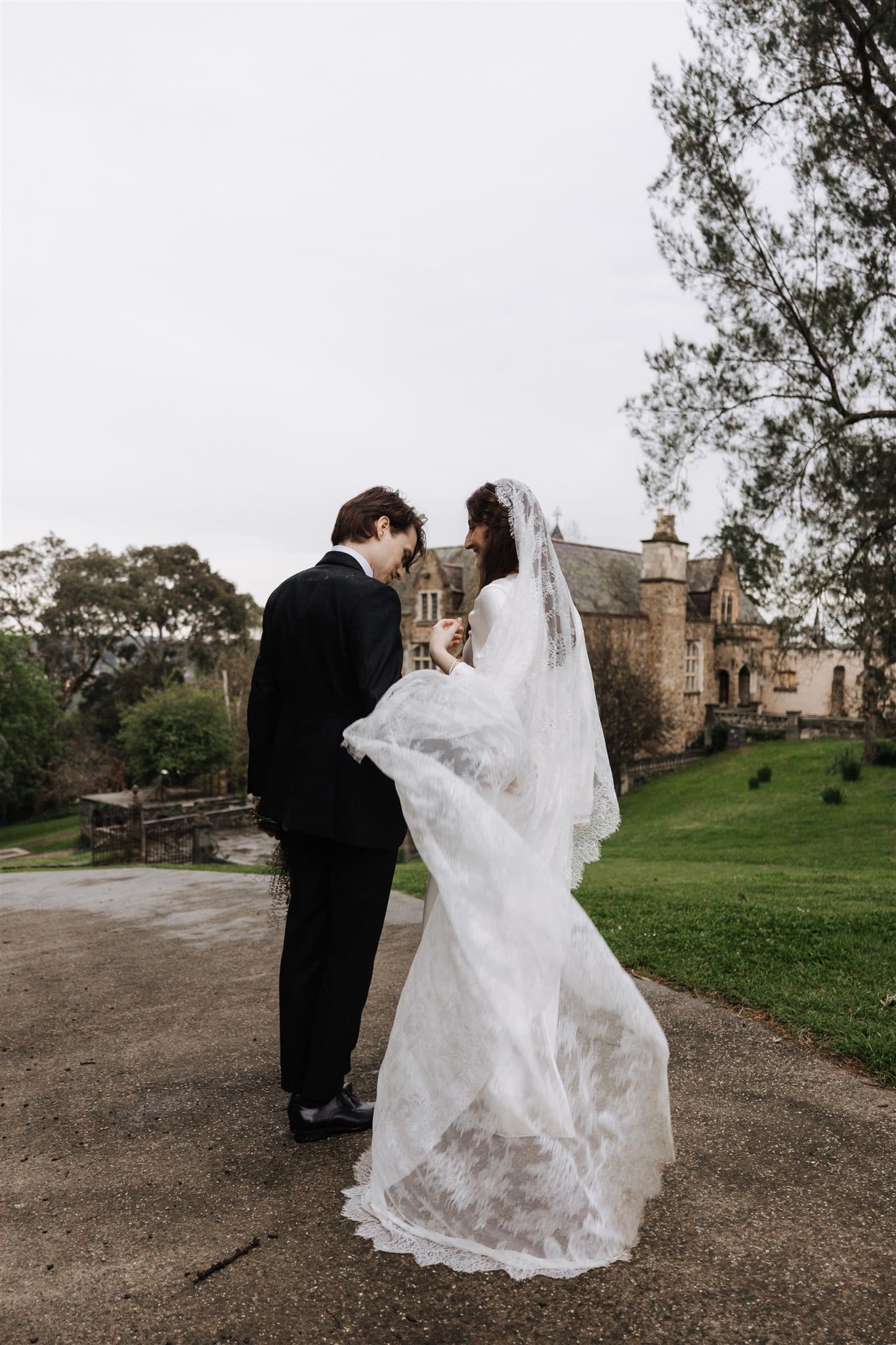 “Originally, I found an English liquid stain dress from the 1930s on Etsy, which I absolutely fell in love with, but it fell through because the seller wasn’t comfortable shipping it to Australia. [Prior,] while Nic was getting his suit fitted, I was wandering around looking in the shops on the street. One store, Silk Laundry, had a small range of [100% double silk] bridal outfits, and I made a mental note of one of the dresses—a replica 20s/30s silk dress. When I got the news about my original dress not being possible, I was a little upset, but Nic and I hopped in the car and drove back to the shop. I walked in, tried on the dress and instantly knew it was perfect. I love lace and the history of lacemaking, being very interested in the Alençon Museum of Fine Arts and Lace, where there is a historic example of a full lace veil. It would have been impossible for me to make one; [however, it] inspired my choice of veil, which was my favourite thing about my wedding outfit