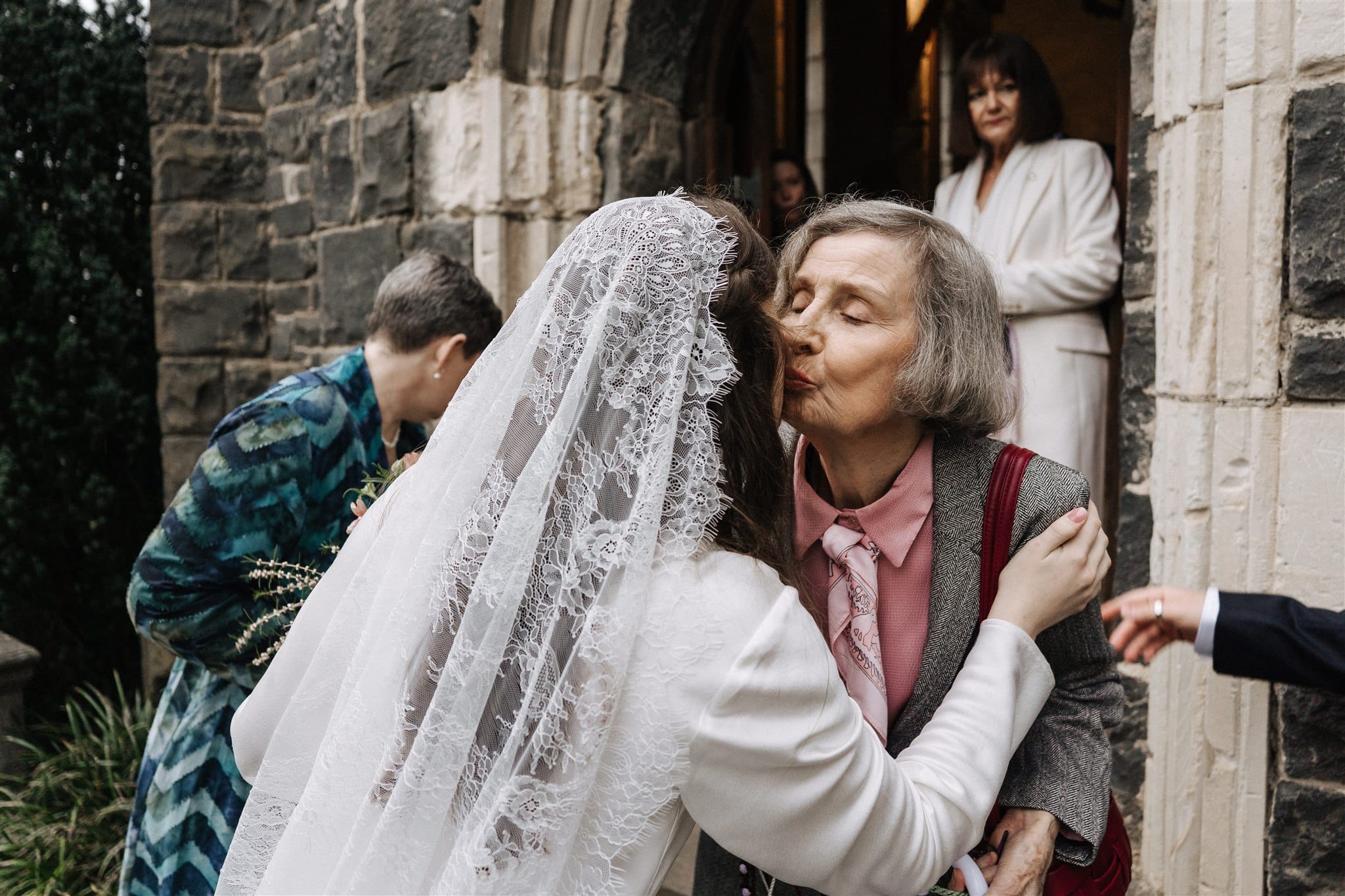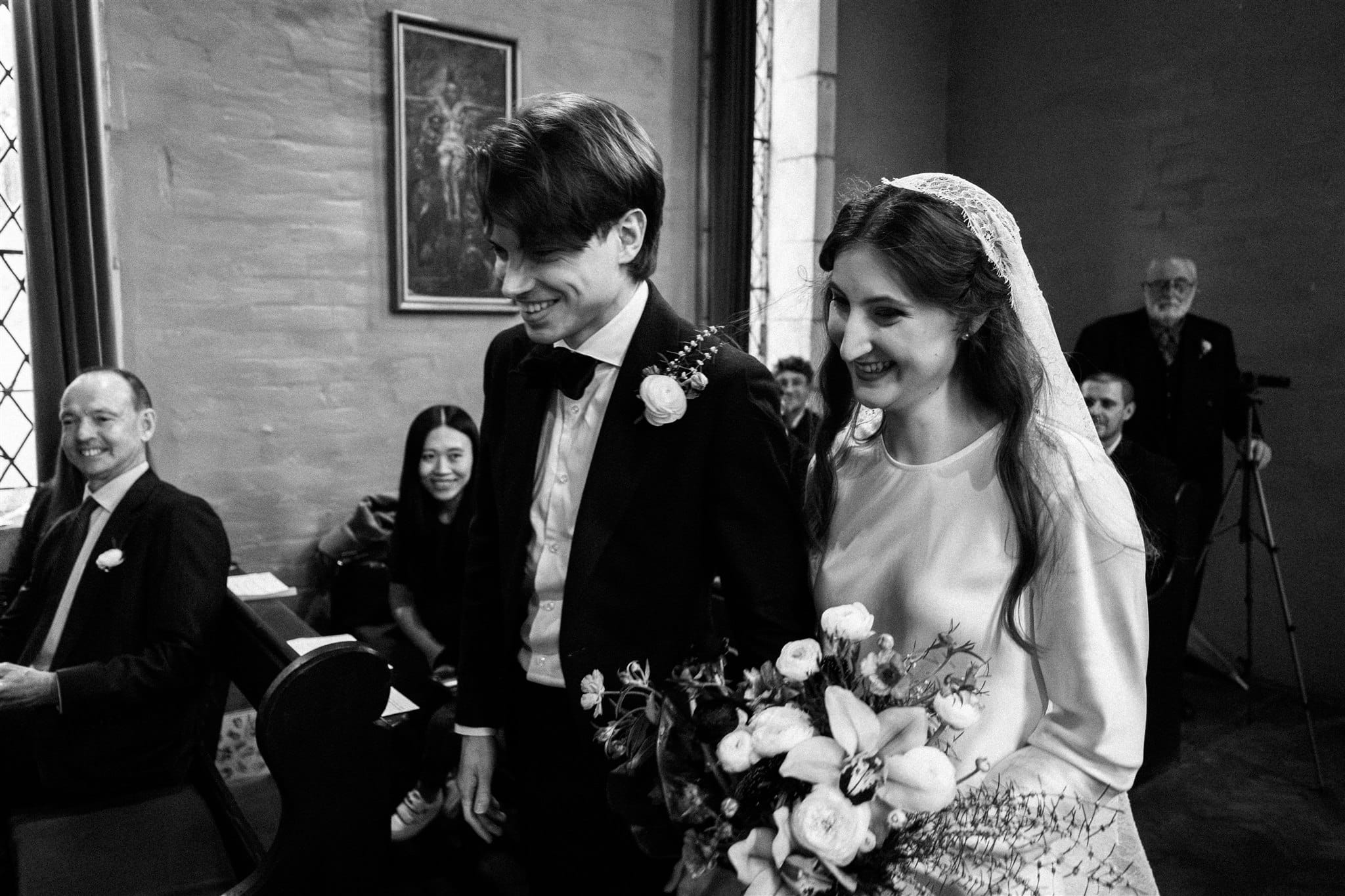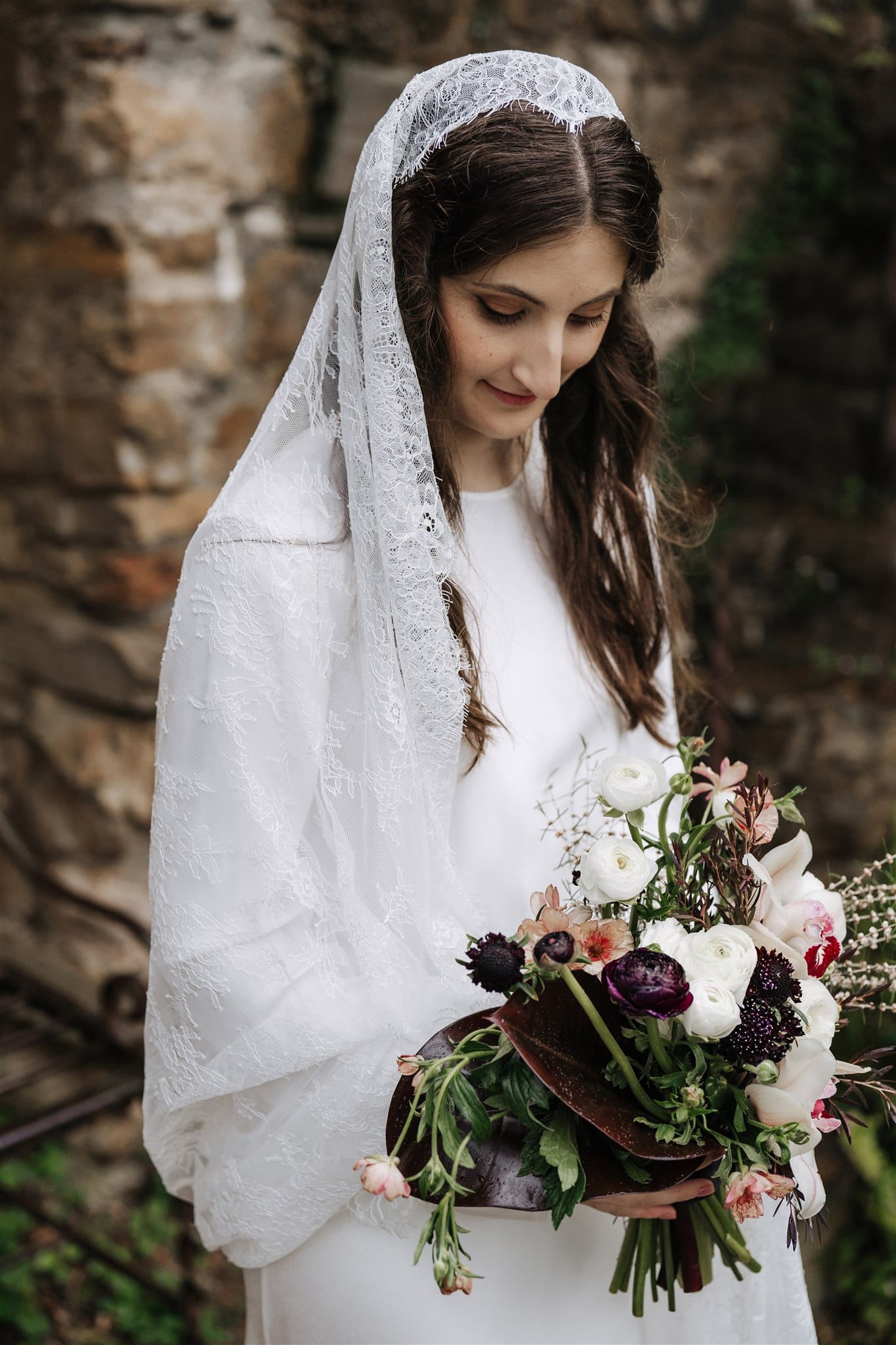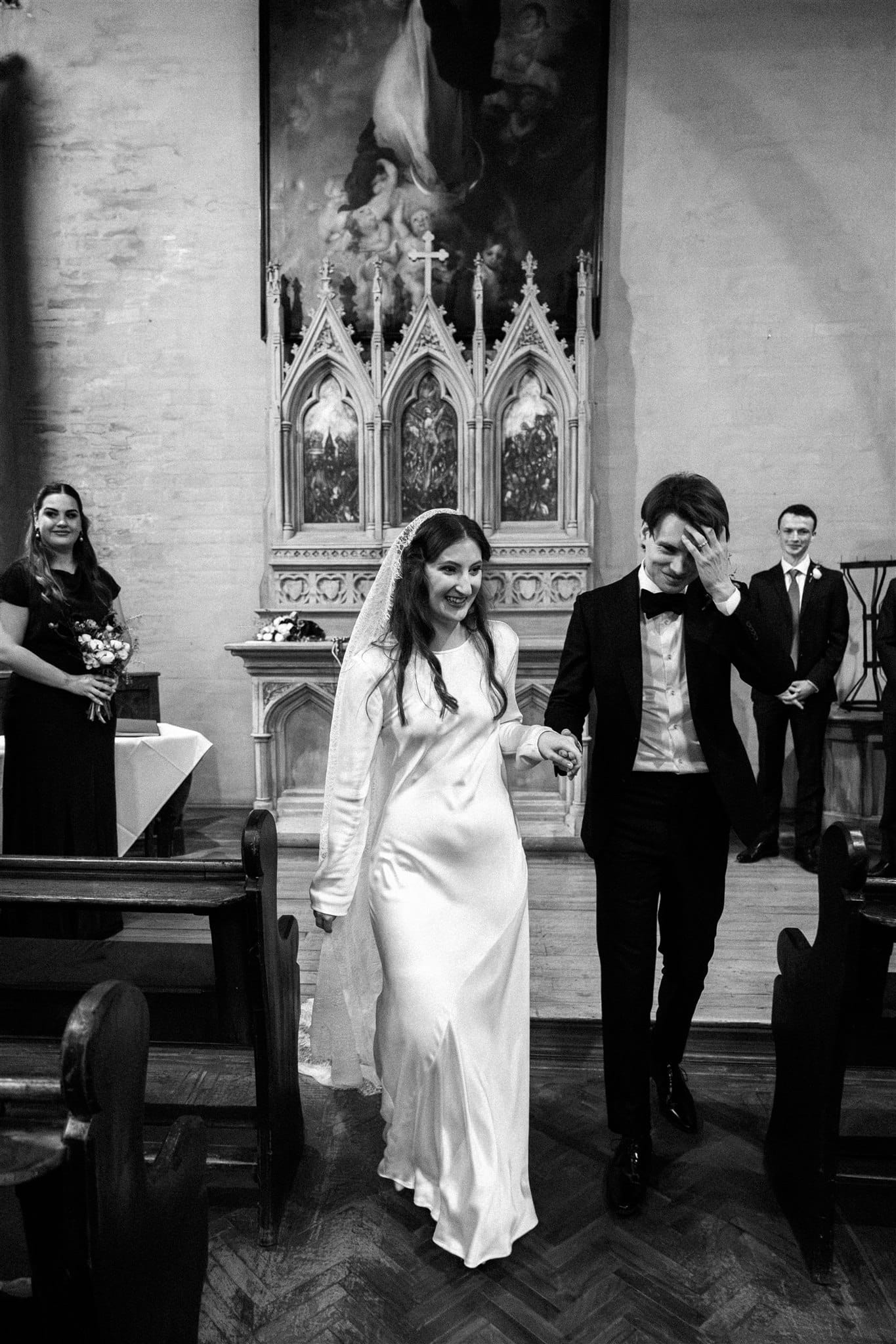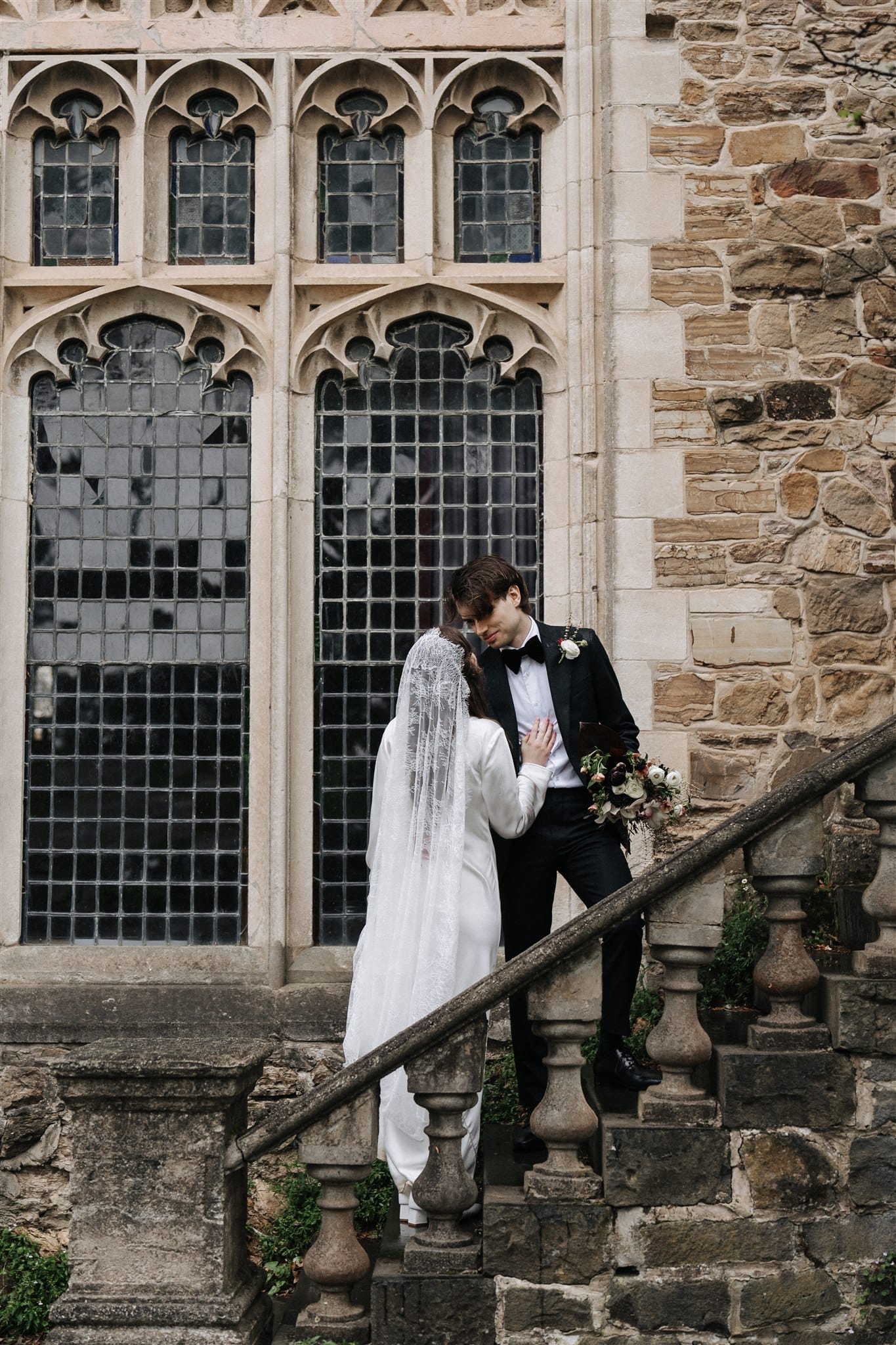 “Originally, I found an English liquid stain dress from the 1930s on Etsy, which I absolutely fell in love with, but it fell through because the seller wasn’t comfortable shipping it to Australia. [Prior,] while Nic was getting his suit fitted, I was wandering around looking in the shops on the street. One store, Silk Laundry, had a small range of [100% double silk] bridal outfits, and I made a mental note of one of the dresses—a replica 20s/30s silk dress. When I got the news about my original dress not being possible, I was a little upset, but Nic and I hopped in the car and drove back to the shop. I walked in, tried on the dress and instantly knew it was perfect. I love lace and the history of lacemaking, being very interested in the Alençon Museum of Fine Arts and Lace, where there is a historic example of a full lace veil. It would have been impossible for me to make one; [however, it] inspired my choice of veil, which was my favourite thing about my wedding outfit