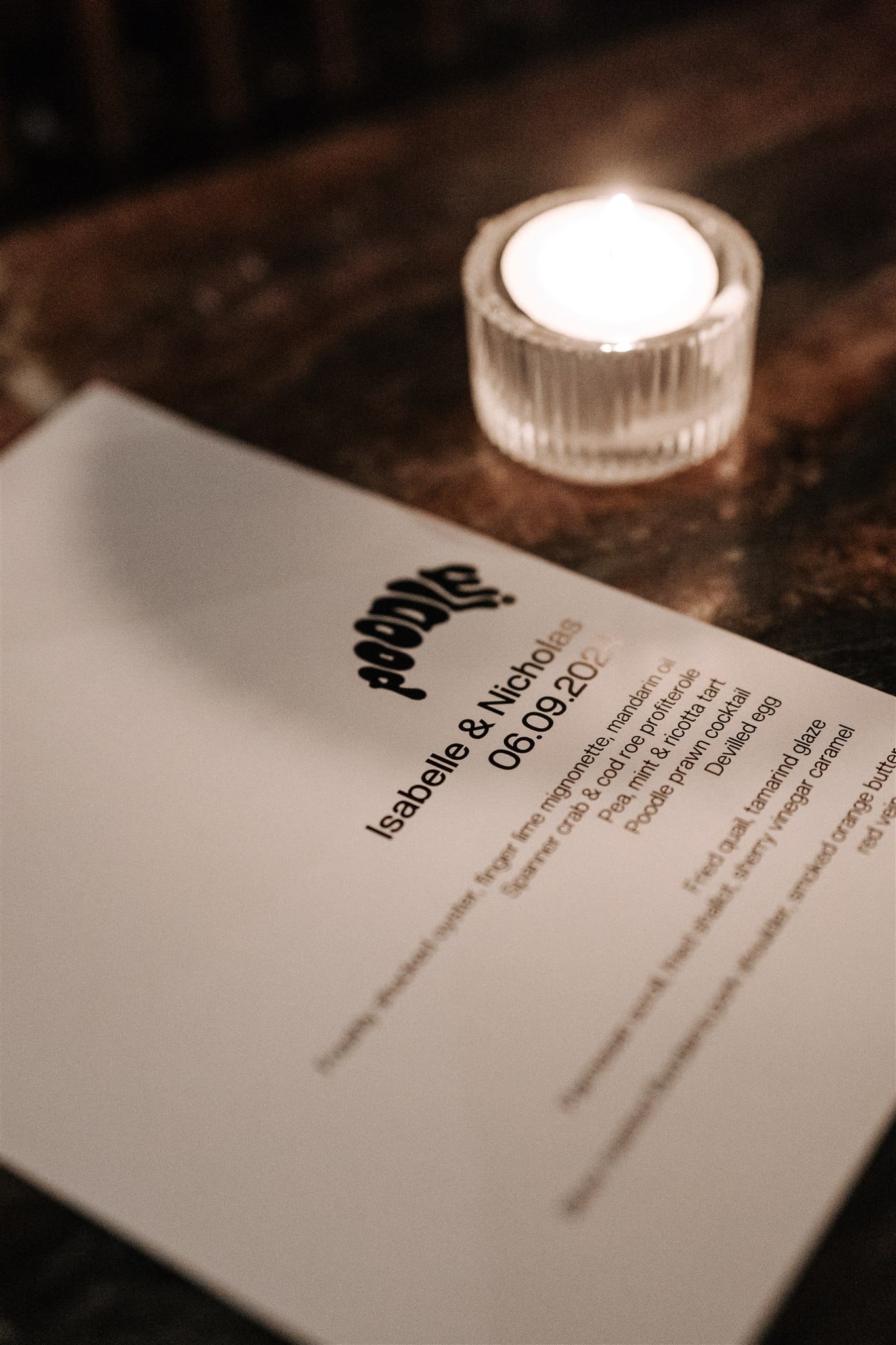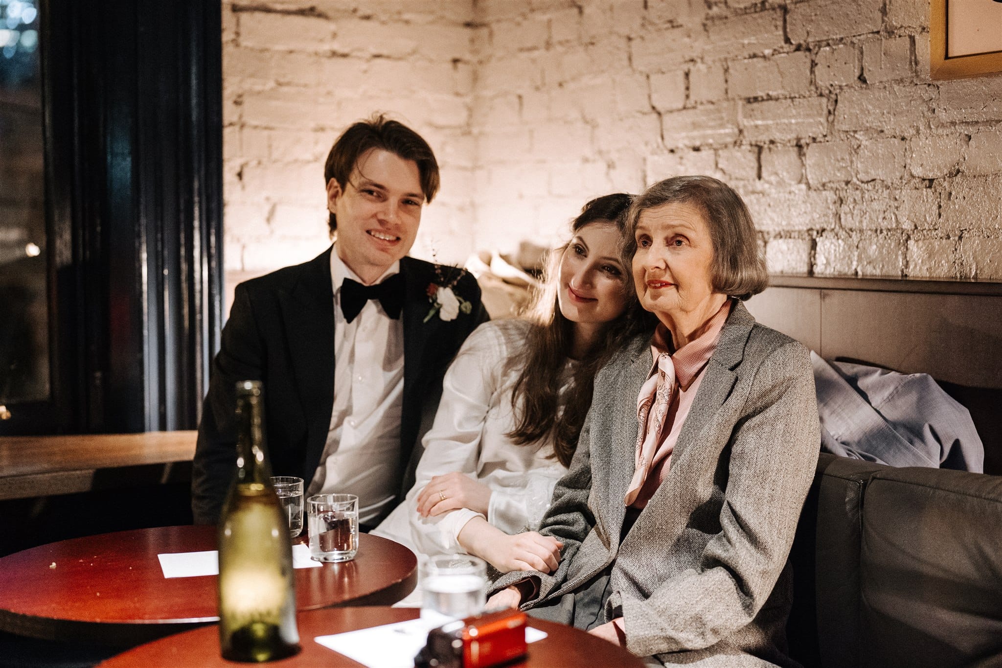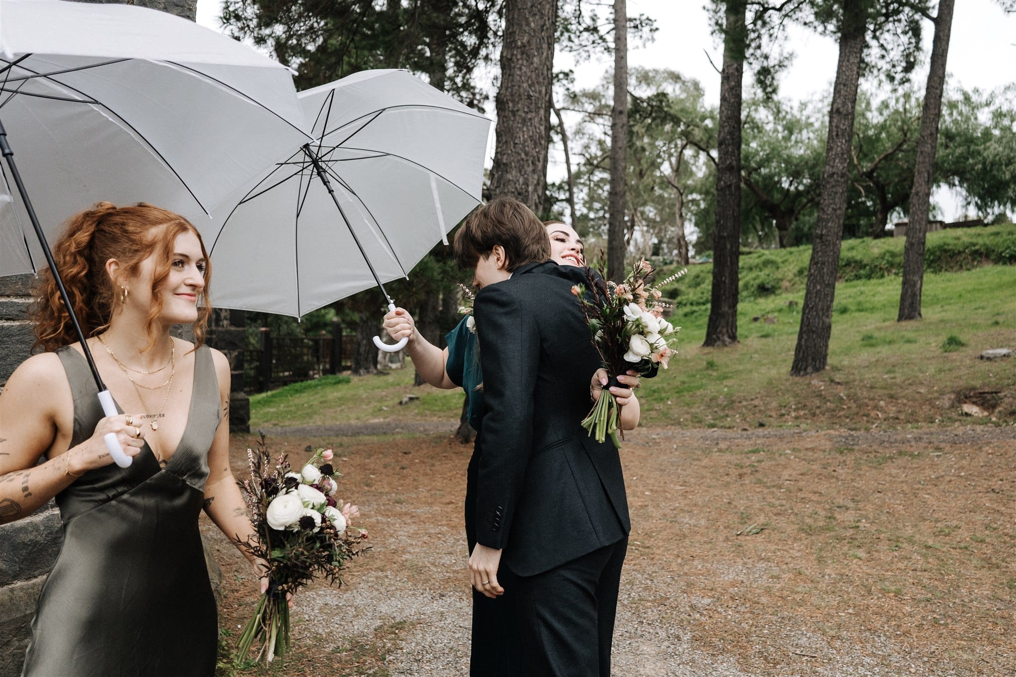“We loved how spooky and gothic Montsalvat is; it truly feels like something out of a fairytale or murder mystery novel. We had a private ceremony with only our immediate family and a few of our oldest friends in the small Bluestone Chapel at the back of the property. We can’t take any credit for it, but we were so happy it rained on our wedding day! As for the reception, it was always our plan to have it at a restaurant because we wanted it to be more relaxed and low-key. We chose the upstairs area of Poodle Bar and Bistro in Fitzroy because the restaurant has a beautiful 1920s heritage feel, the food is absolutely delicious and also their event coordinator, Melinda, is fantastic. We didn’t bring any decorations at all aside from our welcome sign, as the space is covered in artworks and cosy design features/furniture. We also liked how, being in central Melbourne, it would be easy for people to get to after work on a Friday night. We had 50 of our closest friends and immediate family for a cocktail-style dinner, with drinks and dancing into the night.”