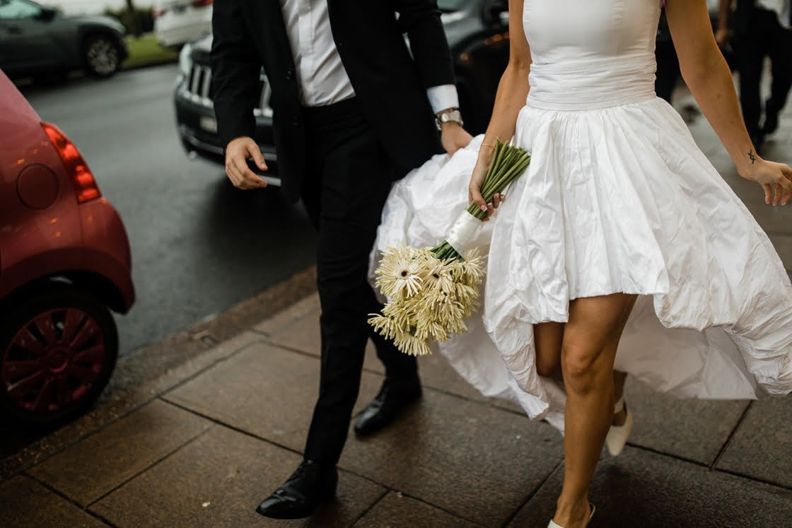THE DRESS “I knew I wanted to do something different and preferably a high-low style gown – I’d fallen in love with an Oscar De La Renta piece, but as the saying goes, if you have to ask, you can’t afford it! I’d seen that Sydney designer Bowie Rae did a similar style skirt and I wanted to find a top that made it look like an all-in-one dress. They had the perfect bodice, which we were able to make into a mini dress so when reception time came, I simply took off the skirt and away I went. I also knew I wanted a short veil and my hair to be short enough so you could see my dress and necklace, so I chopped 2/3 of my hair off two days out from the wedding (my poor hairdresser asked me three times if I was sure).”