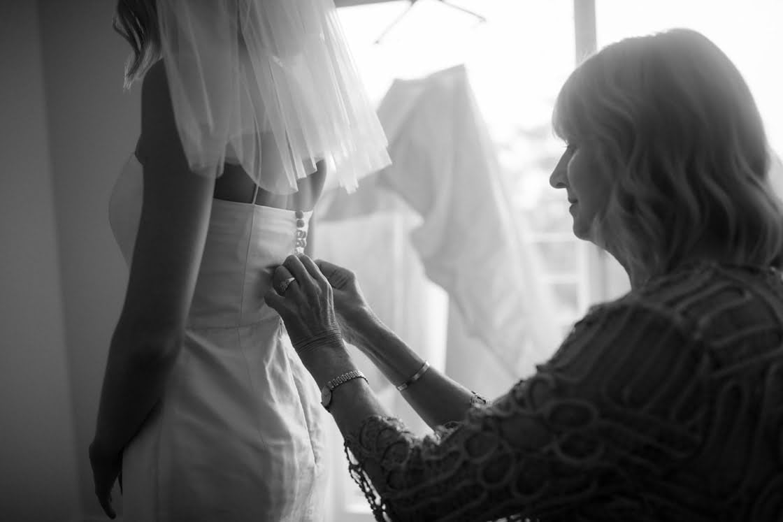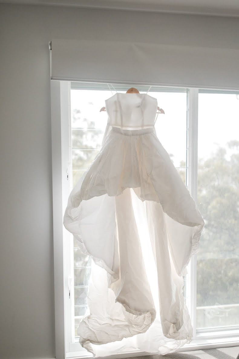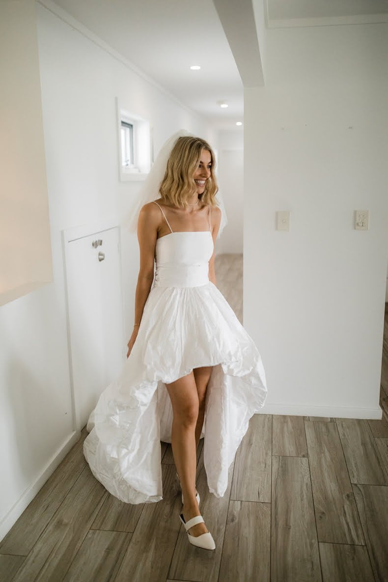 THE DRESS “I knew I wanted to do something different and preferably a high-low style gown – I’d fallen in love with an Oscar De La Renta piece, but as the saying goes, if you have to ask, you can’t afford it! I’d seen that Sydney designer Bowie Rae did a similar style skirt and I wanted to find a top that made it look like an all-in-one dress. They had the perfect bodice, which we were able to make into a mini dress so when reception time came, I simply took off the skirt and away I went. I also knew I wanted a short veil and my hair to be short enough so you could see my dress and necklace, so I chopped 2/3 of my hair off two days out from the wedding (my poor hairdresser asked me three times if I was sure).”
