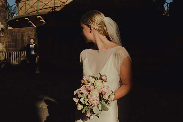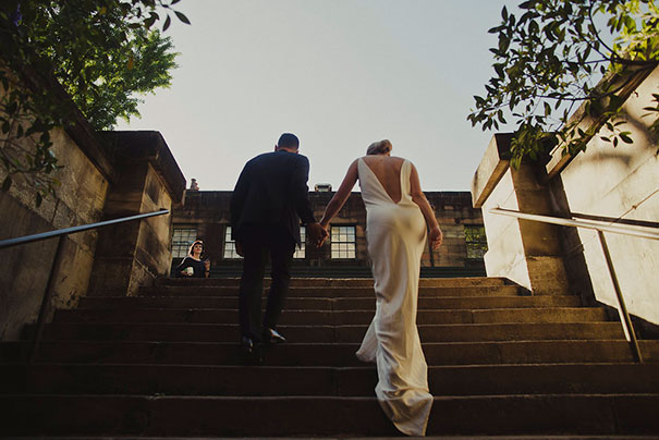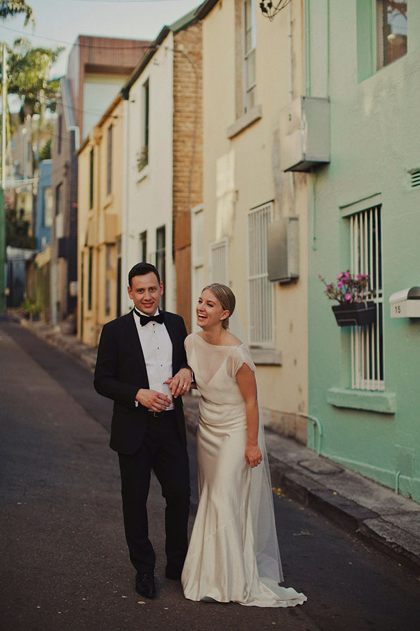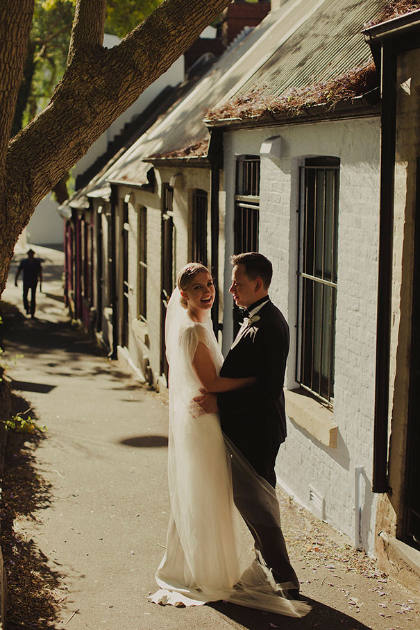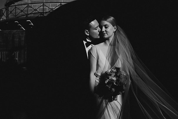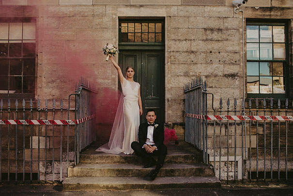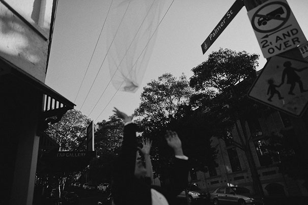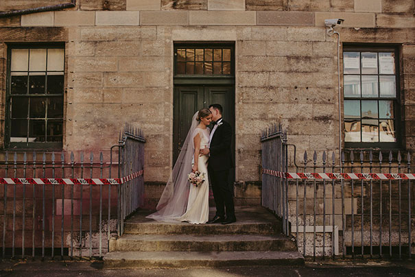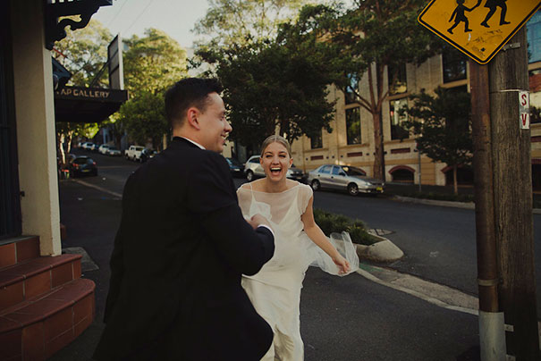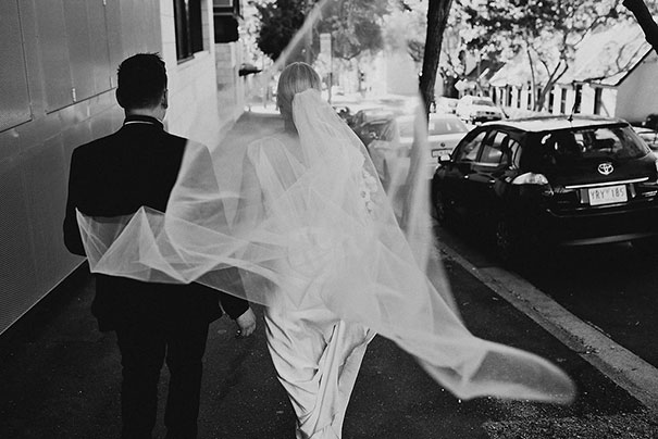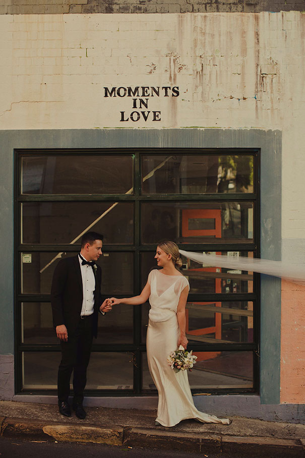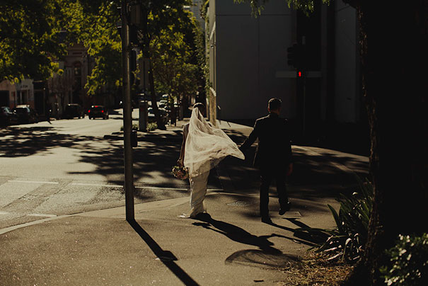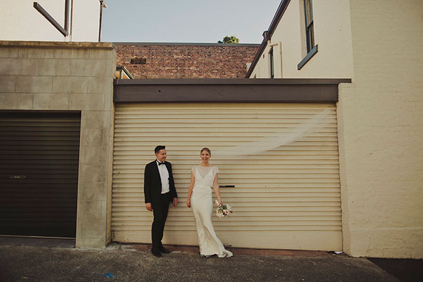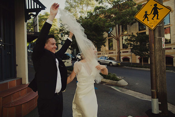 A no frills day filled with fun times and described as £classy, romantic and a little quirky—, it’s not surprising that this Sydney wedding was overflowing with amazing memories – like their runaway veil moment captured by Dan O’Day Photography. £During our photos we took to the city streets for some shots. There was a fair bit of wind that day and just as Dan was taking a shot of us, my veil flew straight up and landed in the power lines! We were on such a high from just being married we couldn’t stop laughing. It was still quite windy so we thought we’d hang around to see if it would fall back down. After untangling itself and landing in another power line, it finally fell free and Des leaped up and caught it. We had people cheering for us from the balconies and cars which had stopped in the street.—