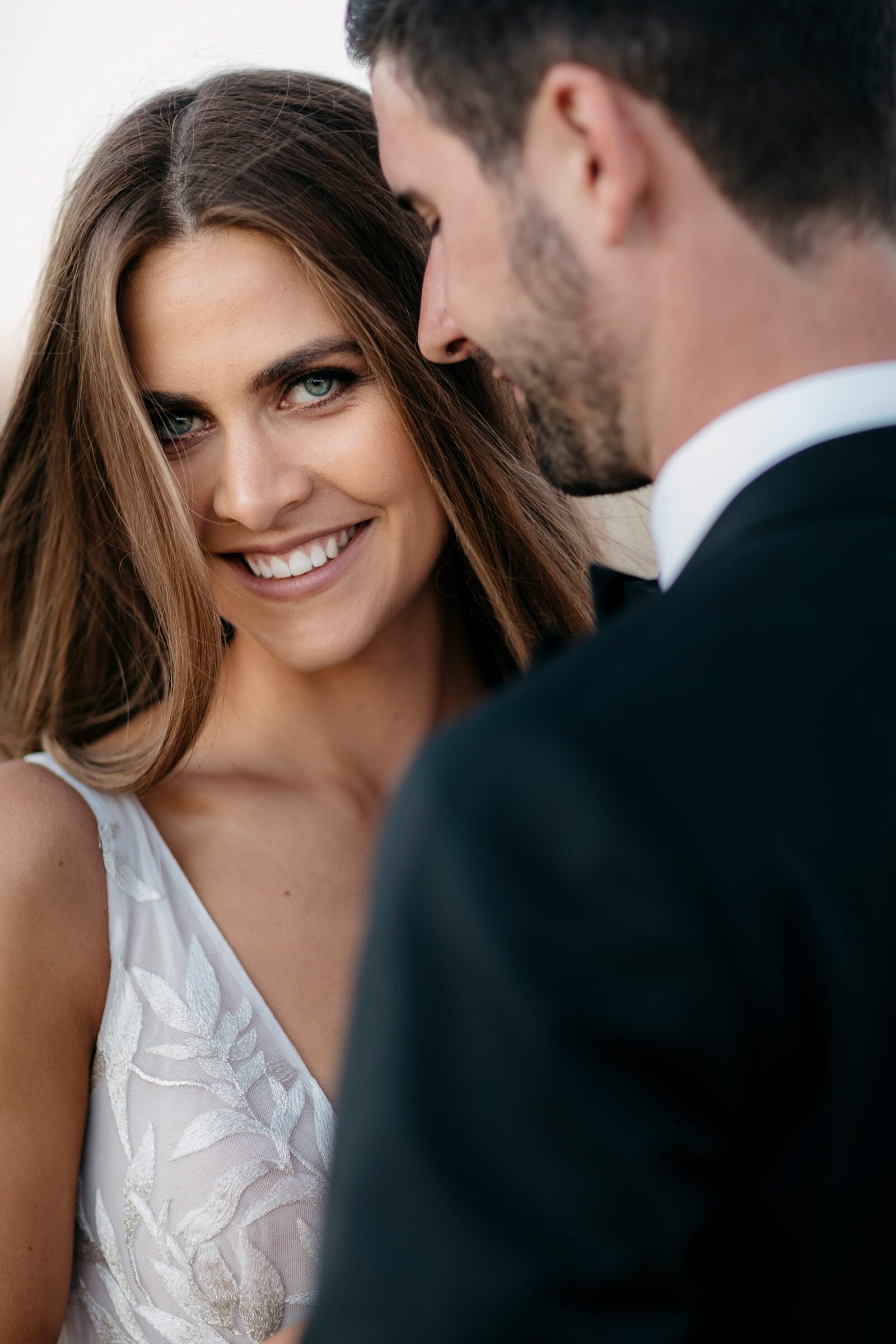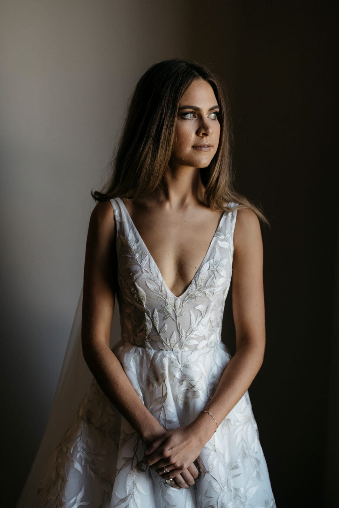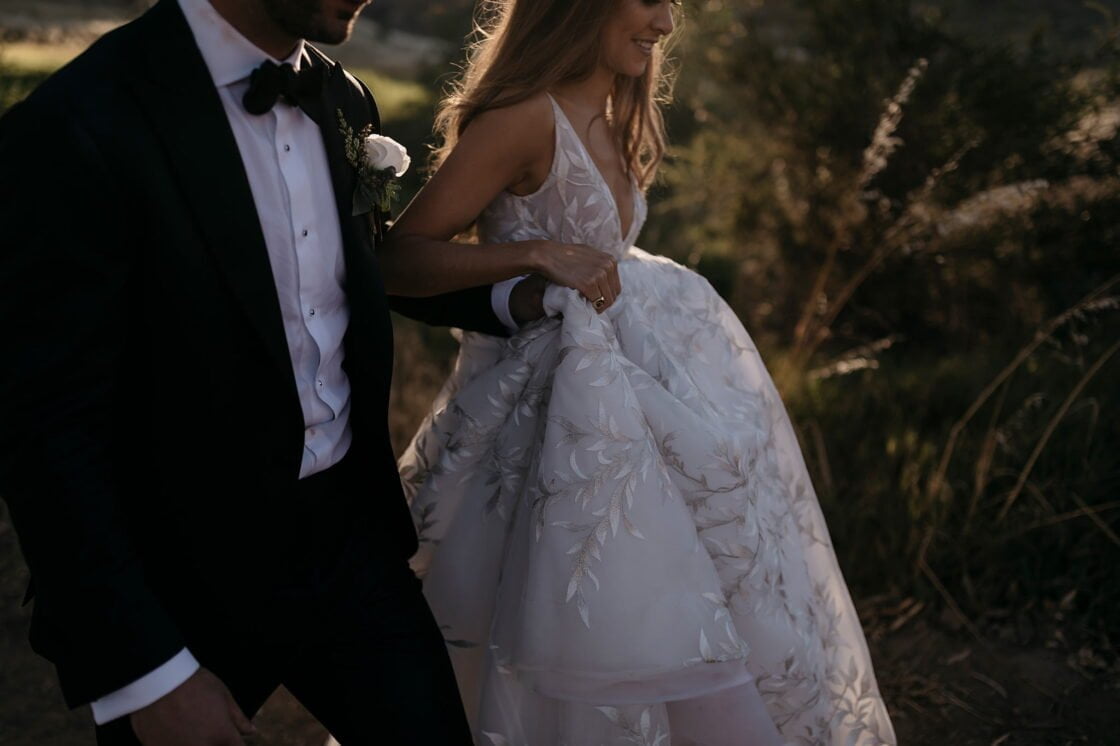 THE DRESS “I remember seeing Paolo Sebastian’s first show in Adelaide and I knew straight away he would design my dress. We were only going to be back in Australia for two weeks, one year before we’d be back for the wedding. I had two appointments with Paul (the designer) during this time, and then my first and final fittings were crammed into the two weeks leading up to the big day. I actually found my shoes before the dress, chose the bronze colouring in the dress to suit the shoes and incorporated a split to show them off. Paul suggested that I don’t take any photos in my fittings and as hard as that was, it was great advice, as I put complete trust in his design. It fit like a glove and was perfect!”