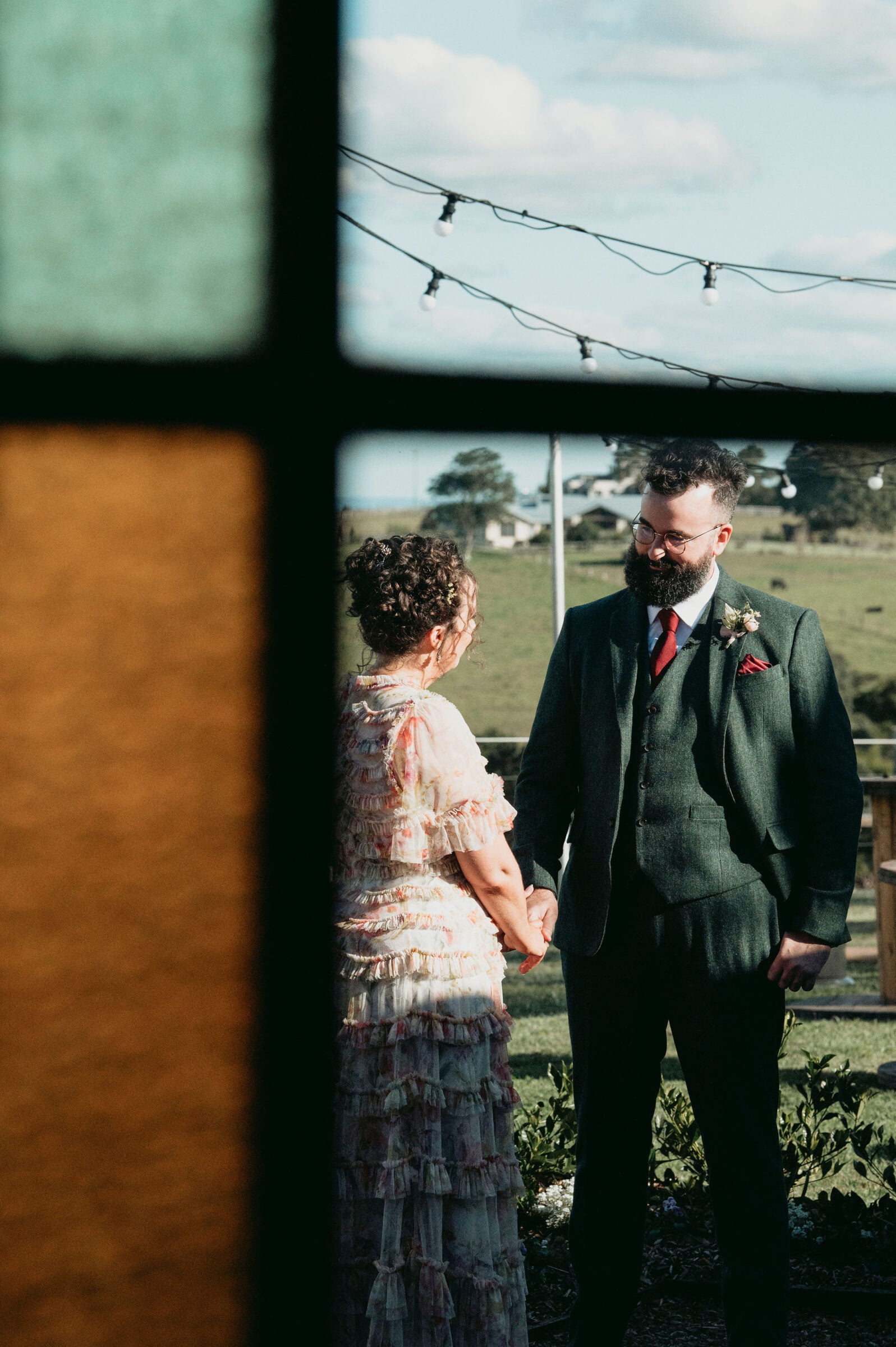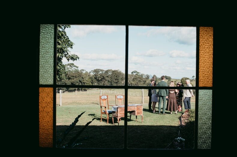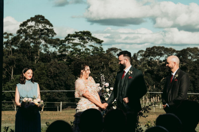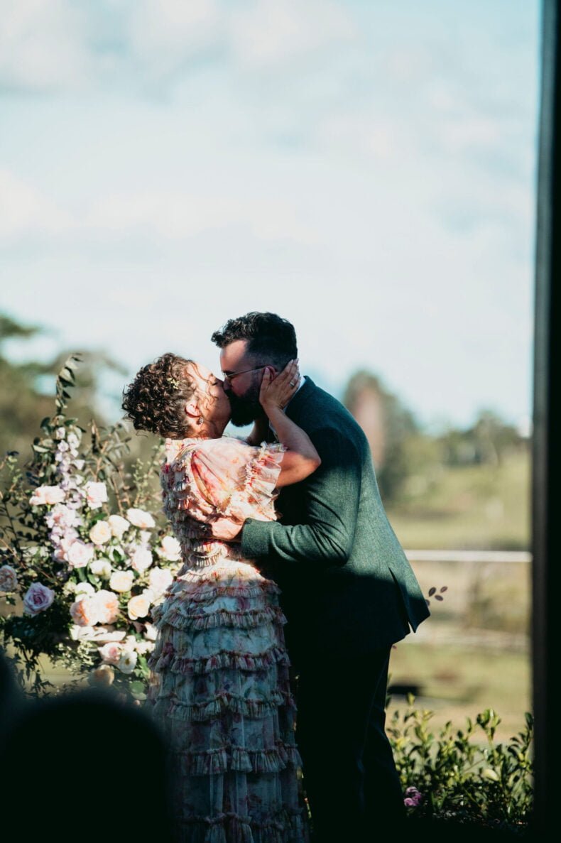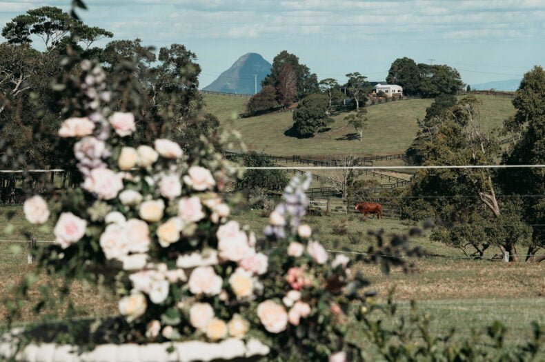 While visiting Jess’s mum’s Maleny property, Lew surprised his bride-to-be by getting down on one knee as they rang in the new year. The sentimental spot would become the location where they tied the knot. Think lush green hinterland hills, stained-glass windows, horses and a dress fit for a princess. The cosy cottage-core vibes were something straight out of a storybook.