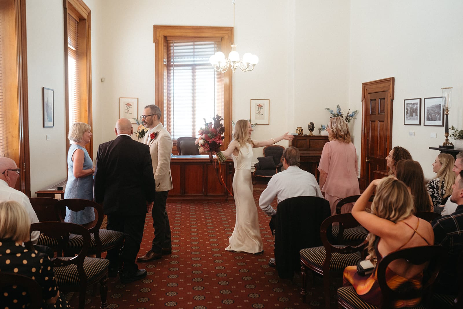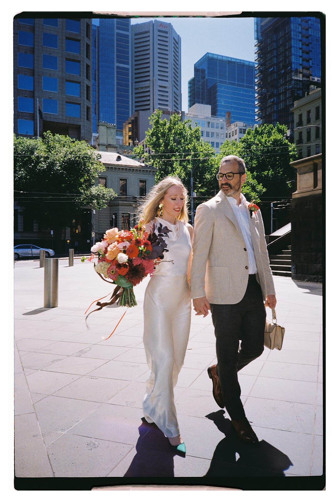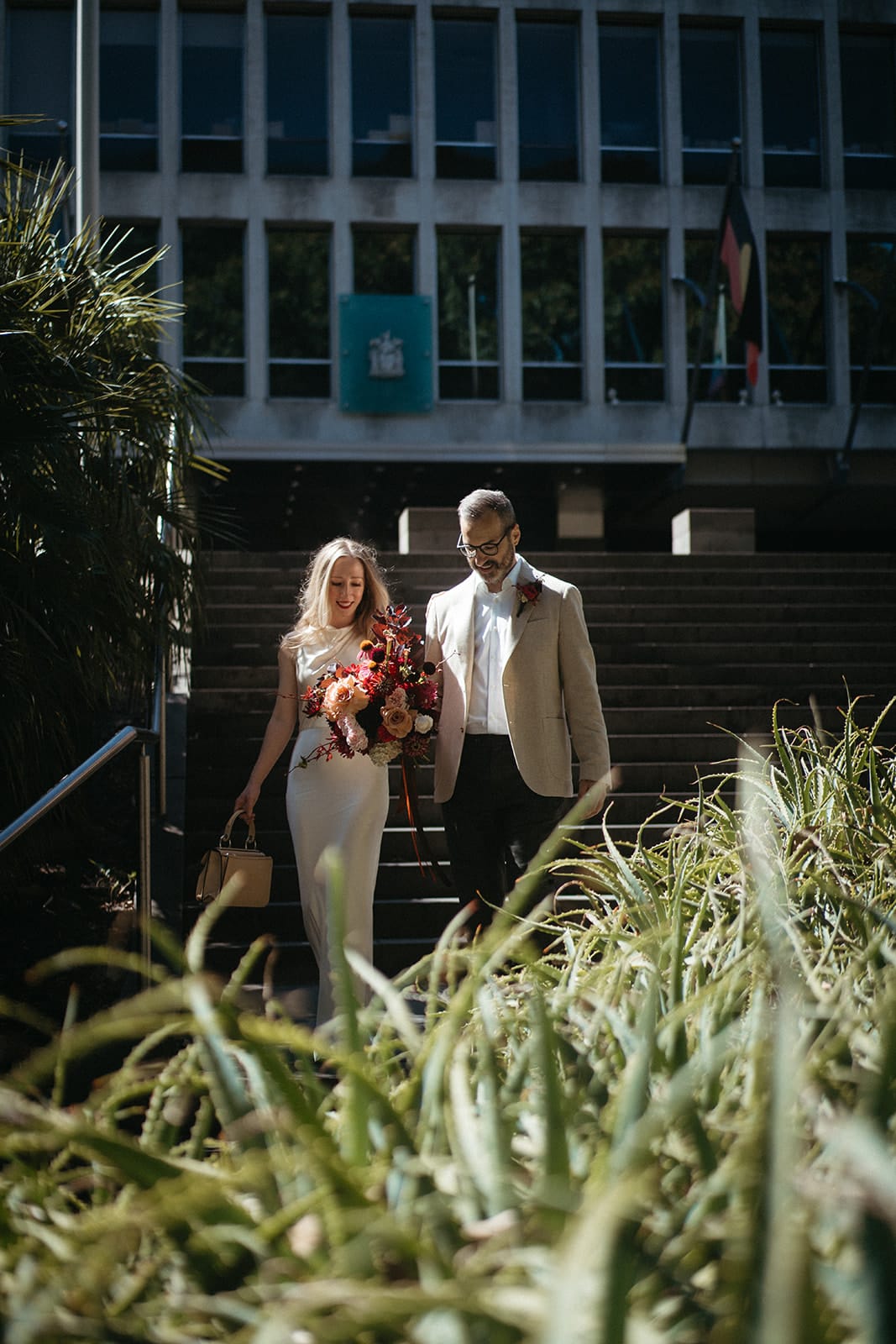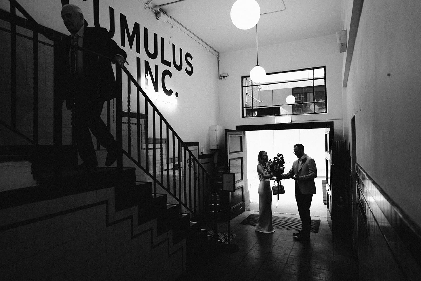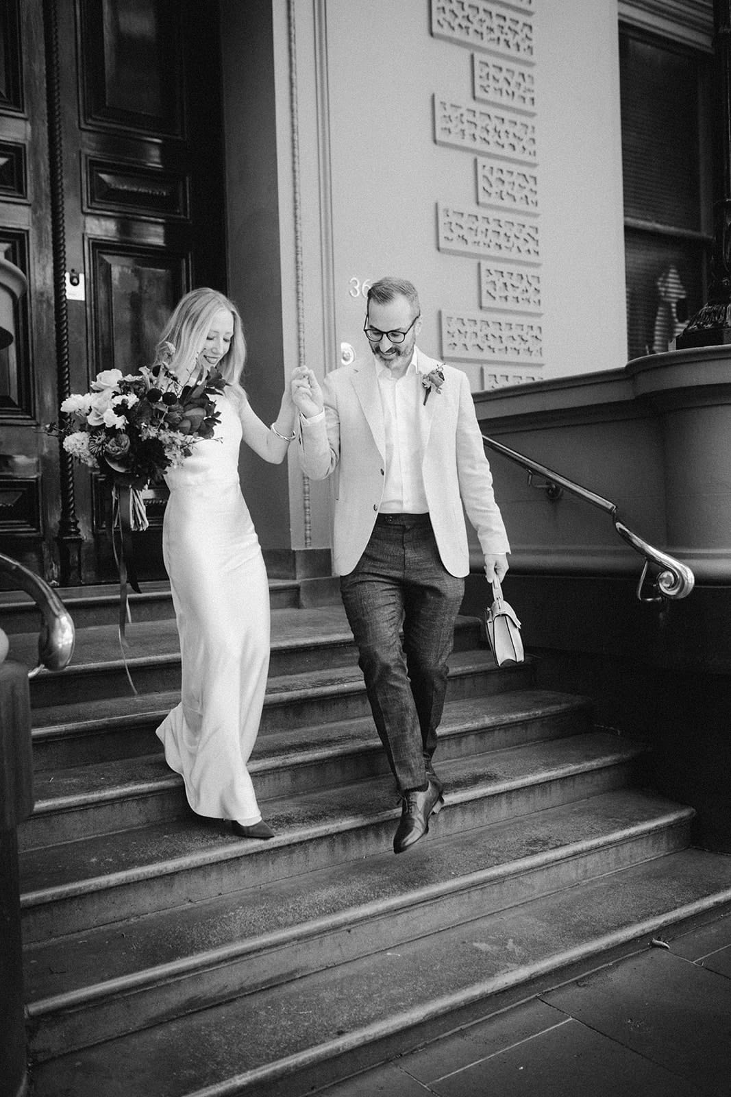 A sophisticated, understated and elegant micro Melbourne wedding – that’s how Luke (a software engineer) and Jess (French teacher-turned-artist) chose to tie the knot. With 42 of their favourite people along for the ride, the pair exchanged vows at the Victorian Marriage Registry within the city’s historic Treasury Building. They followed with feasting and festivities at Cumulus Inc, conveniently located just across the road.