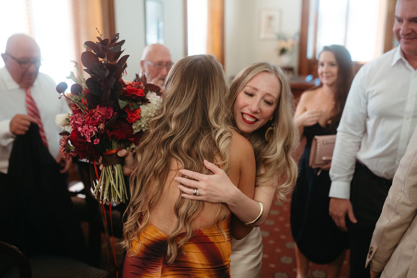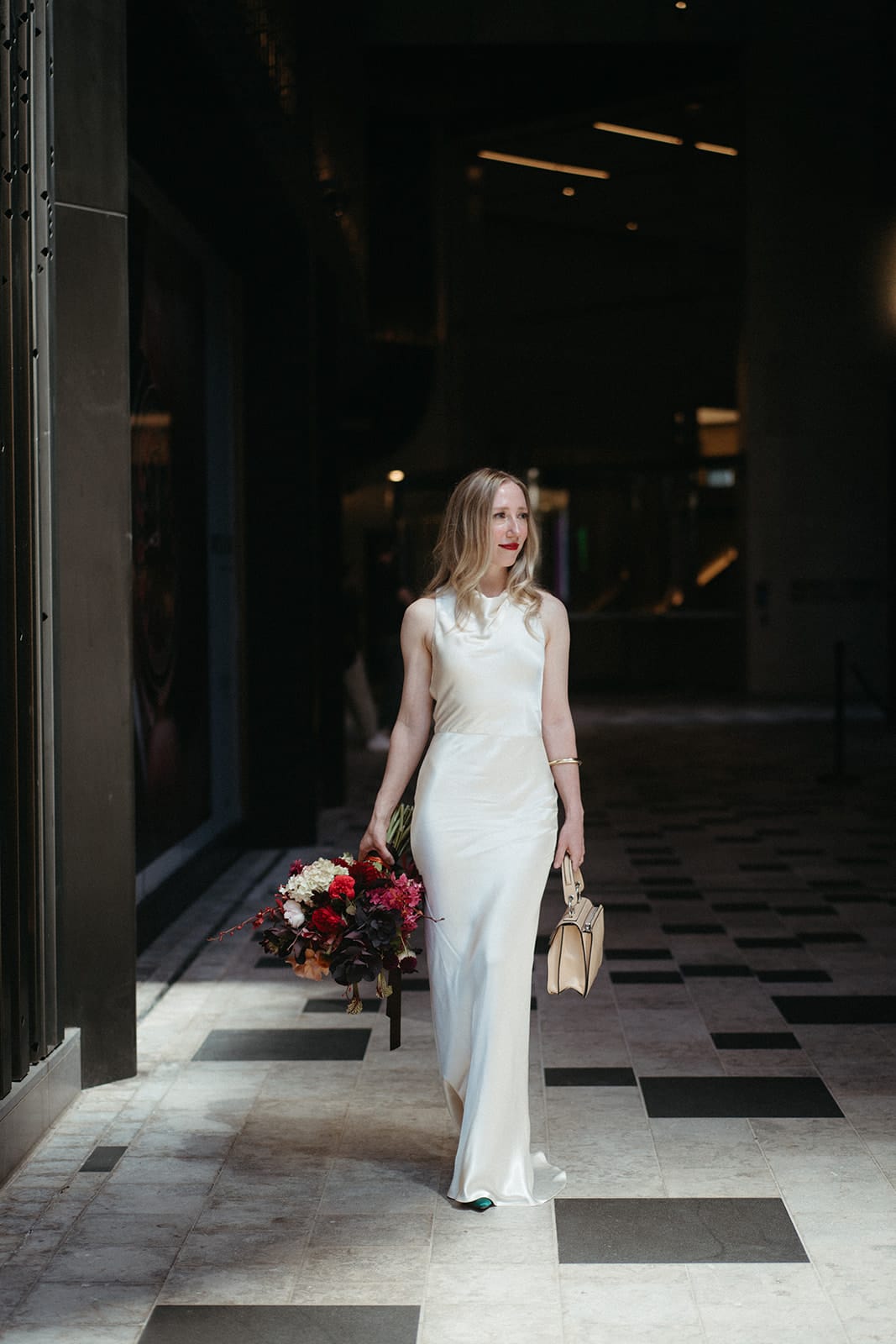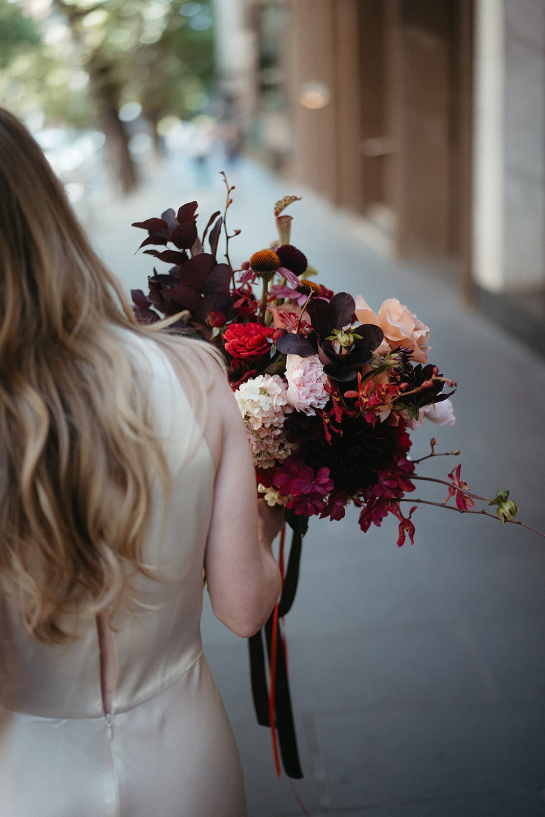 FAVE DETAILS “The bouquet [from Geranium Studio]! I had sent over some inspo images featuring moody, rich hues of burgundy and caramel, not being too precise in terms of the type of flowers and wanting something loosely constructed. When the bouquet arrived, Luke and I were blown away – billowing dusty apricot roses and Dahlia cornels among so many other amazing varieties. Just perfect.”