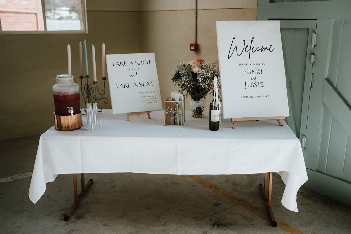 DIY “Due to our limited budget we did lots of DIY. I (Jessie) spent months before melting candles on old wine bottles we had collected. We made our own shots for people to do on entrance to our ceremony. Again, the florals were all done by us. We thrifted vases and painted them to match our colour scheme. The set up at the venue the day before was all done by us and our close friends and family. As much work as it was, it was worth it to DIY a lot of the decorations, we couldn’t be happier with the aesthetics of the day.”