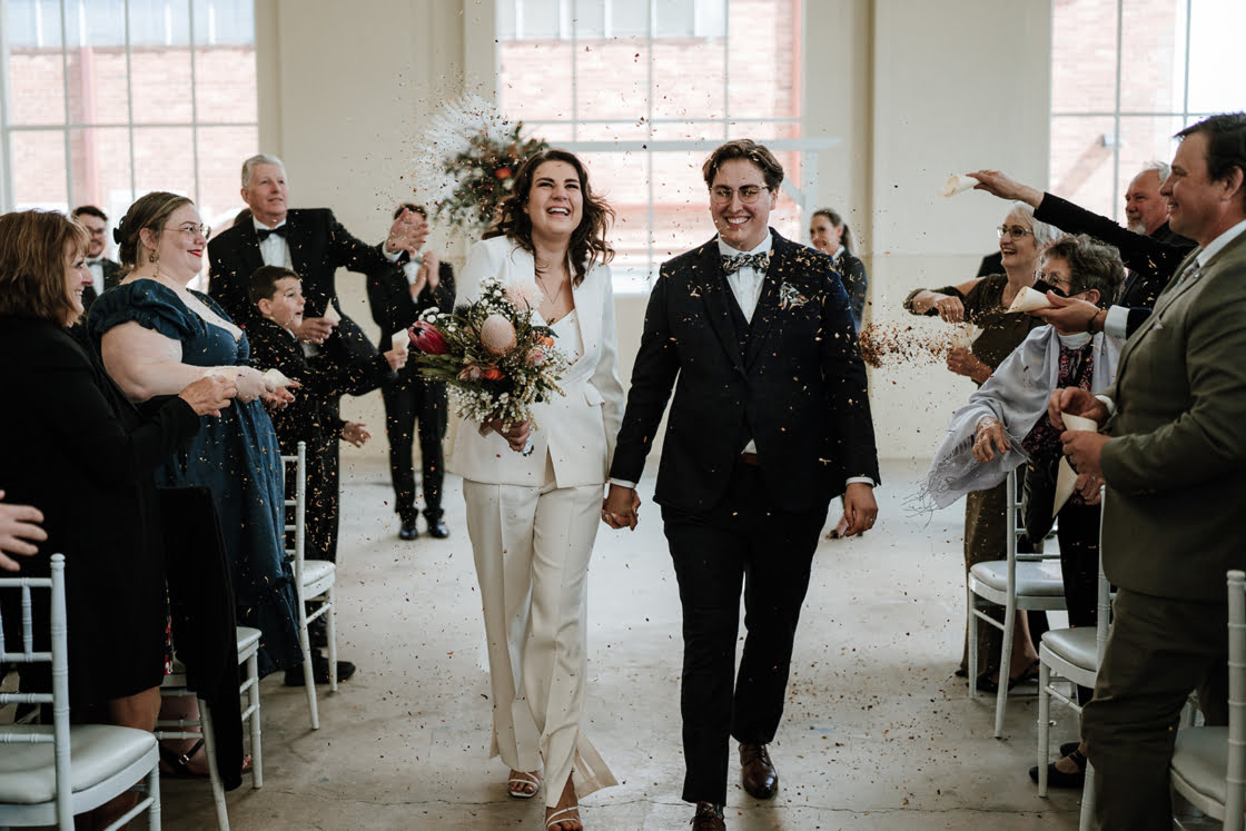 CONTRIBUTING VENDORS Photographer Translucent Photography Planning, Styling, Florist, Stationery & Signage DIY Ceremony & Reception Fitters Workshop Catering Golden Roast, Lazy Grazer Cake Jaime Grubb (friend) Desserts Lazy Grazer Favours Three Foxes Hire Items Barlens, Show Pony Events, Vintage Events Photo Booth Spectrum Photo Booth Lighting & Sound Barlens Confetti Sonia Wellness Studio via Etsy Candles Candle Co. Celebrant Marry Us Sally Rings Meadowlark, b.q jewellery THE BRIDE (Jessie) Suit Reiss Shirt Seni Dey via Etsy Veil KYHA Shoes Naked Vice Necklace Aletheia & Phos Makeup Jacqui Scott Fragrance Who is Elijah THE BRIDE (Nikki) Suit Isadora Nim Shirt Tailor Store Bow Tie & Cufflinks Peggy and Finn Shoes Julius Marlow Bracelet Aletheia & Phos