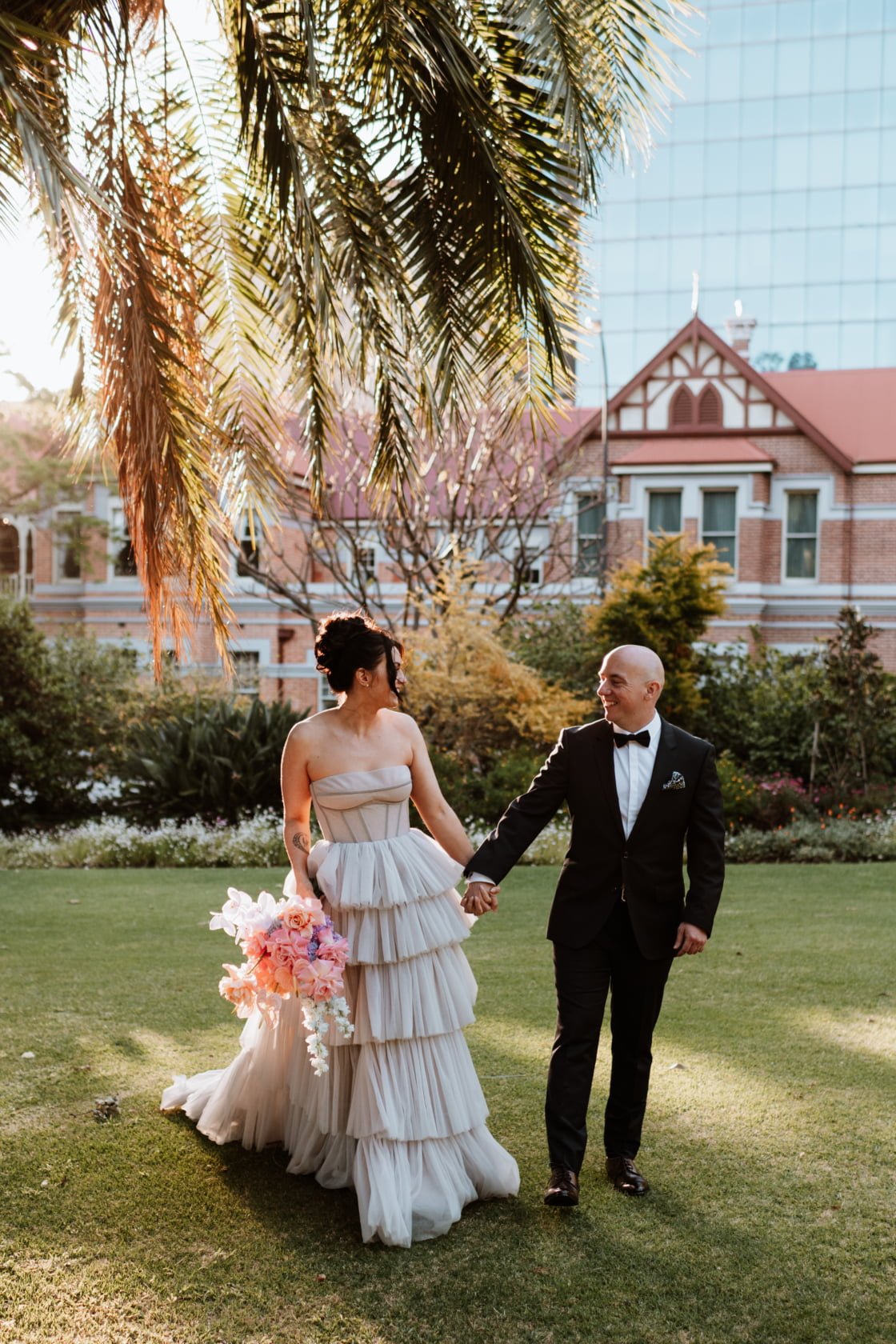 CONTRIBUTING VENDORS Photographer Jillian McHugh Florist Franc Flora Stationery Mila + May Ceremony & Reception QT Perth Catering Santini Bar & Grill Cake Butterdream Baking Cake Topper Etched Wedding favours Butterdream Baking (personalised cookies) Hire Items M Event Hire Signage Etched, Parties Made Pretty Celebrant Hitched by Kate Rings Villani Jewellers (bride), James Thredgold (groom) THE BRIDE Gown Vagabond Bridal Bridal Boutique Imagine Bridal Lounge Shoes Loeffler Randall Hair Hair With Grace Makeup Alicia Clayton Makeup Artist Fragrance Byredo Rose of No Man’s Land THE GROOM Suit, Shirt, Bow Tie & Cufflinks Hugo Boss via Joseph Uzumcu