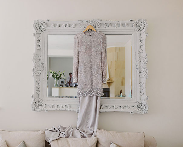 £I had to do the bridal thang walking down High Street where all the bridal dress designers were to see what all the fuss was about. To be honest, I knew it wasn’t for me and straightaway I wanted to create something different and didn’t want to wear white, explains the bride, who sought out designer Julie Goodwin Couture to help create the dress of her dreams.