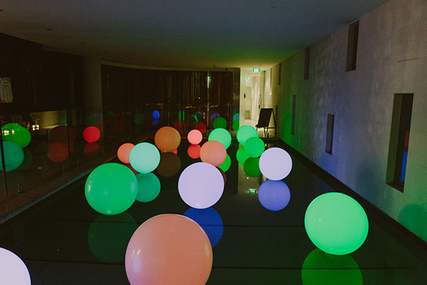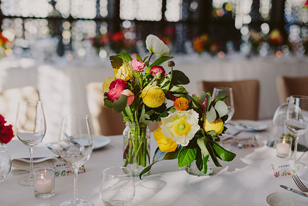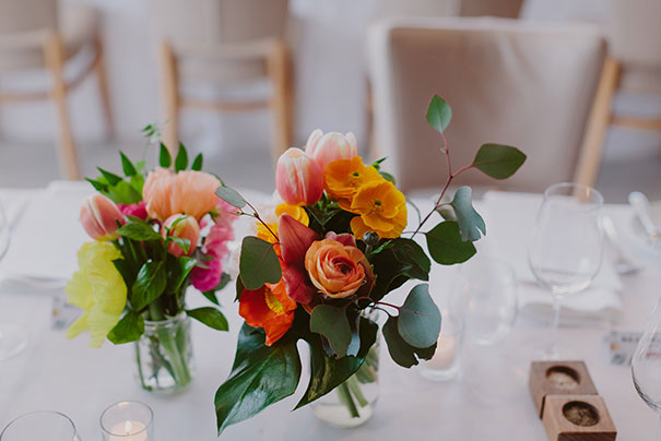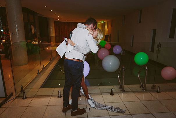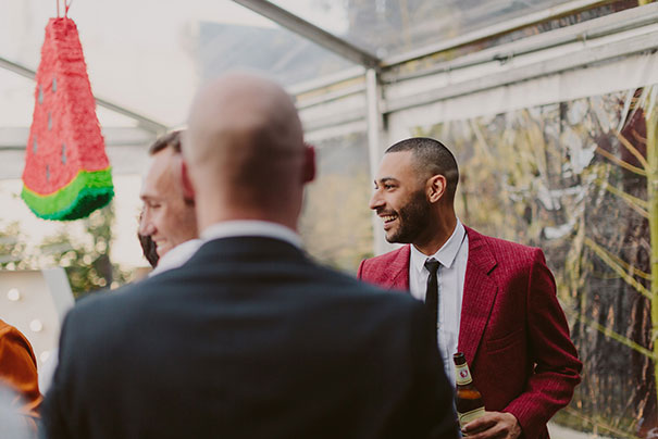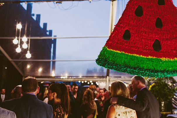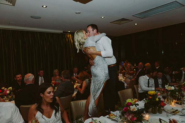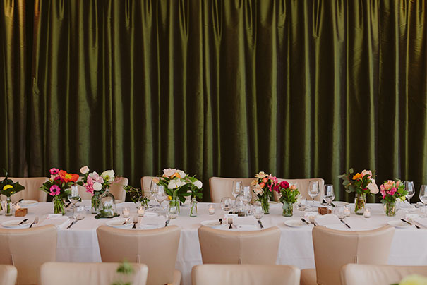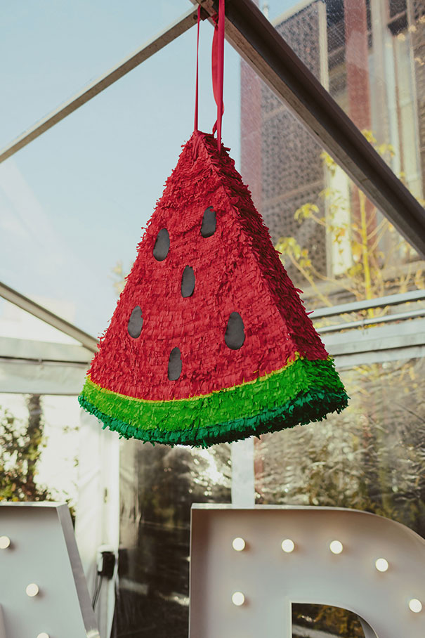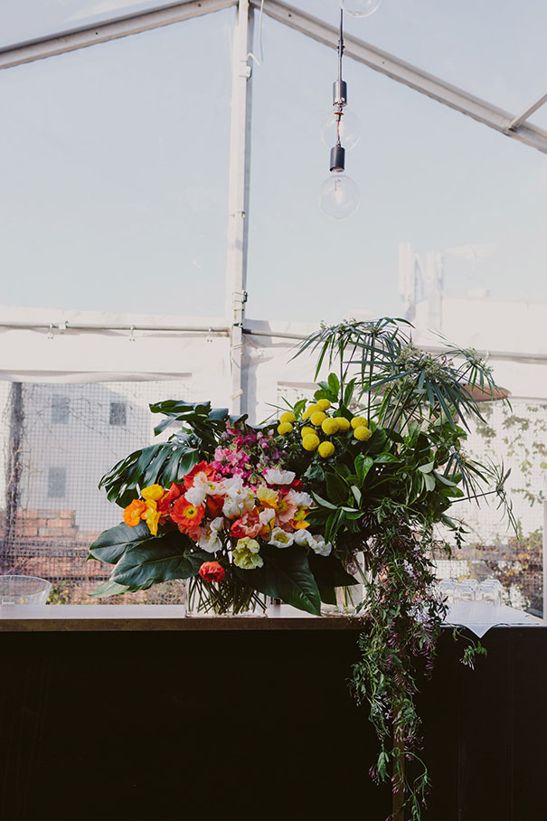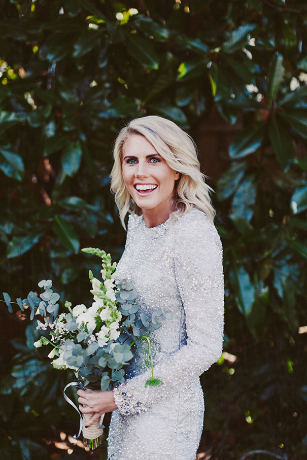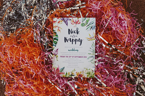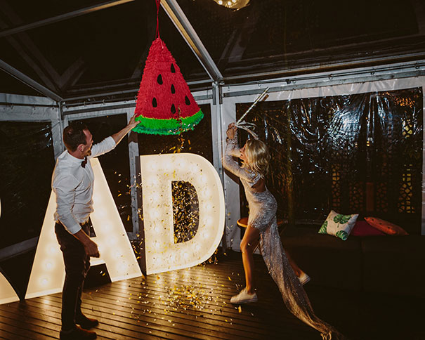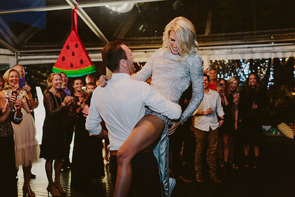 £I didn’t want to be like every other bride and Julie was amazing at understanding my vision. I had about five visits, we chose the fabrics, had them dyed and added extra bling to make it amazing, I was so in love with my dress, the bride tells us, adding that she and Nick focused on bringing a little bit of Byron to Melbourne with a rad combo of tropical blooms by Flower Jar, a piûñata and a tonne of balloons.
