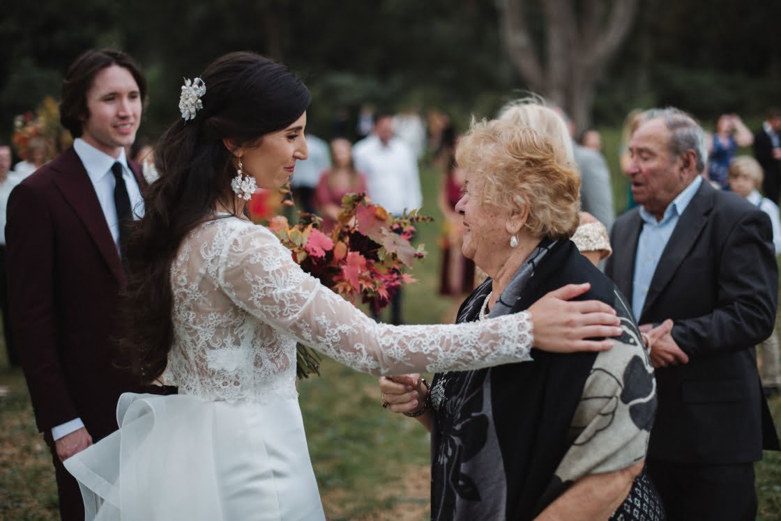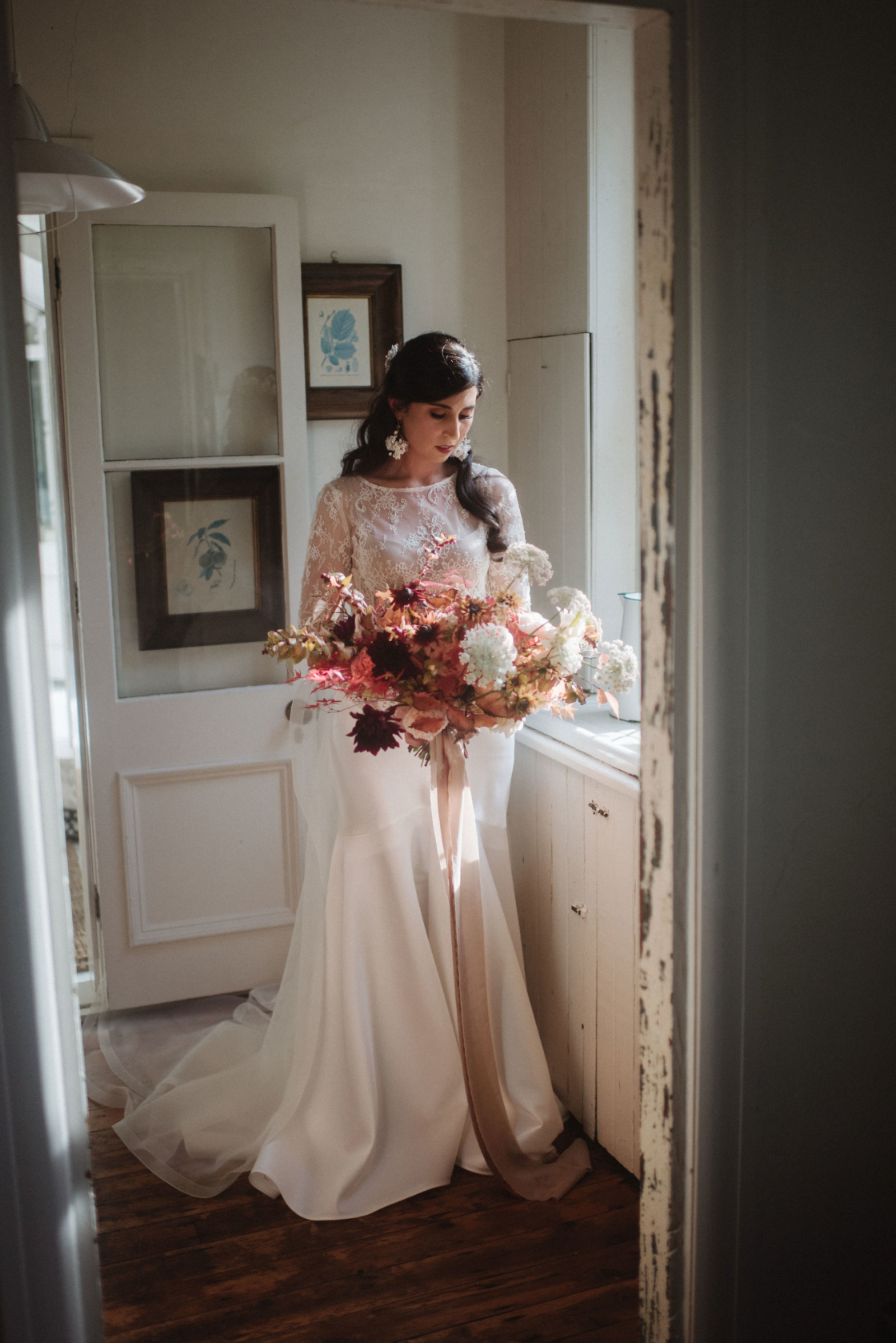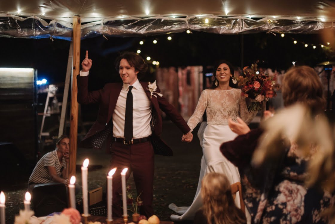 FAVOURITE DETAILS “The arch! It was a perfect representation of Autumn. Alice Beasley did the most incredible job. She went driving around for hours foraging foliage the day before and came back with a van full of branches! Our friends sang and performed and that meant the world to us. It was like a big jam night! I also loved my headpiece, it’s truly unique and romantic. I knew I didn’t want to wear a veil so it was the perfect alternative.”