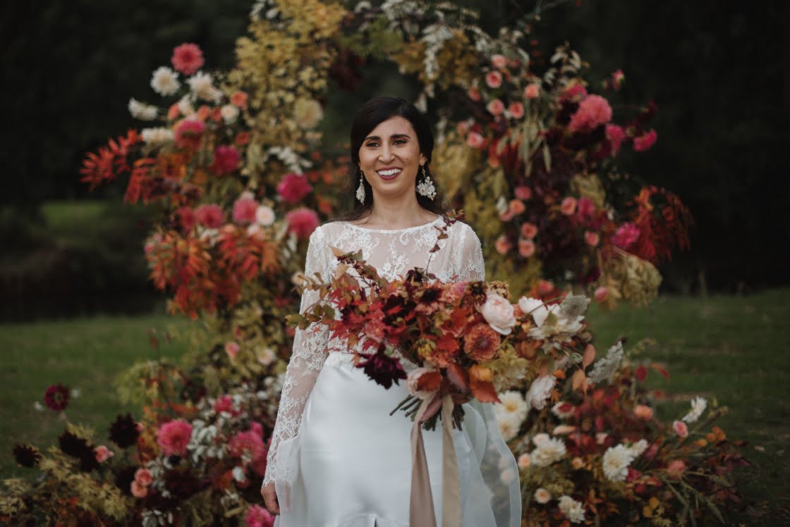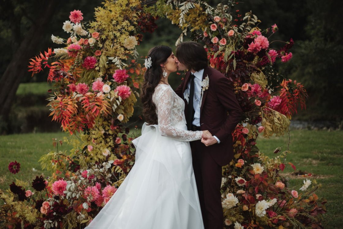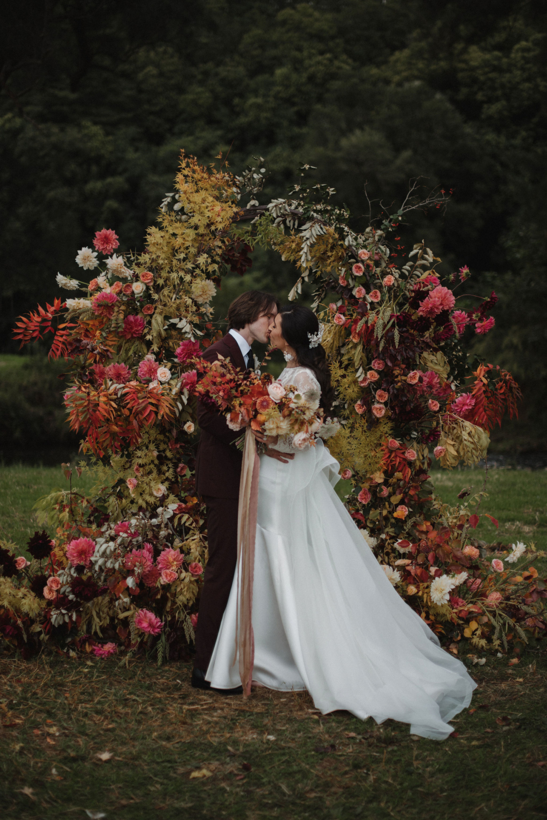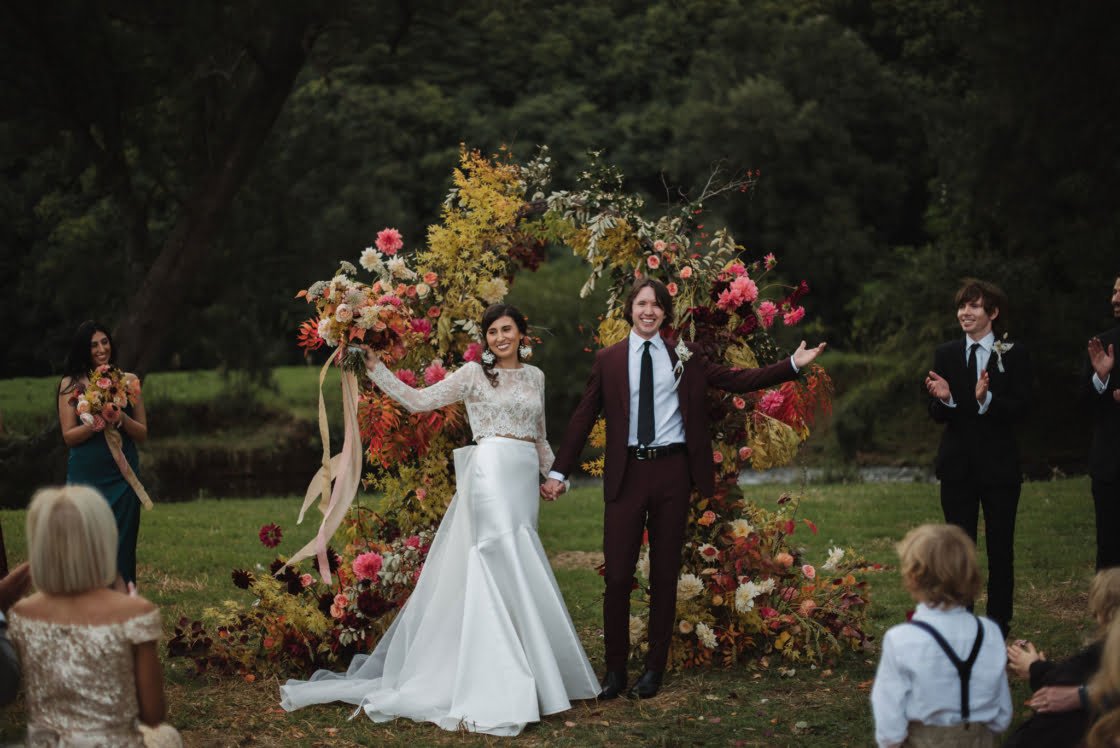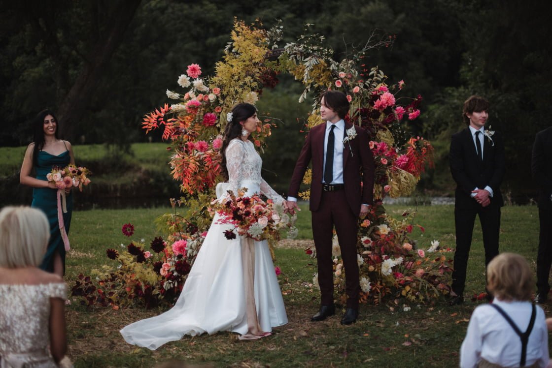 FAVOURITE DETAILS “The arch! It was a perfect representation of Autumn. Alice Beasley did the most incredible job. She went driving around for hours foraging foliage the day before and came back with a van full of branches! Our friends sang and performed and that meant the world to us. It was like a big jam night! I also loved my headpiece, it’s truly unique and romantic. I knew I didn’t want to wear a veil so it was the perfect alternative.”