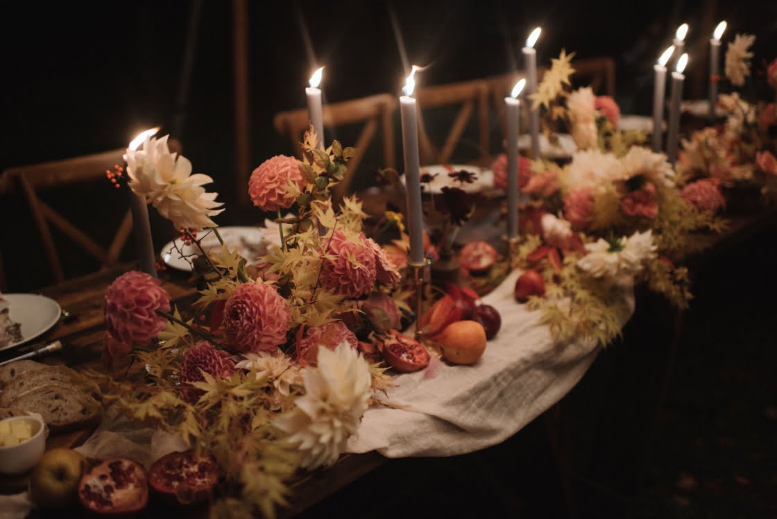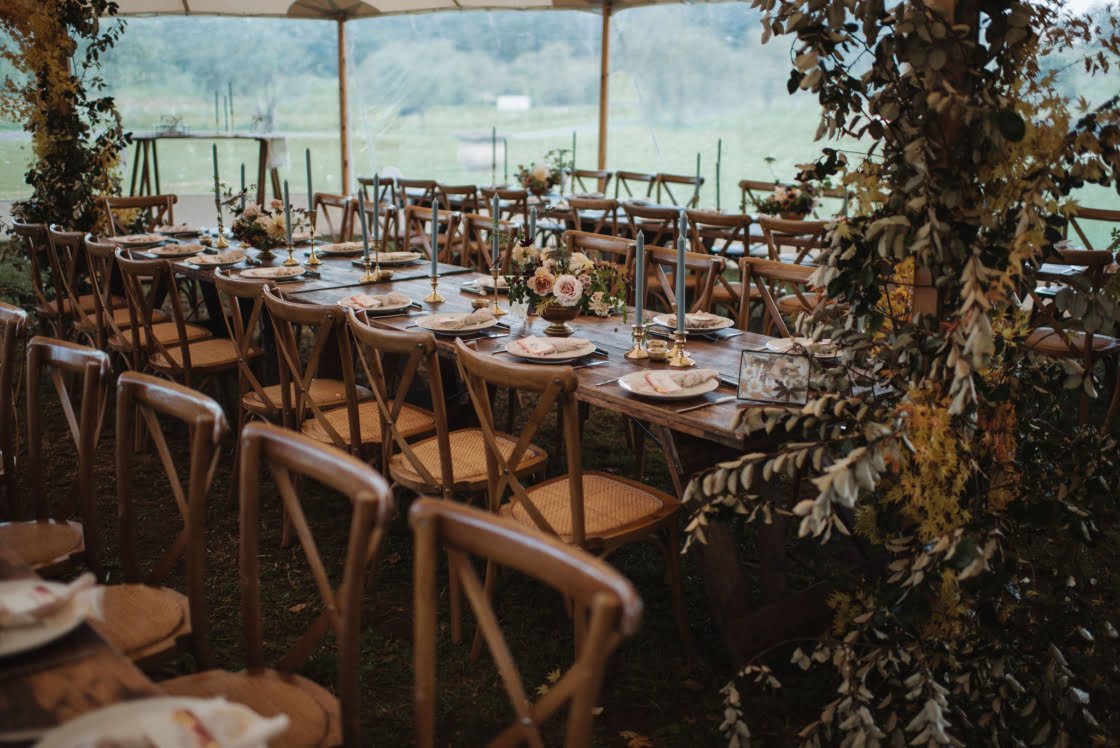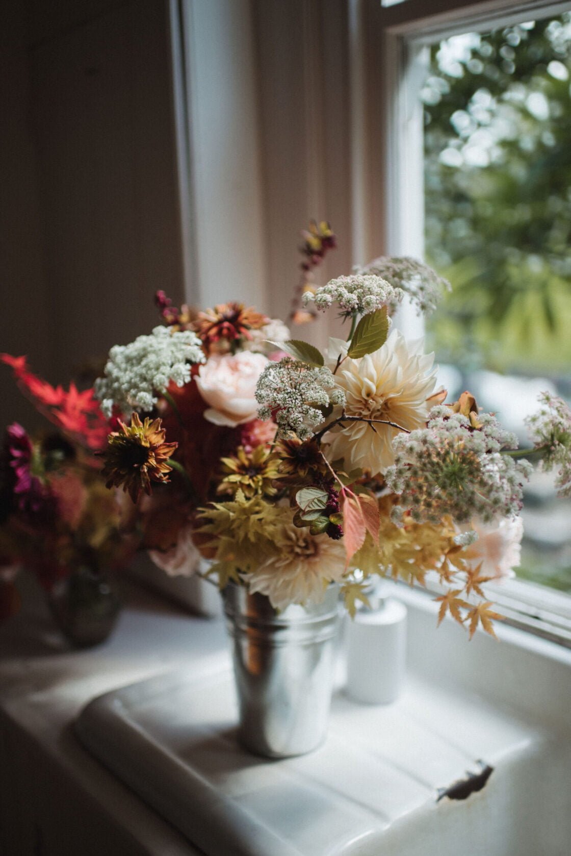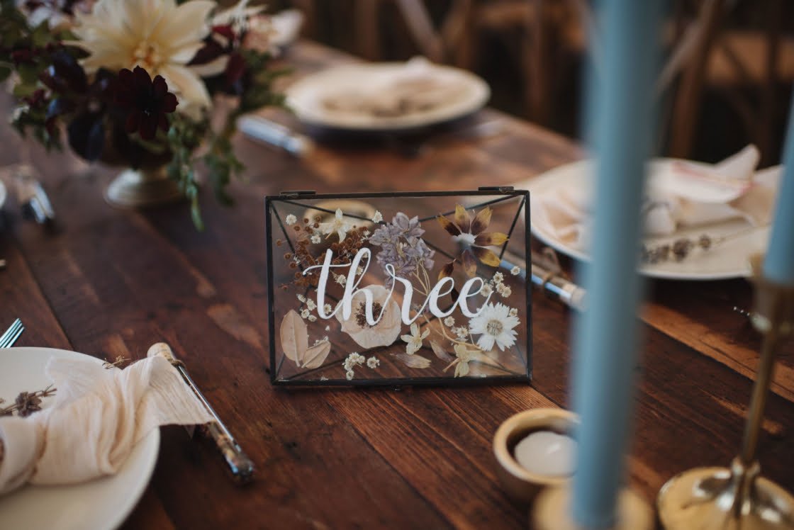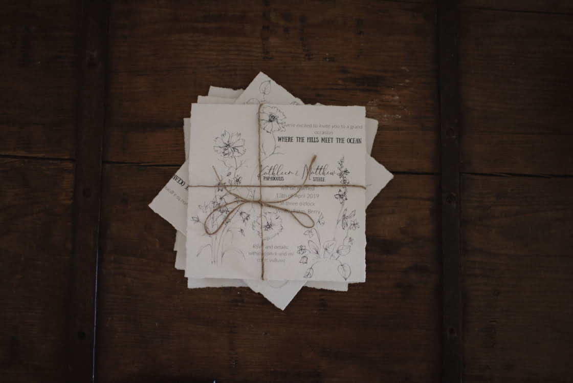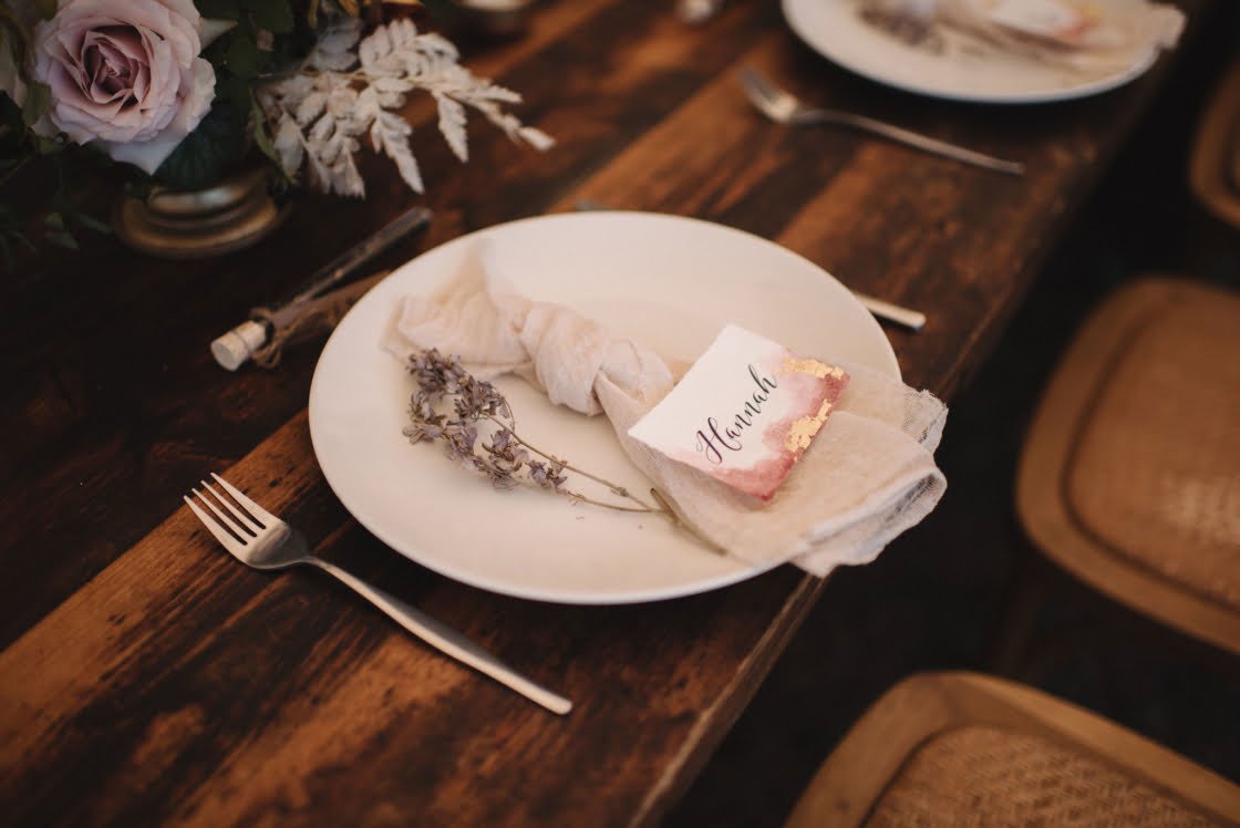 DIY “I sketched flowers growing in our garden for our invitations, then designed, printed and deckled each one on cotton paper. The flower we waxed onto the back were ones I had grown and pressed as well. For the place cards, we found a font we liked on Canva and printed them on cotton paper. The table number signs were pressed flower frames that I made from my grown flowers. I plant-dyed the napkins and some table runners with plants I grew as well! I made the boys boutonnieres with all dried flora and creating the table arrangements at Willow Farm the day before felt so wonderful. Our wedding was foam-free so the next day I gathered the van load of flowers and branches from the arch and table arrangements and composted them.”