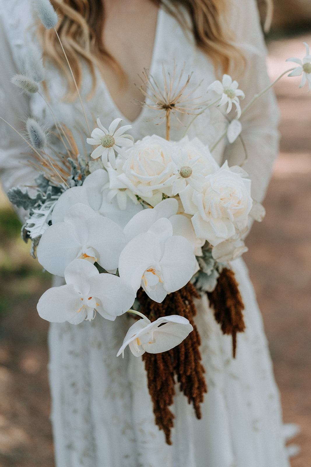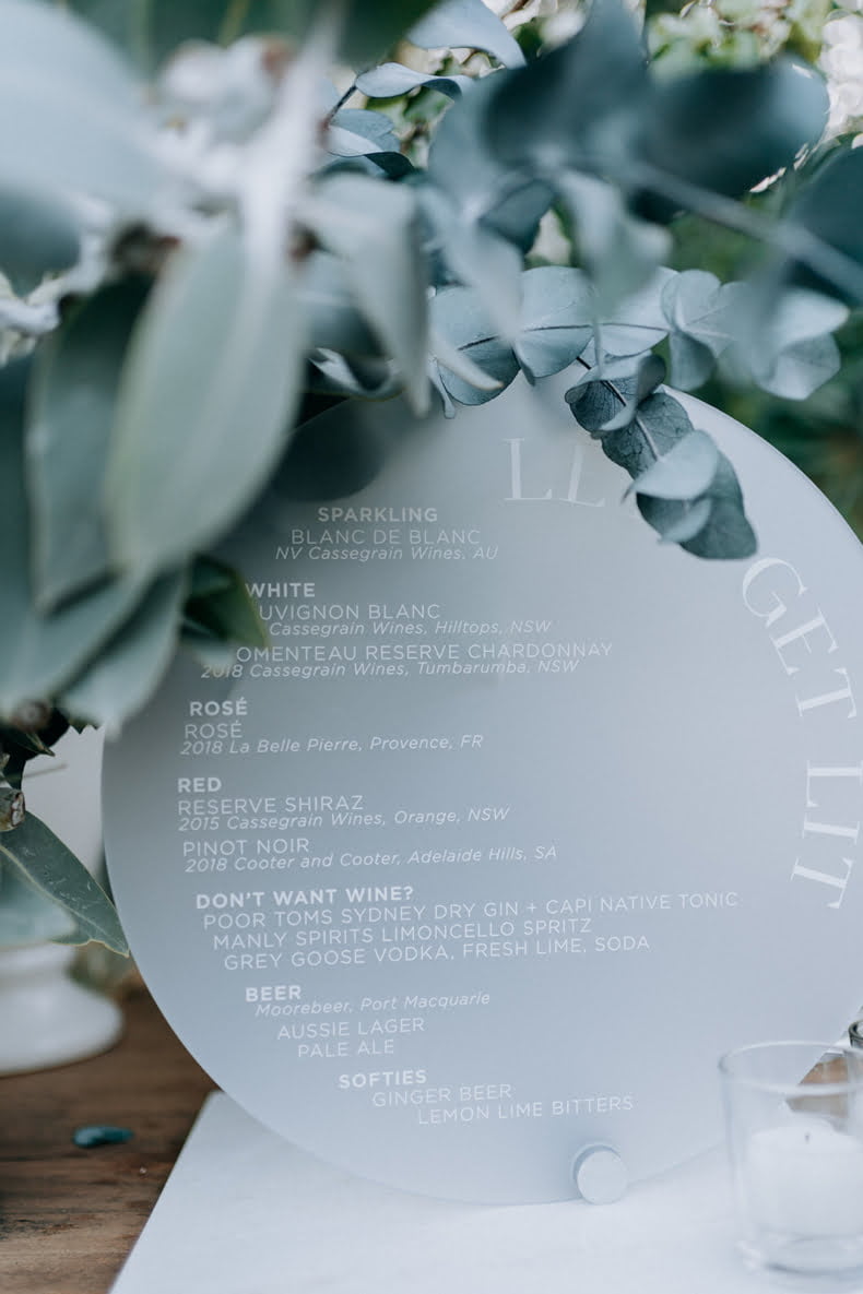 FAVOURITE DETAILS “I loooved my bridal bouquet, it featured an orchid which is my fave, heaps of texture and movement, in fact, just all the flowers. The ceremony blooms were moved to the reception space afterwards and they created the most amazing feature lounge area. I knew as soon as we got engaged that I wanted to use Rach [Botanica Bird], she never disappoints. I also loved the bar menu from Rebel Reflect that read ‘Let’s Get Lit’. It really set the vibe for the evening. We had The Wilderness Chef cook in the open plan kitchen. The guests loved that they could interact with the chefs and see them cooking.”