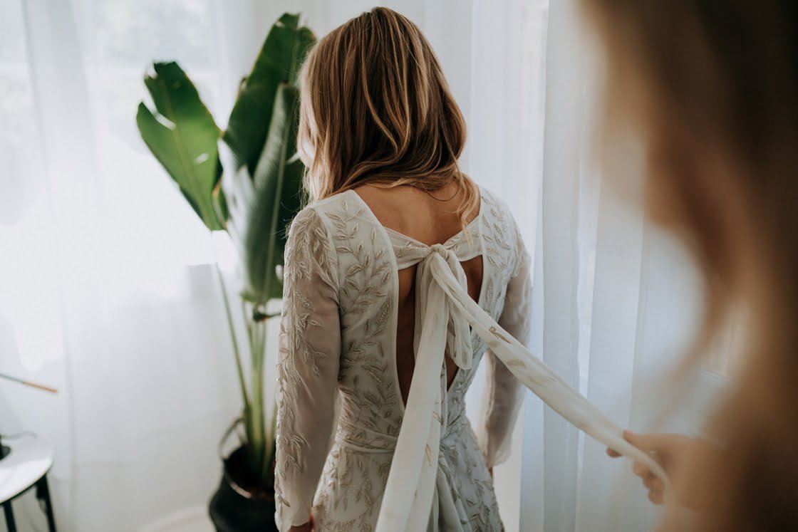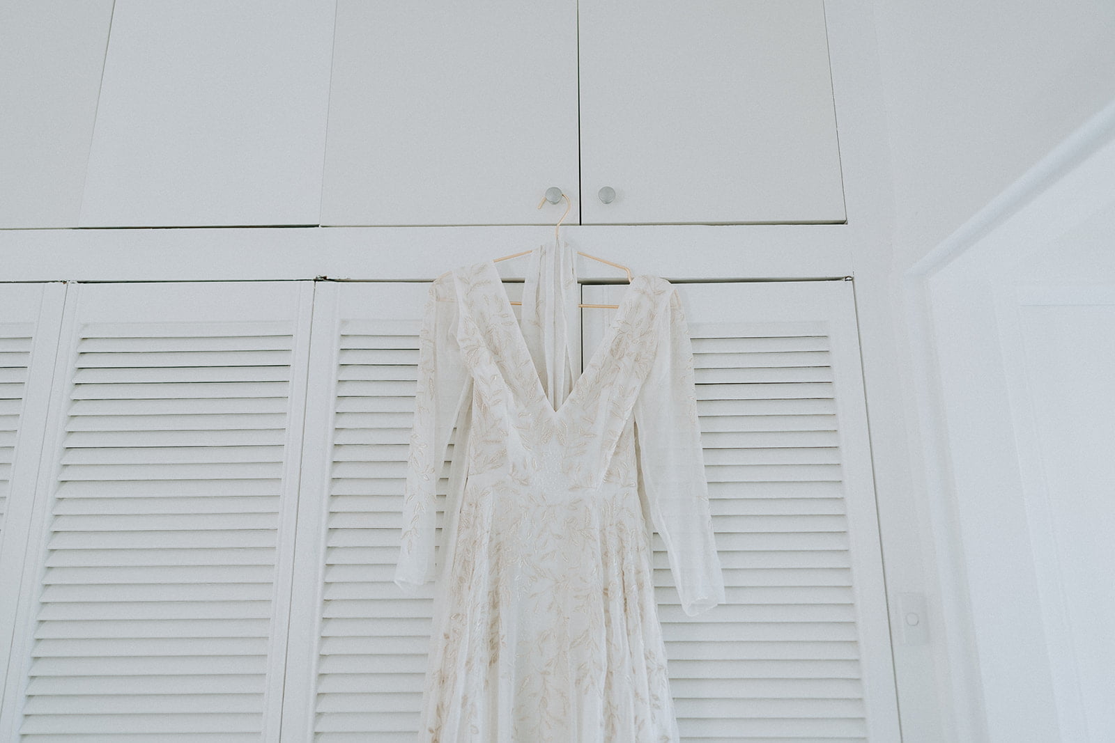THE DRESS “Every detail in our wedding had meaning to us and that included where I got my dress from. I had admired L’eto Bridal for ages and Anya’s studio is actually located in the town that I first lived in when I moved to Sydney, so she was at the top of my list. I looked at two other Sydney designers but I had a vision of sheer long sleeves and a feature back. When I tried on my dress it ticked all the boxes. Anya was amazing and she customised the fabric for me so it was ivory with silver embroidery. I also chopped the train off and opted for no veil, I loved the back too much to cover it.”