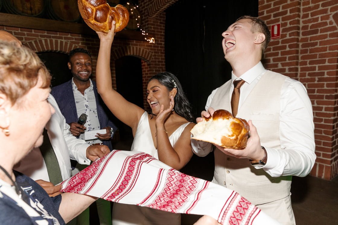 TALK ABOUT TRADITION “Igor is Ukrainian and so his family incorporated a few wedding traditions into the reception. First, bread breaking – Igor and I had to pull apart a loaf of traditional handmade Ukrainian bread. The person who pulled the biggest piece was to then be the ‘boss of the relationship.’ It broke straight down the middle. Then we had to take our first step together onto a marital mat. The first person to make contact with the mat is then the ‘boss of the relationship.’ We stepped on at the exact same time. The last one was the smashing of the glass. Wine was poured into a glass which we had to scull, throw the rest over our left shoulder, and then smash the glass into as many pieces as possible. The more pieces there were, the healthier and longer-lasting the relationship is meant to be. I obliterated my glass and cut myself in the process. Oops.”
