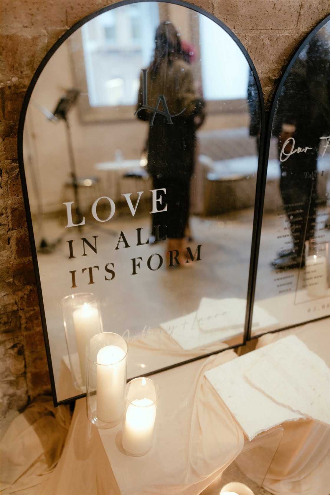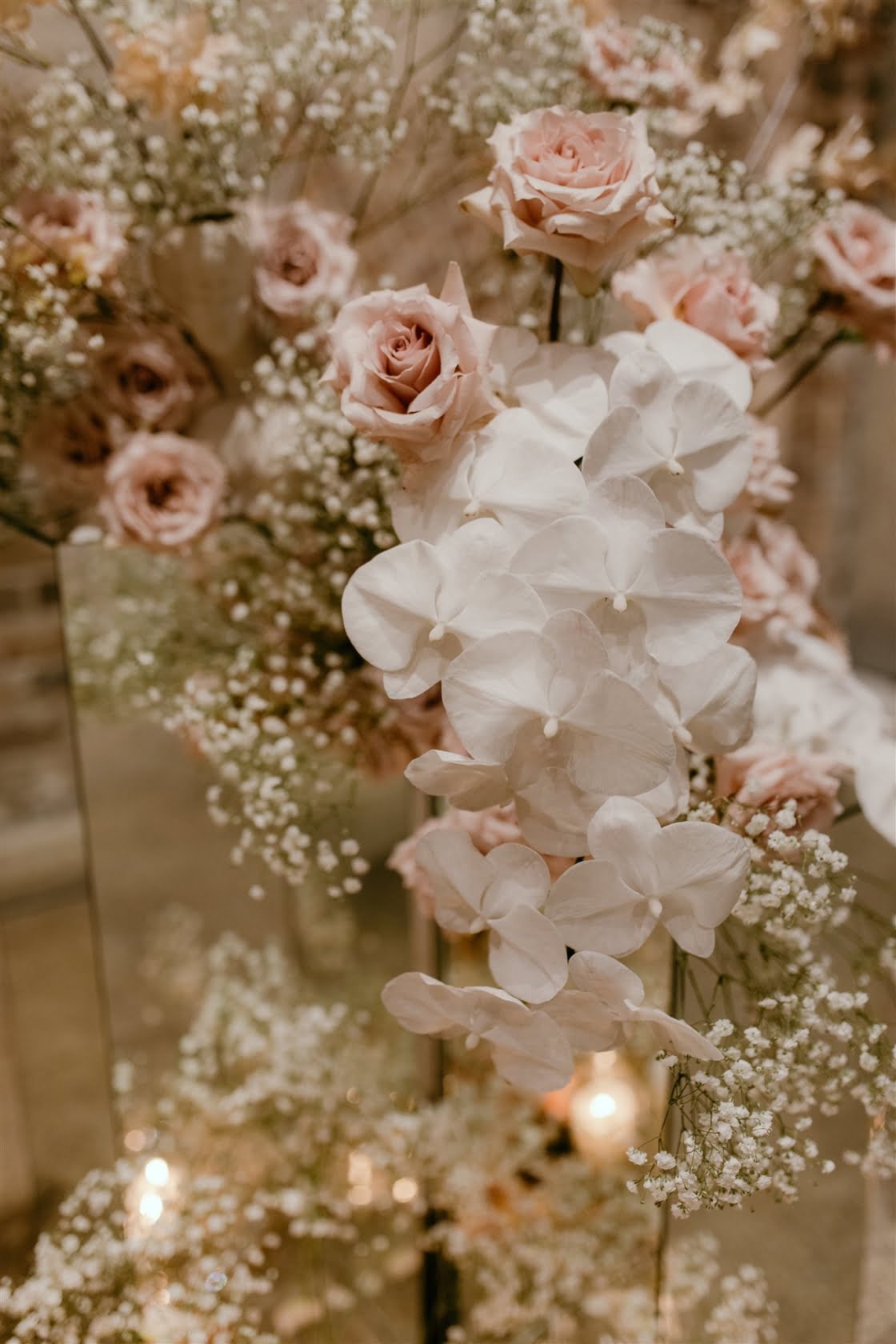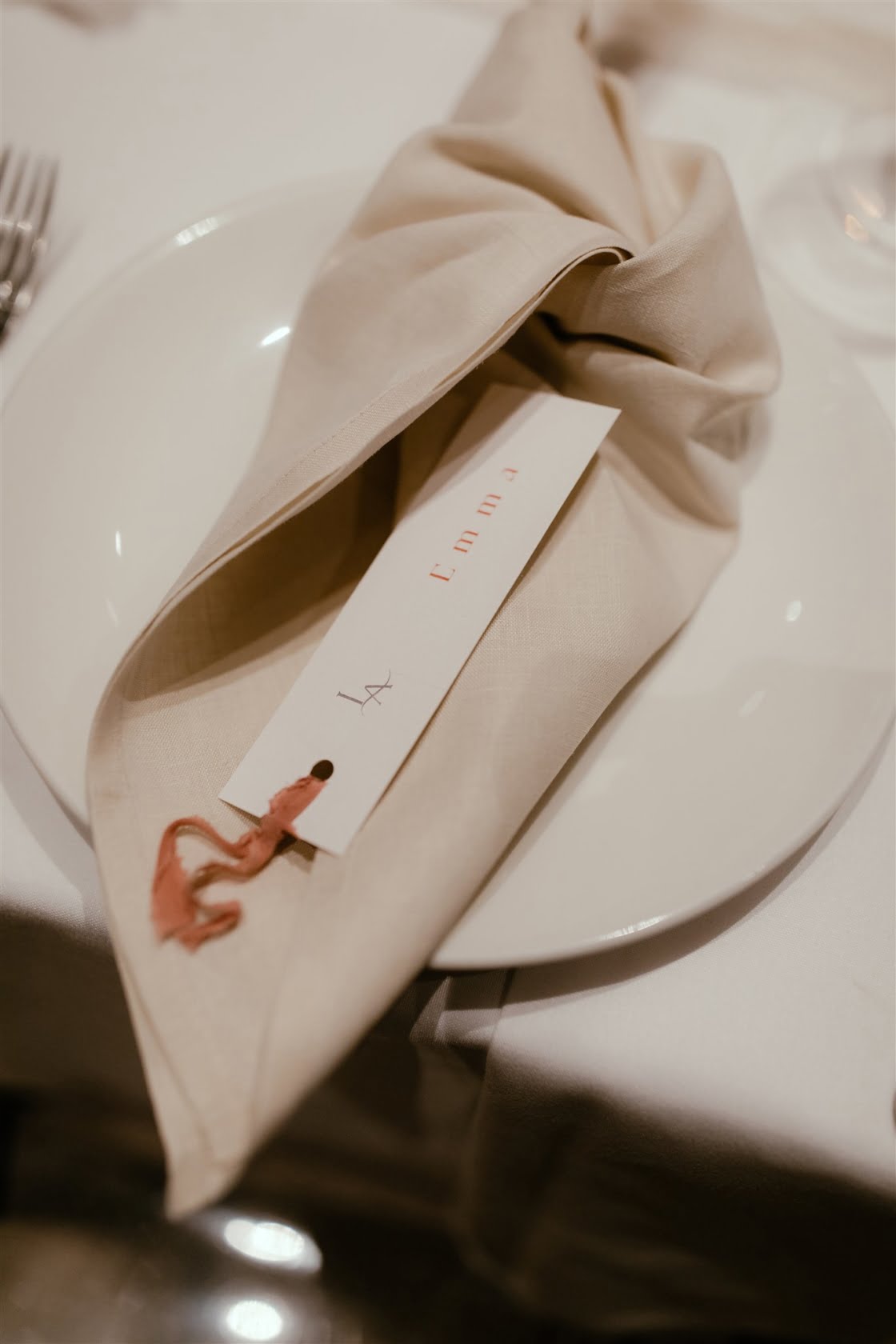 FAVE DETAILS “All of our styling and florals were provided by Lilac at Upside Down Events. She nailed our theme, which was a soft nude palette, and the use of candles, mirrors and linen created a feeling of romantic ambience.”