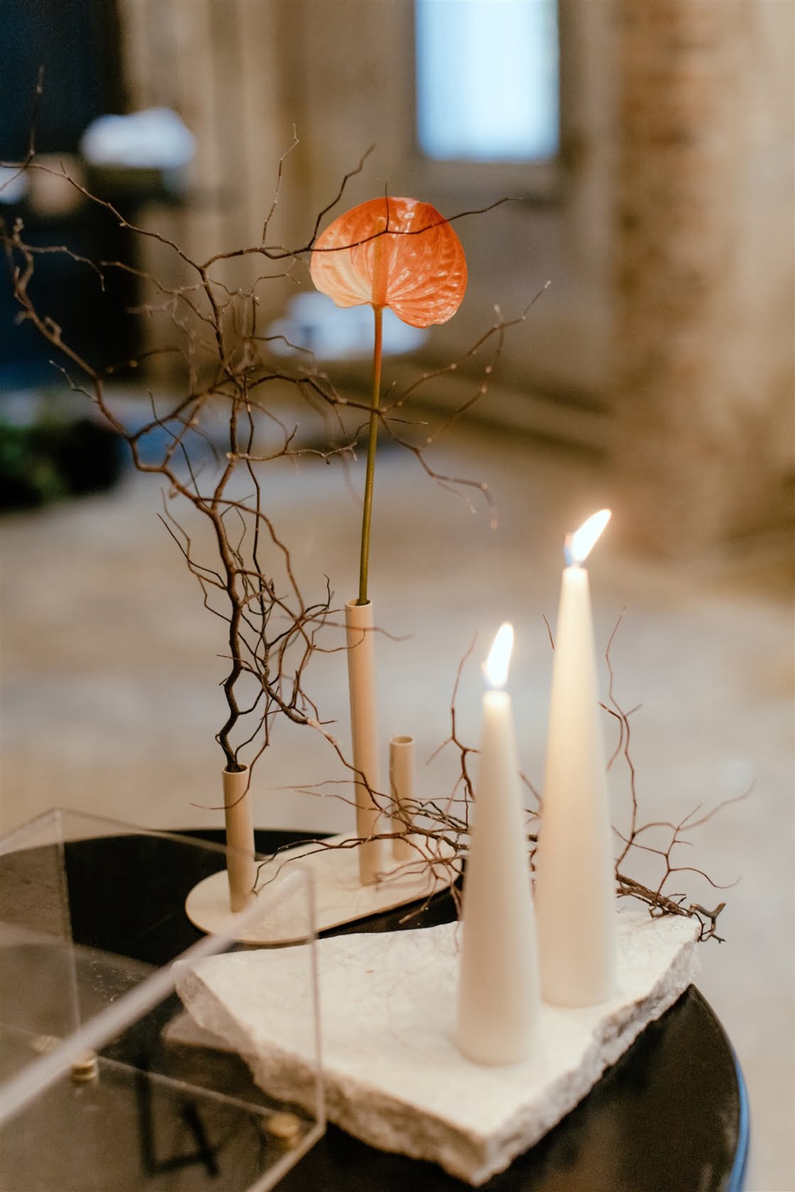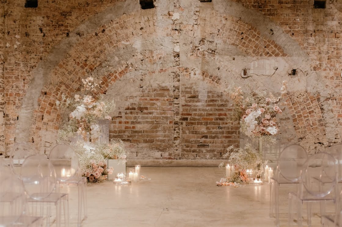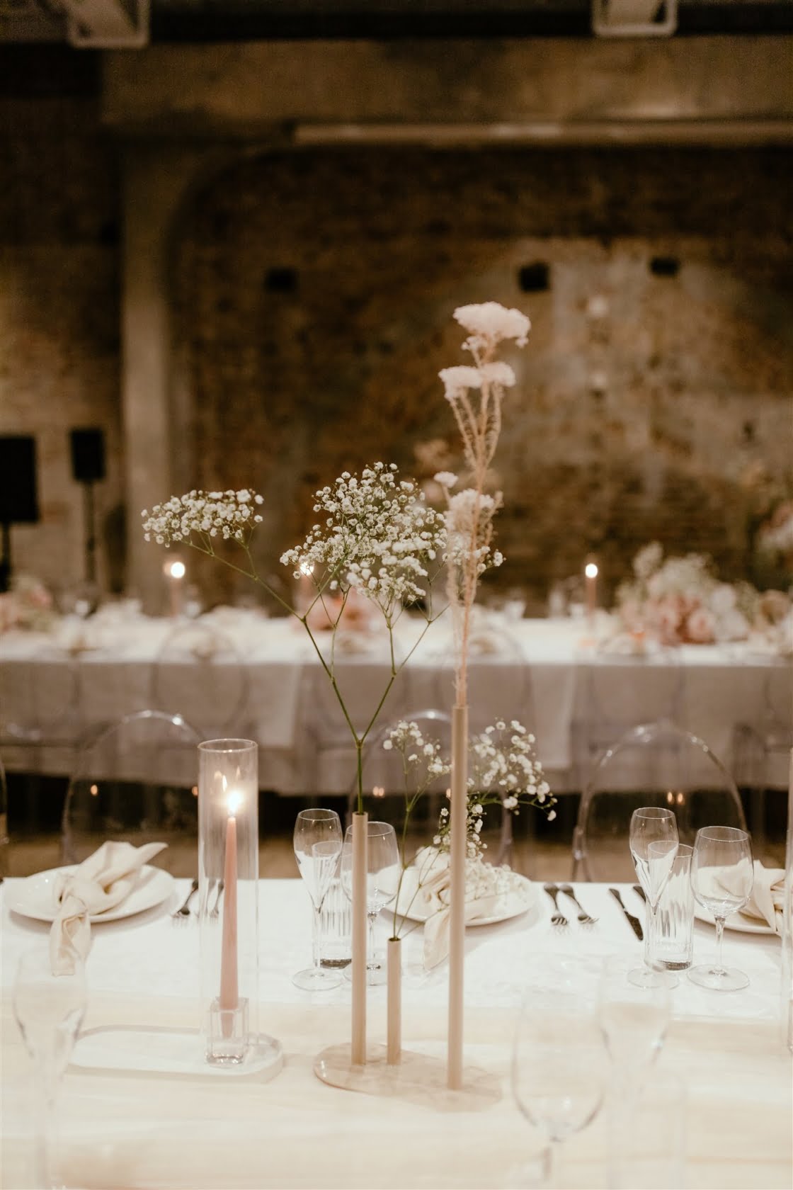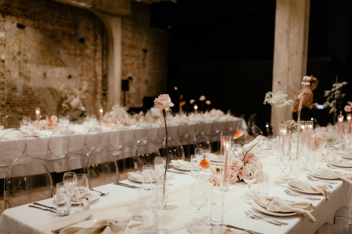 FAVE DETAILS “All of our styling and florals were provided by Lilac at Upside Down Events. She nailed our theme, which was a soft nude palette, and the use of candles, mirrors and linen created a feeling of romantic ambience.”