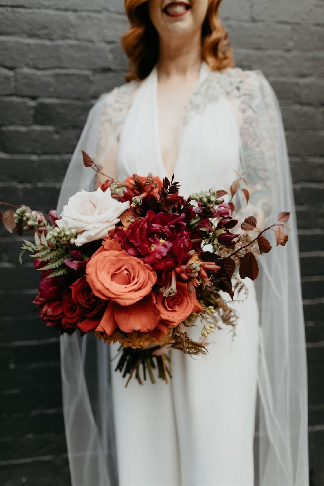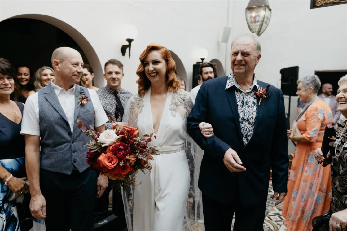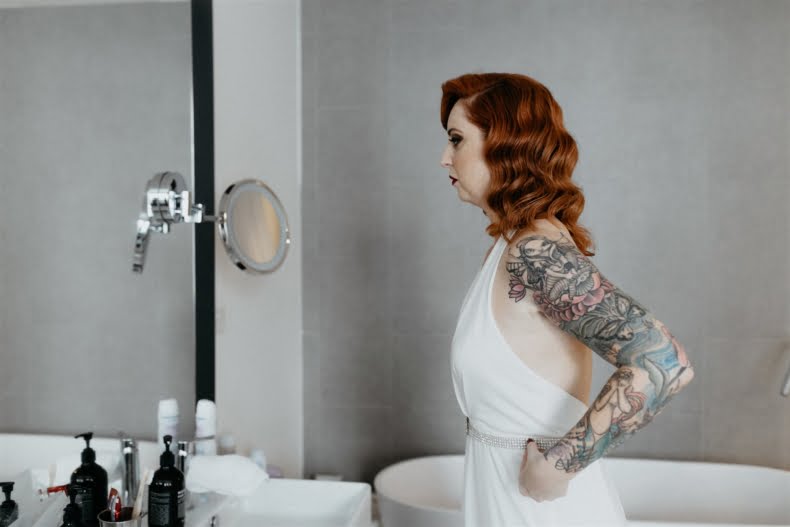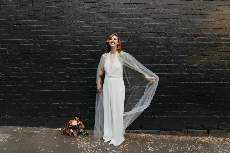 THE JUMPSUIT “I [Alli] saw my jumpsuit online about two years previous and knew from the minute I saw it, it was what I wanted. I ordered it and it fit like a glove, job done. Still, to this moment, I believe it was the perfect choice for me and I felt so comfortable in it. I added some antique rhinestone jewellery to elevate it. At the last minute, I felt I needed something a little “extra” so reached out to my friend Amy who is a fashion designer and she suggested a cape. Immediately, I knew it would make me feel like Wonderwoman, so her and her gorgeous Mum, who also works in bridalwear, took me shopping for the materials. The cape was a talking point on the day!”