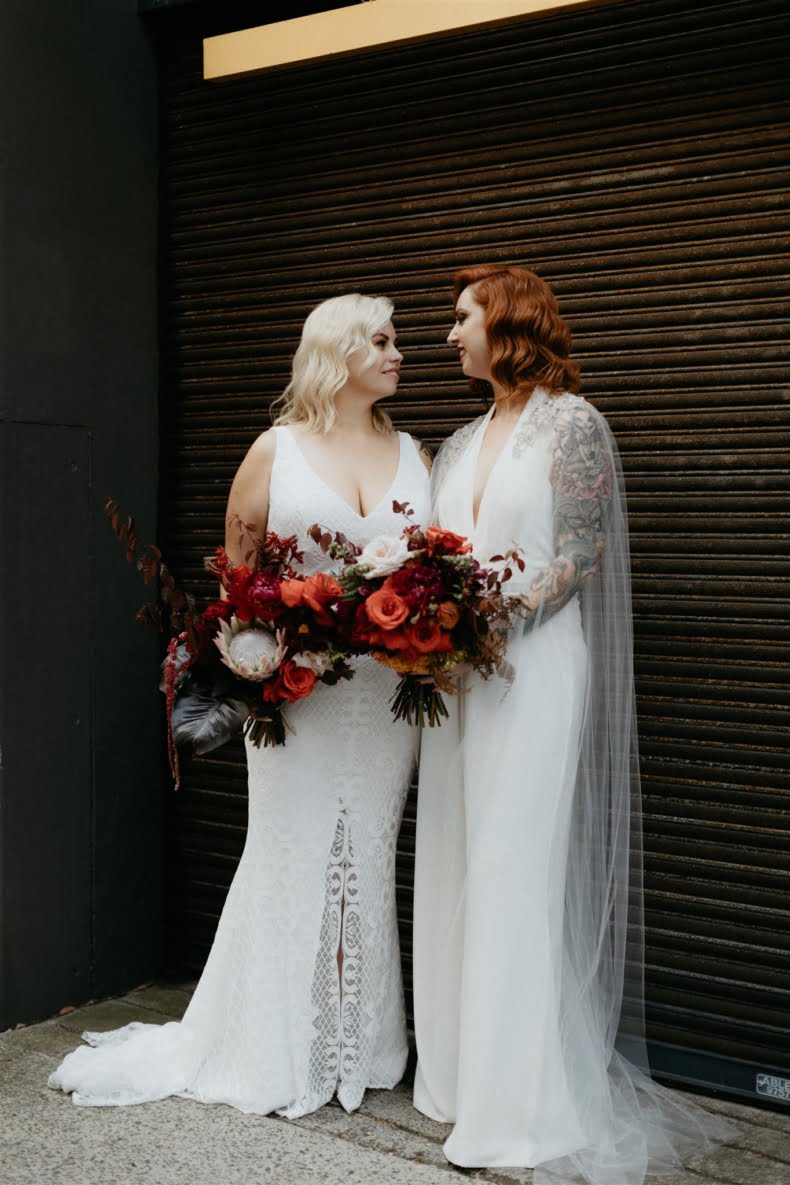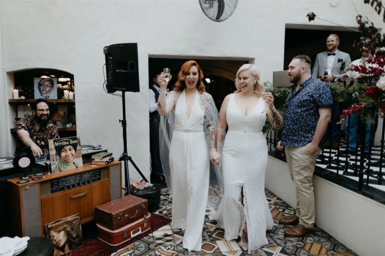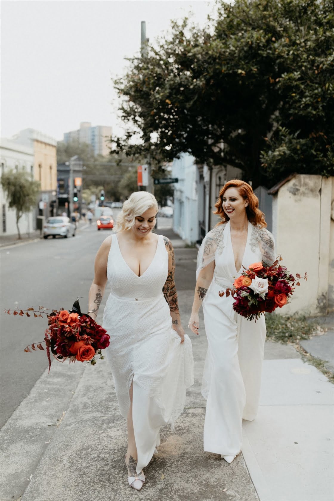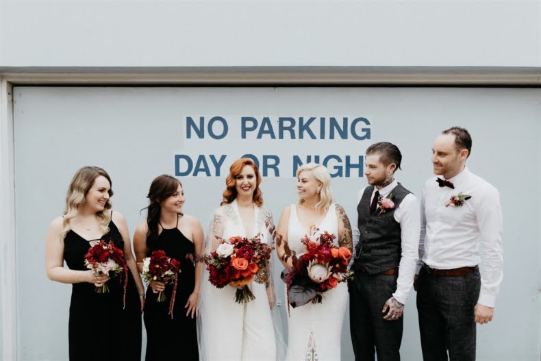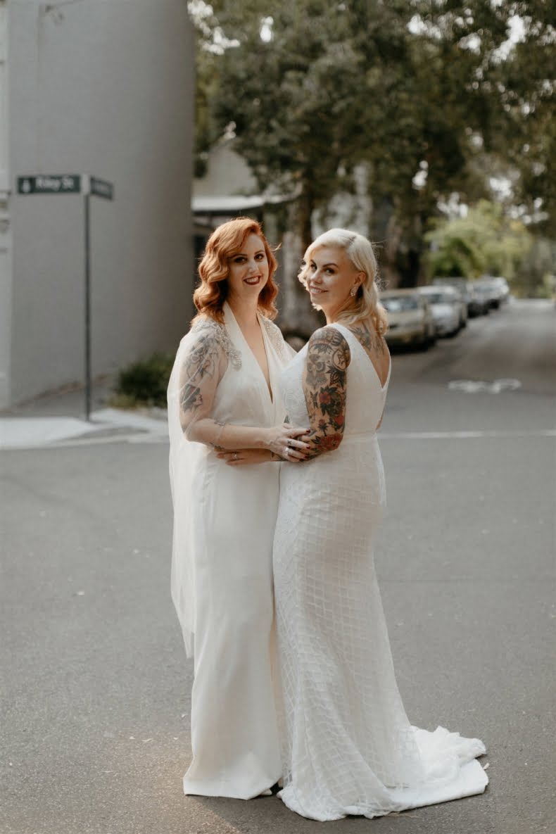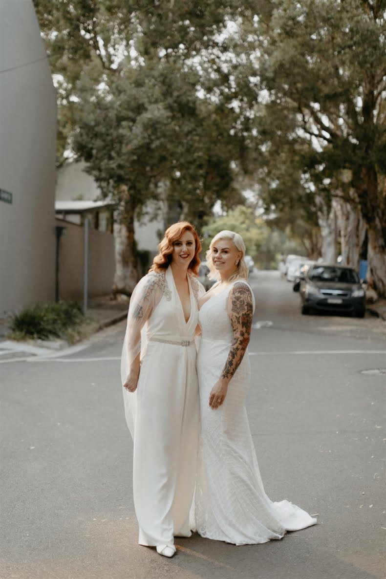 CONTRIBUTING VENDORS Photographer Robert Meredith Photography Florist Aisle Of Eden Venue & Catering Porteno Cake Rizzo’s Patisserie Desserts Nutie Donuts Wedding Favours The Rock Crystal Shop, Cave Cookies Photo Booth Undisposable Entertainment We Play Records Celebrant Barbara Dent Rings Eliise Maar (Lauren) BRIDE (Lauren) Dress Karen Willis Holmes Loungewear Glamour + Grace Bridal via Etsy Shoes Ted Baker Earrings Ella Rose Accessories Hair Missy Veyret Makeup Isabella Schimid Bridesmaid Dress Chancery BRIDE (Alli) Dress Jill Stuart Cape Amy Badikovich Loungewear Glamour + Grace Bridal via Etsy Shoes Ted Baker Belt Amore Treasure via Etsy Ring Uberkate Hair Missy Veyret Makeup Isabella Schimid Bridesmaid Jumpsuit Amelius