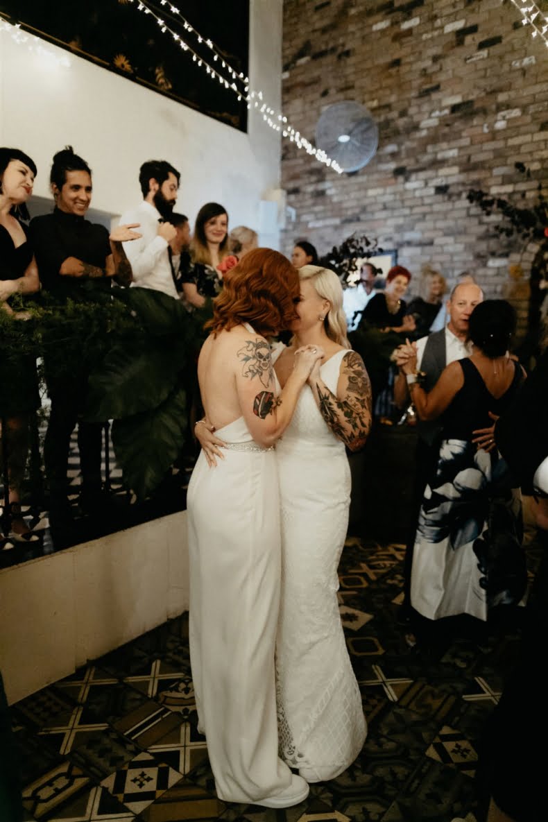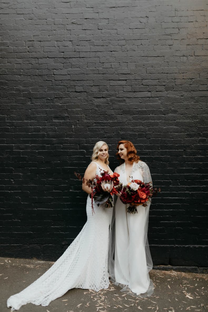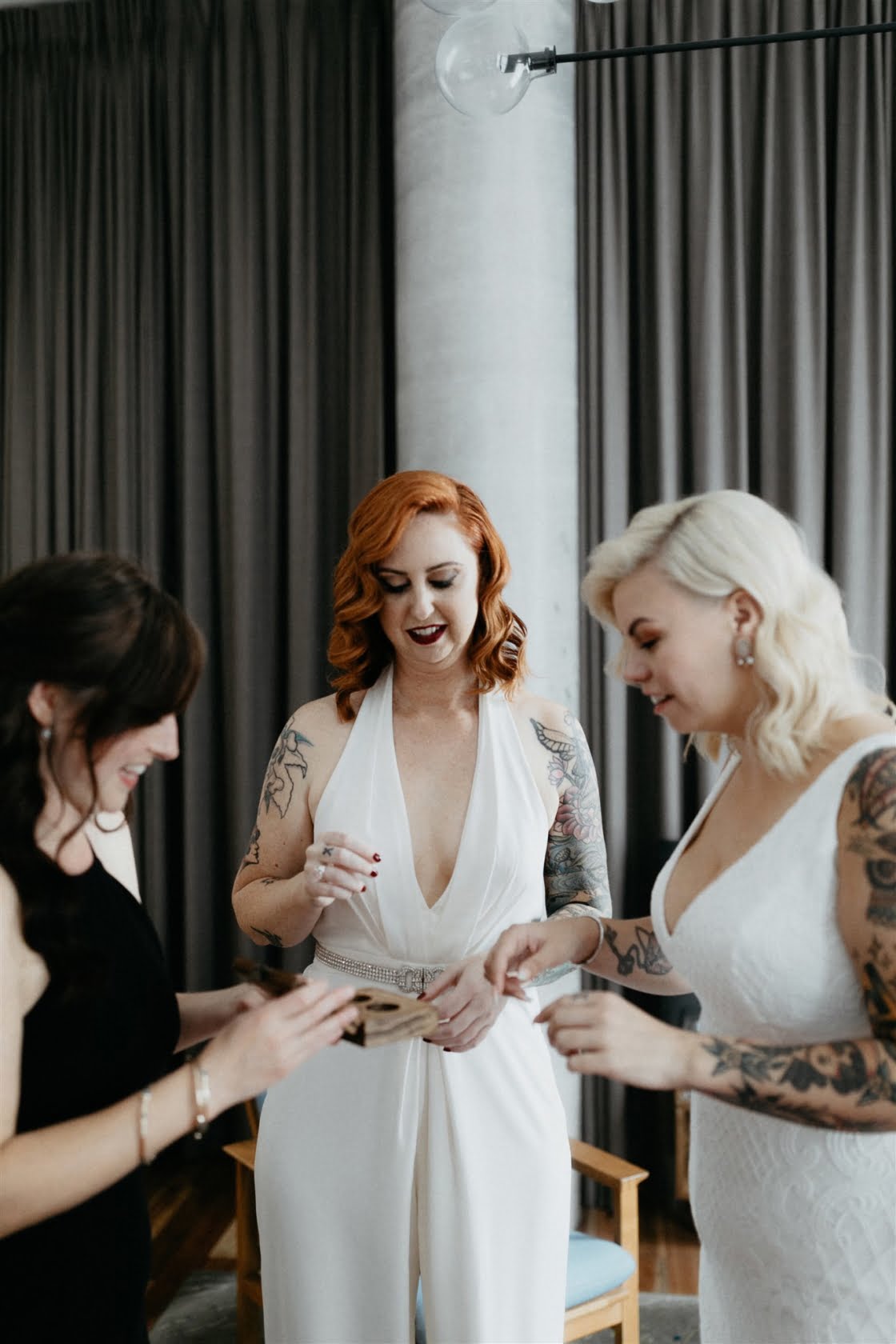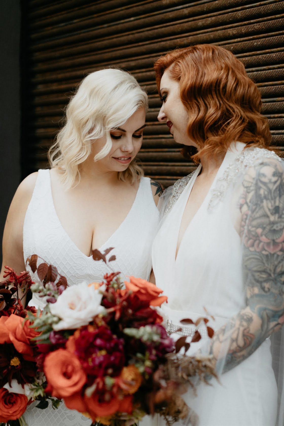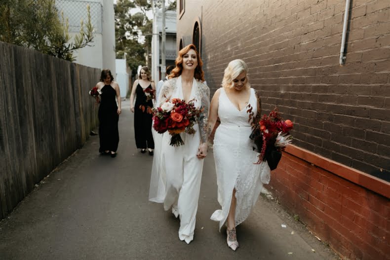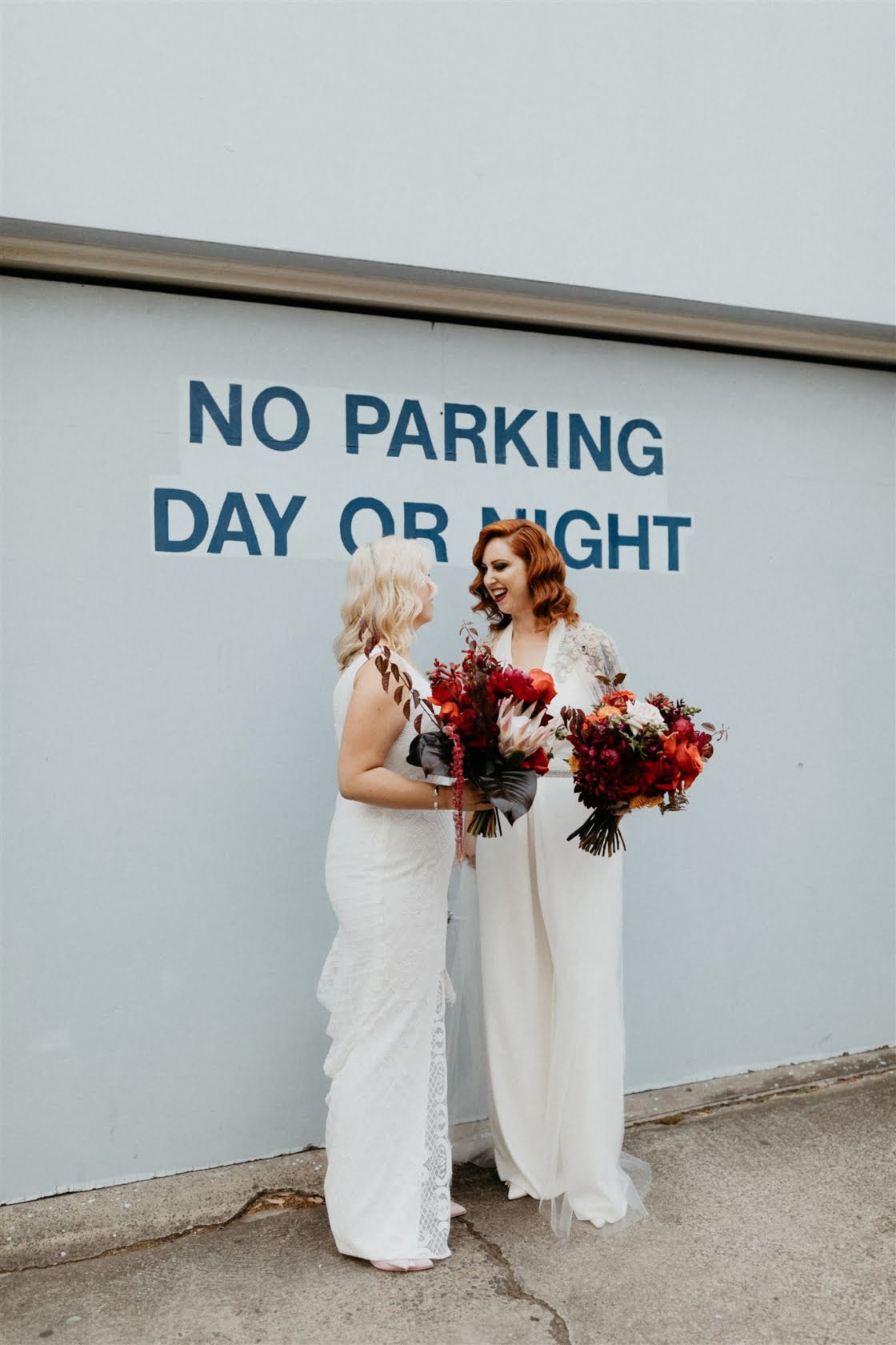 CONTRIBUTING VENDORS Photographer Robert Meredith Photography Florist Aisle Of Eden Venue & Catering Porteno Cake Rizzo’s Patisserie Desserts Nutie Donuts Wedding Favours The Rock Crystal Shop, Cave Cookies Photo Booth Undisposable Entertainment We Play Records Celebrant Barbara Dent Rings Eliise Maar (Lauren) BRIDE (Lauren) Dress Karen Willis Holmes Loungewear Glamour + Grace Bridal via Etsy Shoes Ted Baker Earrings Ella Rose Accessories Hair Missy Veyret Makeup Isabella Schimid Bridesmaid Dress Chancery BRIDE (Alli) Dress Jill Stuart Cape Amy Badikovich Loungewear Glamour + Grace Bridal via Etsy Shoes Ted Baker Belt Amore Treasure via Etsy Ring Uberkate Hair Missy Veyret Makeup Isabella Schimid Bridesmaid Jumpsuit Amelius