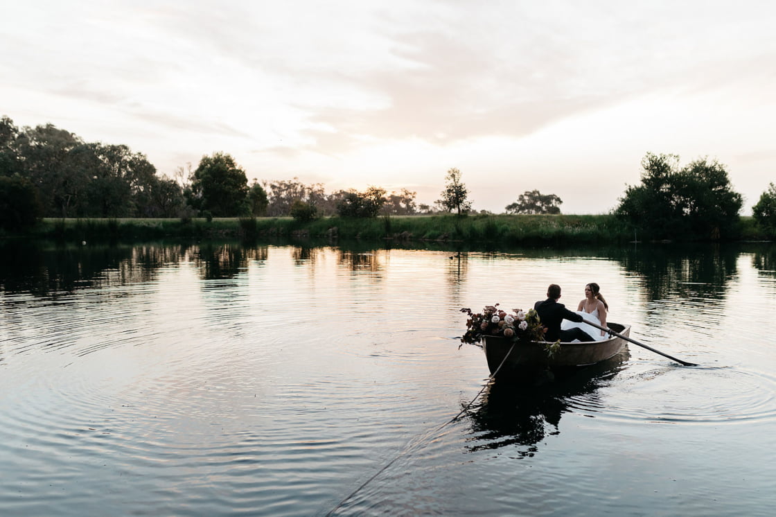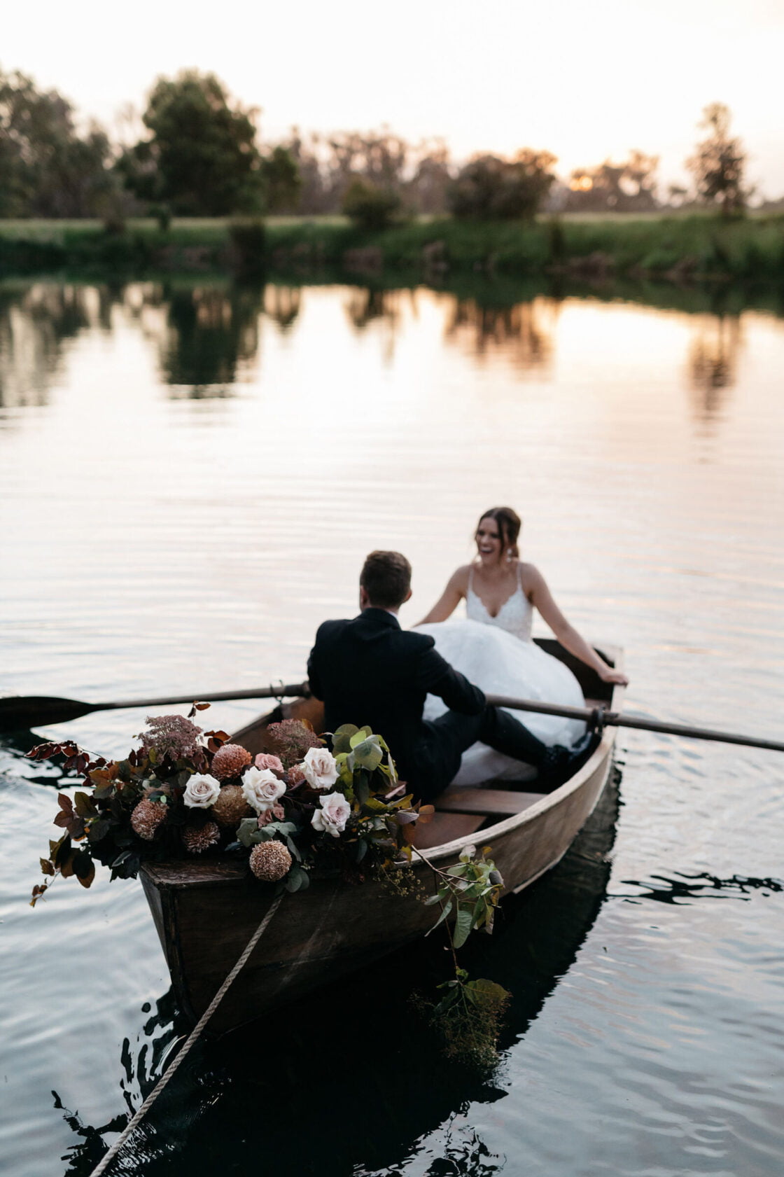 MEMORABLE MOMENT “Stepping outside just the two of us during the reception to have some photos taken. We walked out to the most incredible sunset over the gorgeous heart-shaped lake at Tanglewood. We got into a wooden rowboat decorated with flowers and rowed out to the middle of the lake. It made for some of our favourite photos, but it was also just so special to have the time out for the two of us.”